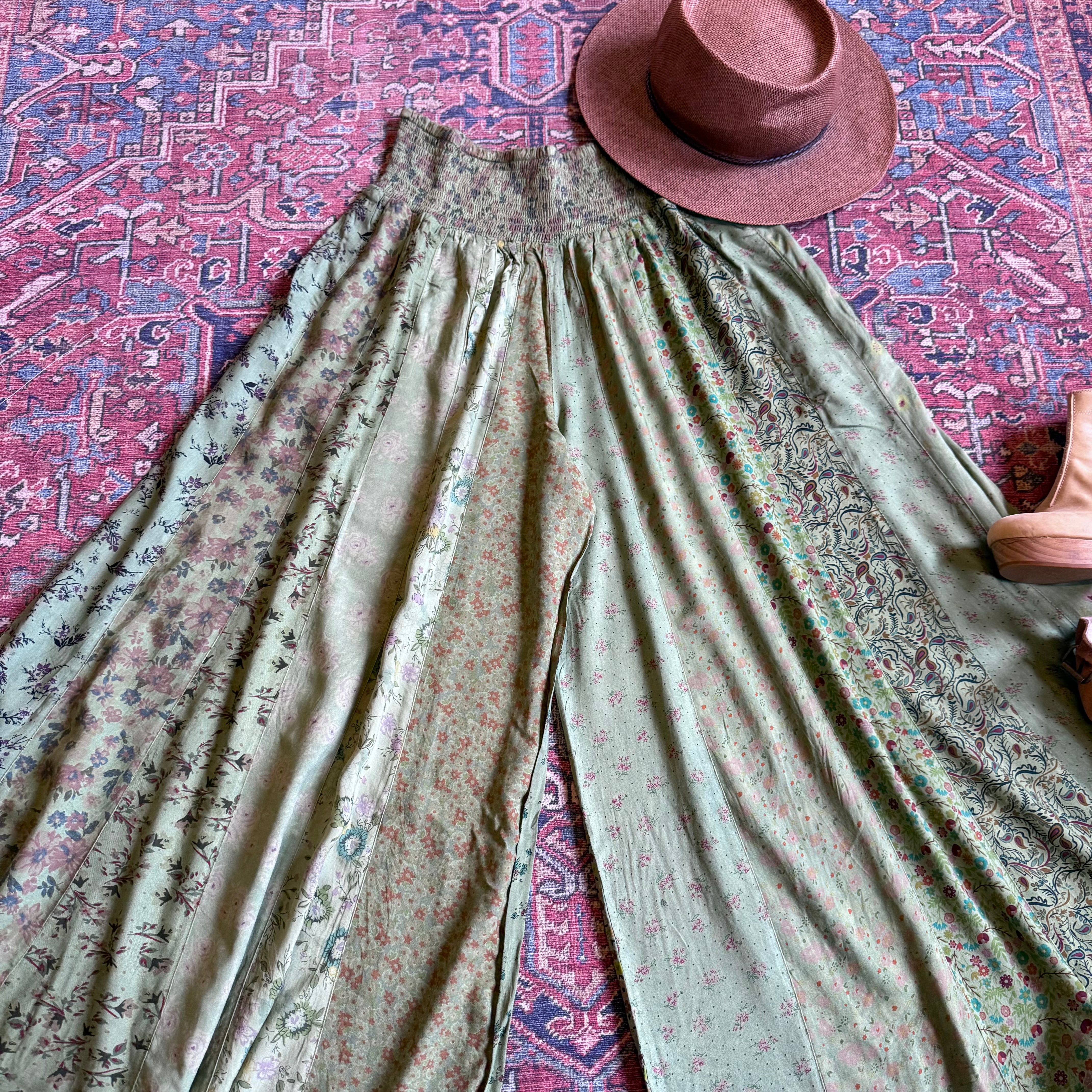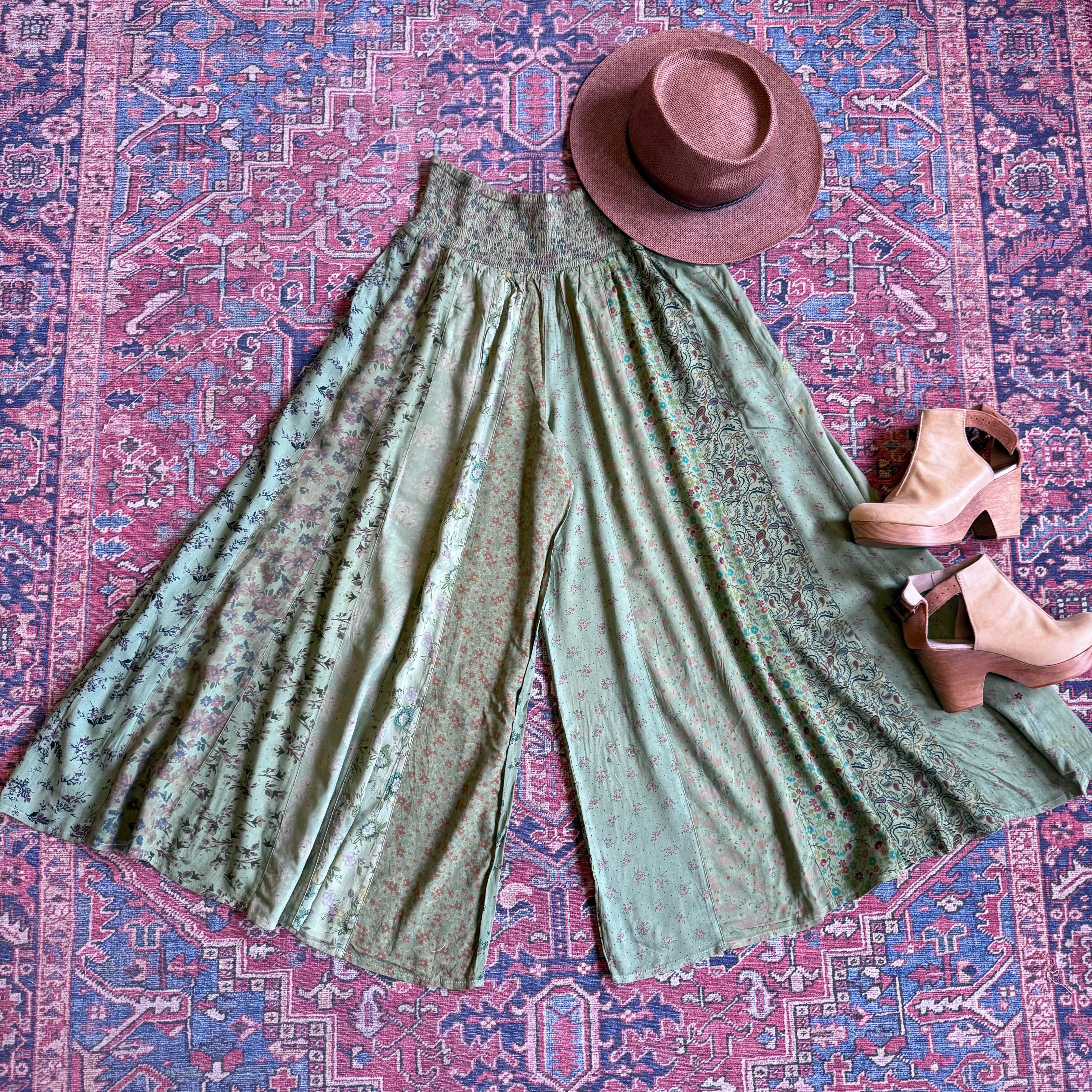 Designed for the free-spirited person, these pants exude a bohemian charm that is quintessential to any wardrobe. They effortlessly combine comfort and style, perfect for a day trip or a casual outing. Flowy rayon fabric with a comfortable ruched waistband. SECRET pocket on the pant leg!