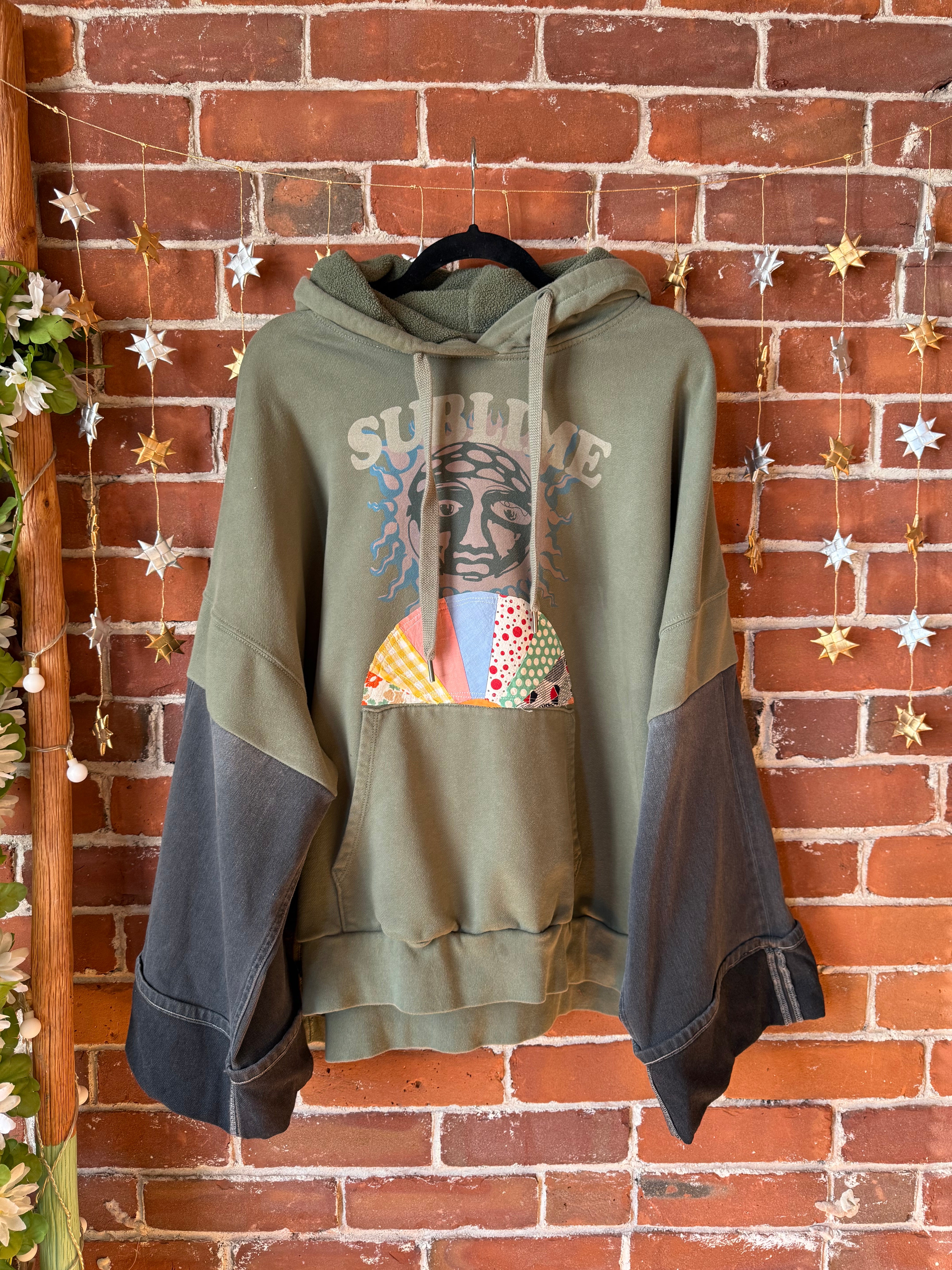 Upcycled soft hoodie sweatshirt and patchwork detail and demin cuffed sleeves