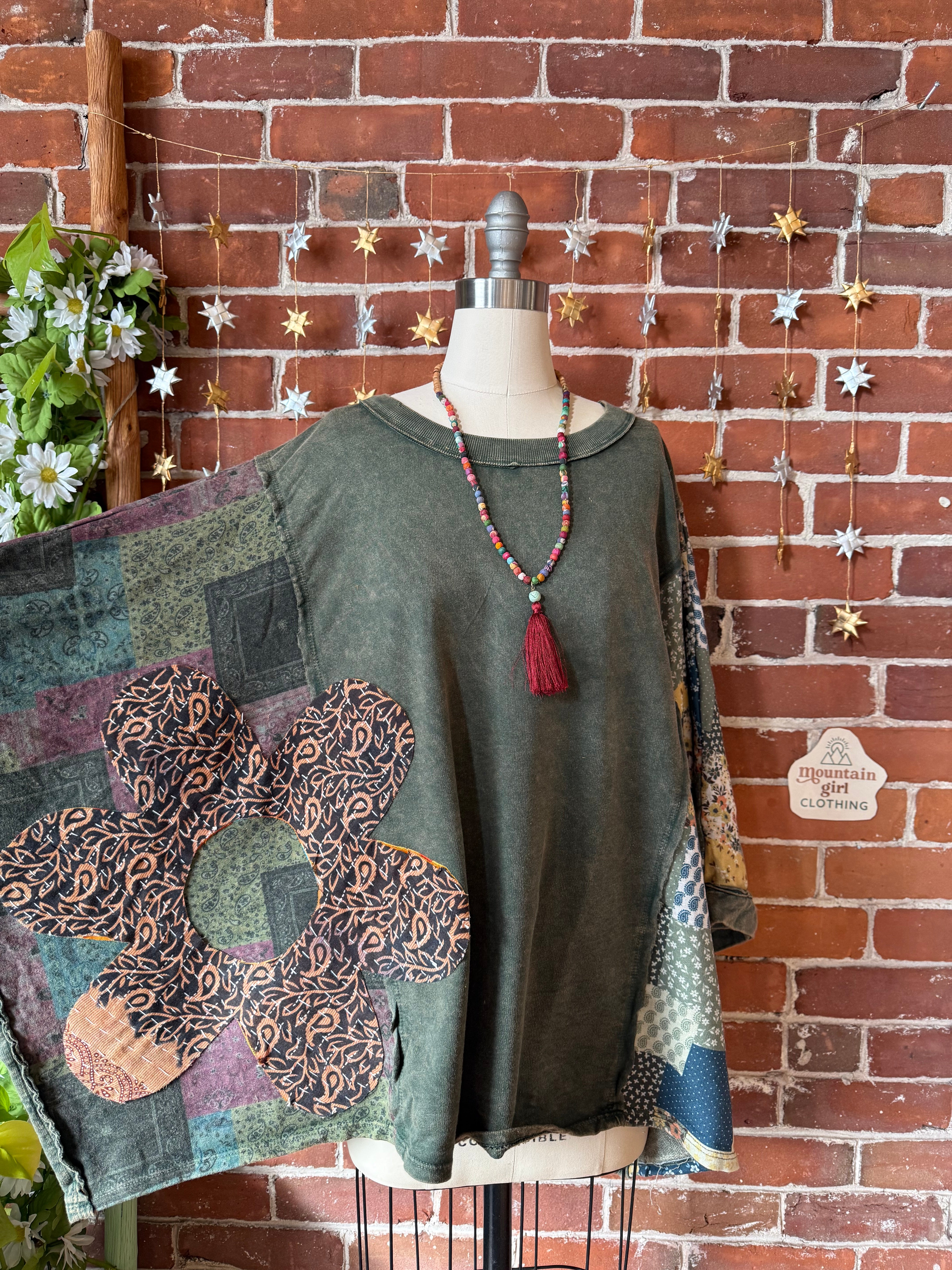 Upcycled flowy lightweight sweatshirt top and poncho sides with armholes.