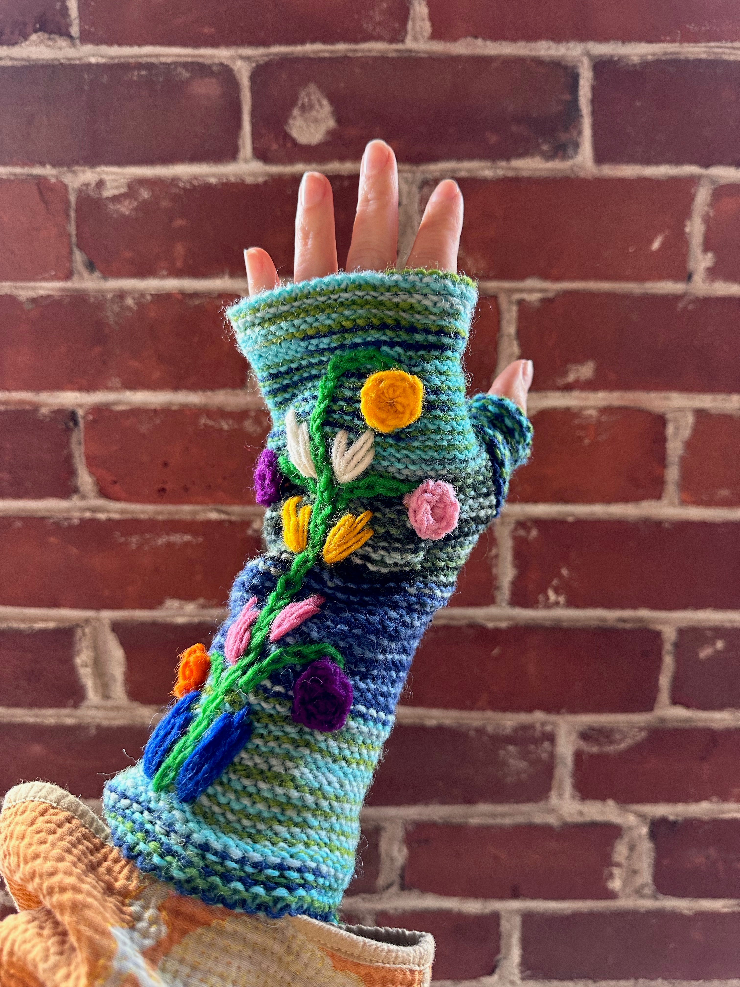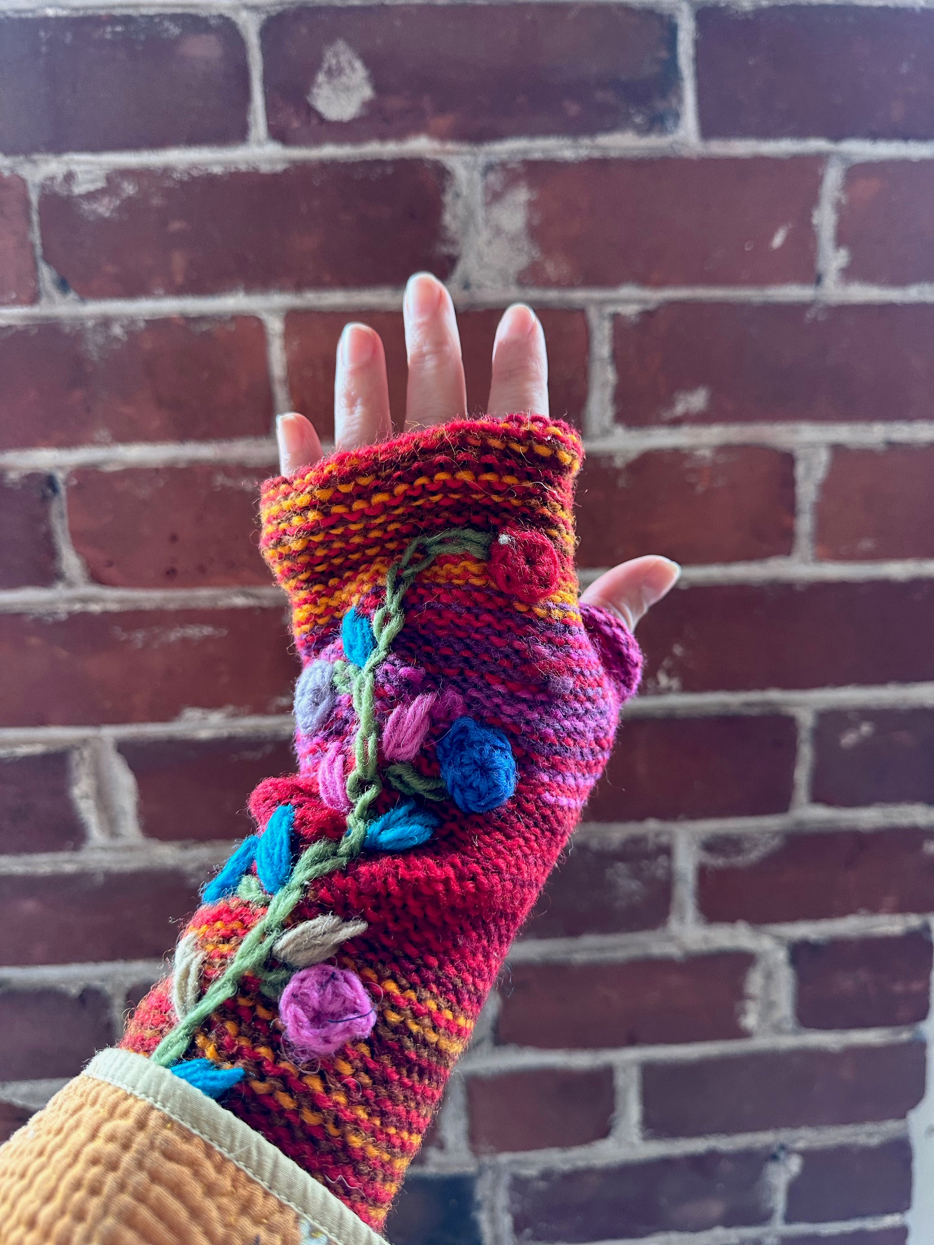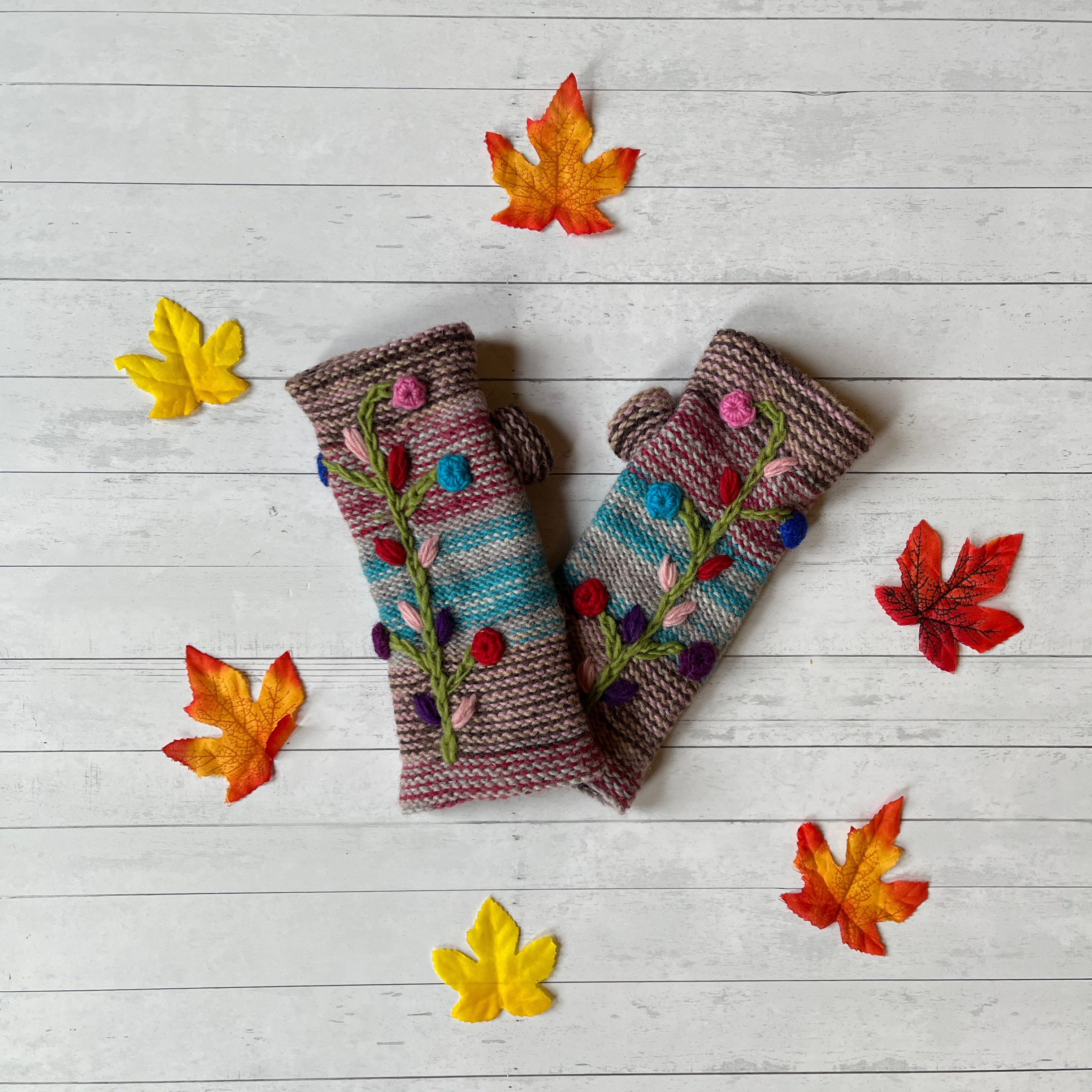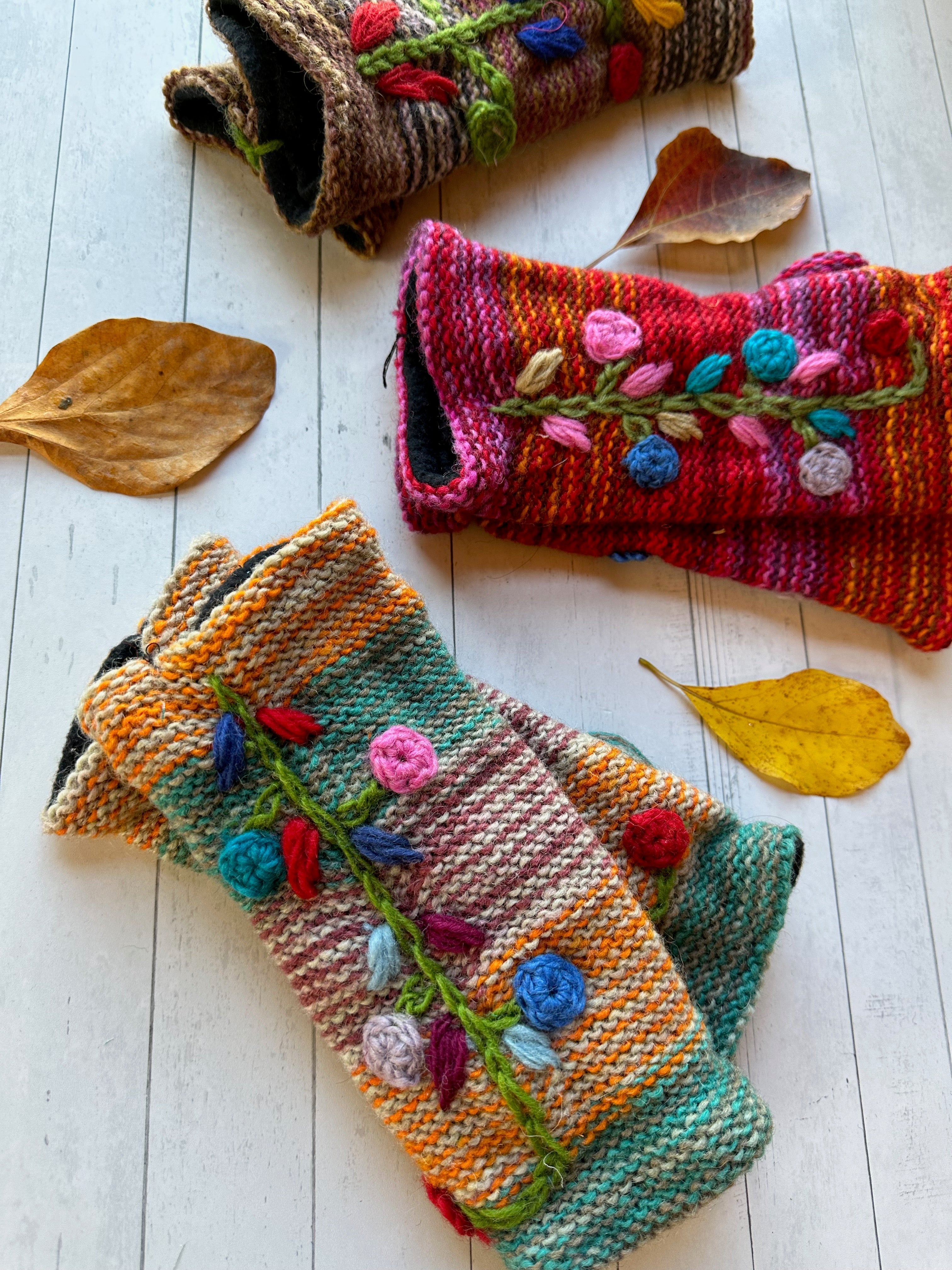 Wrap your hands in cozy color and creative charm with these one-of-a-kind upcycled knit fingerless gloves. Each pair features vibrant embroidered floral designs that dance across beautifully variegated yarns — no two pairs are exactly alike! Soft, stretchy, and full of personality, they’re perfect for keeping your hands warm while leaving your fingers free for creating, running errands , or sipping coffee on a crisp fall day.