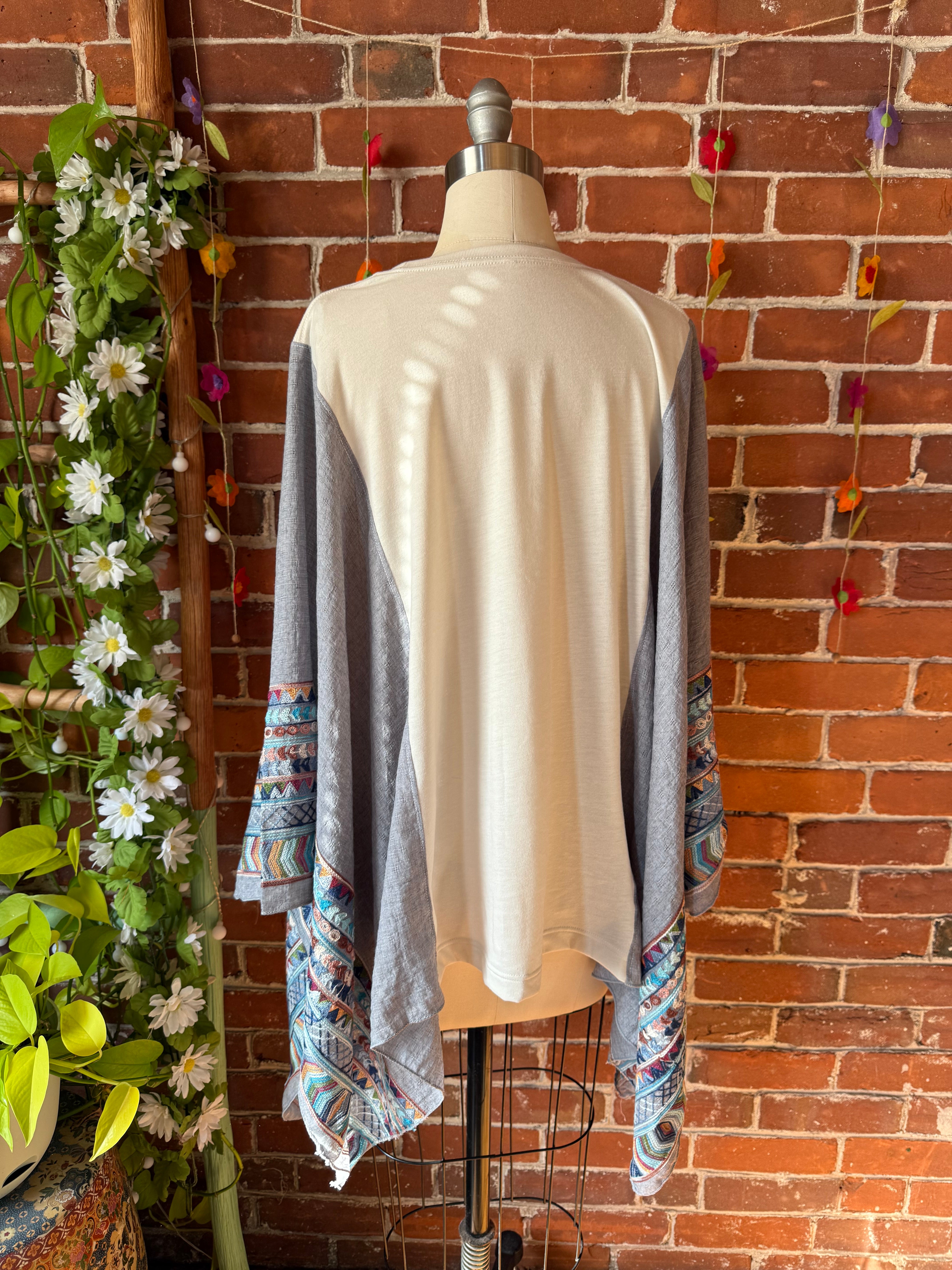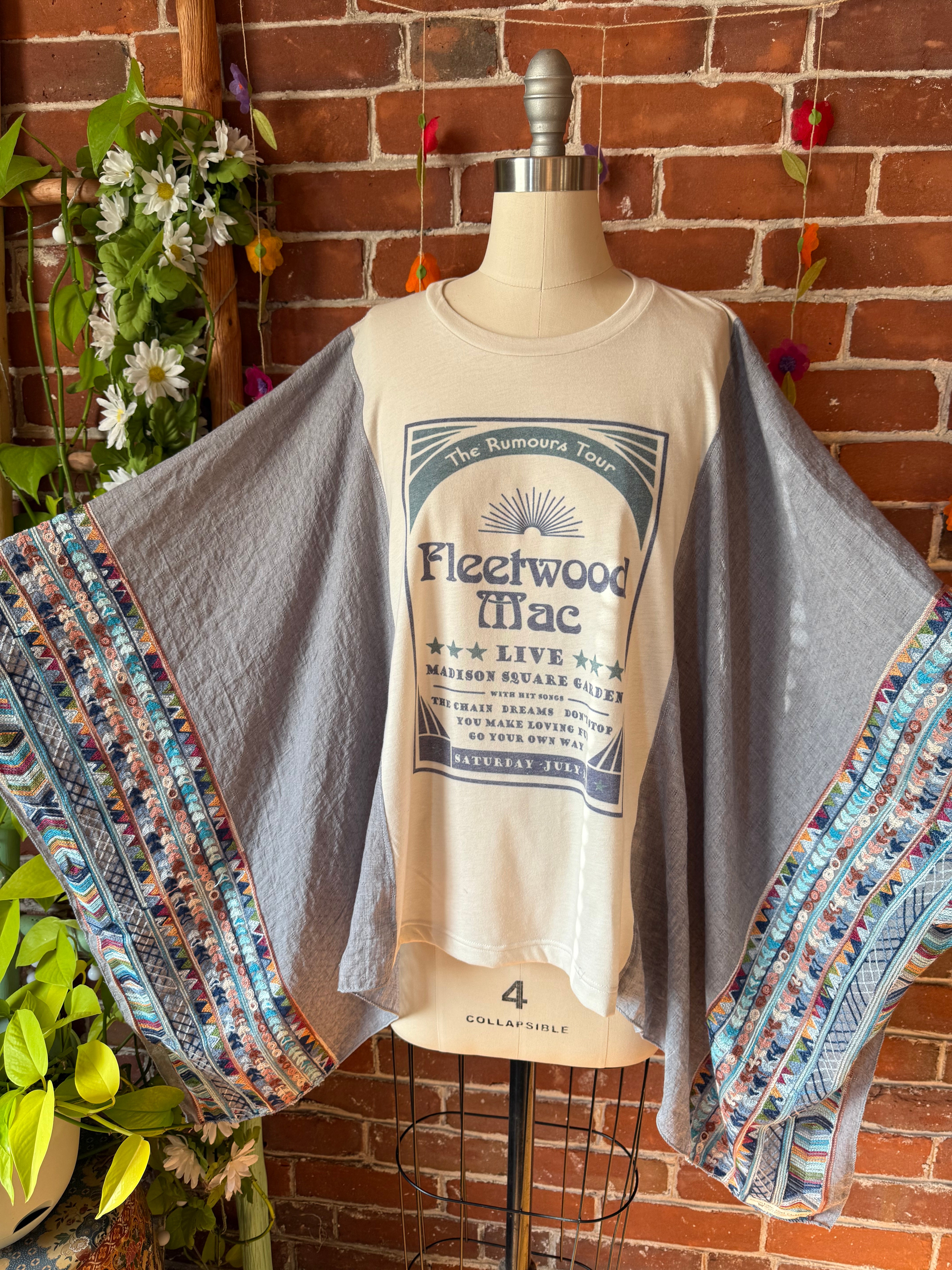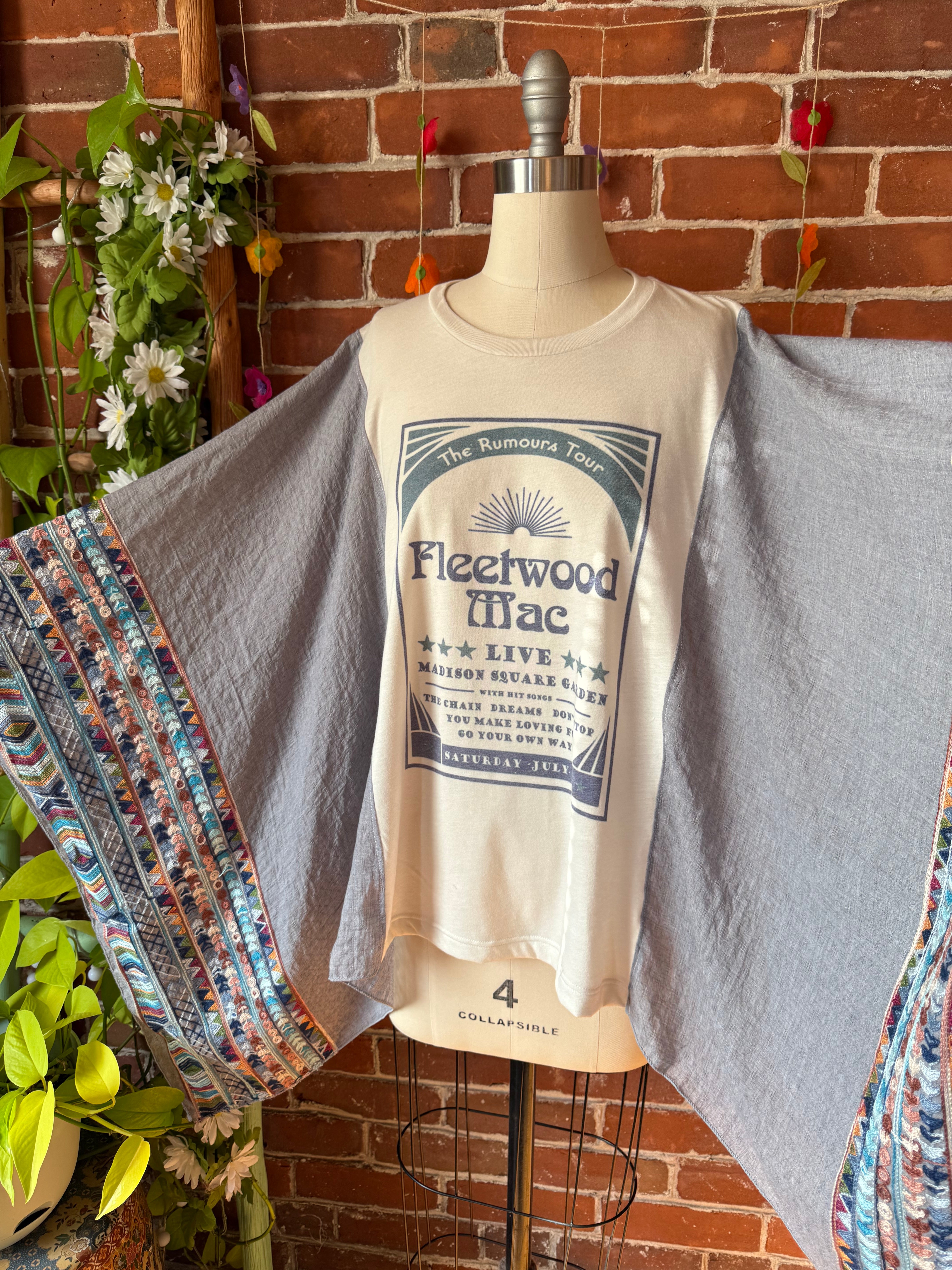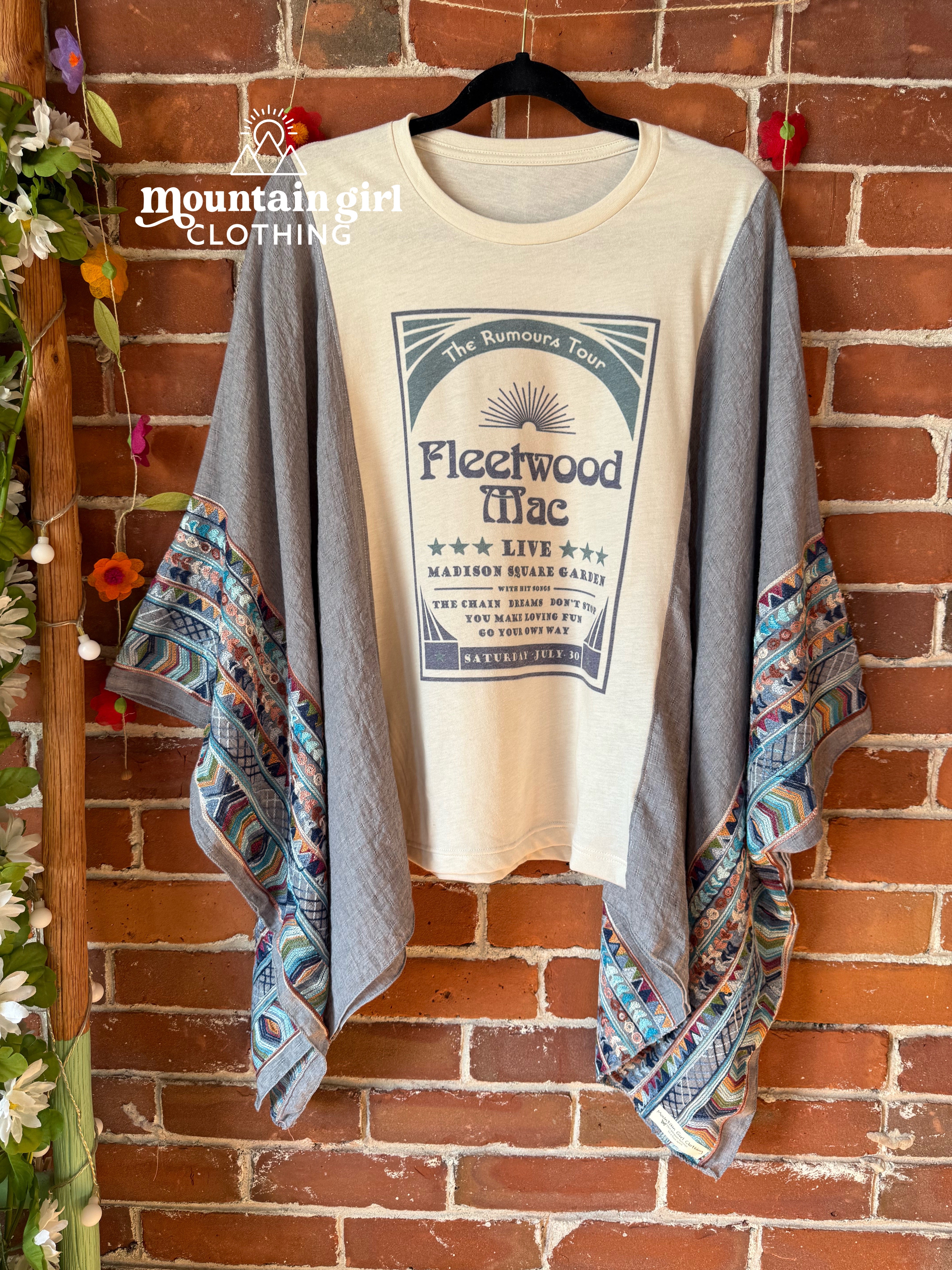 Elevate your style with our one size fits most upcycled long poncho, inspired by Fleetwood Mac. This poncho is lovingly handmade and adorned with a free-spirited, bohemian aesthetic that's ideal for music festivals or laid-back days.
