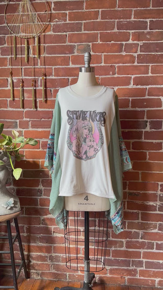 Unleash your inner gold dust woman with this unique Stevie Nicks inspired  embroidered poncho. Made from an upcycled Stevie Nicks tshirt and featuring soft, flowy poncho sleeves, this is a must-have for any die-hard Stevie Nicks fan. Perfect for concerts or everyday wear.