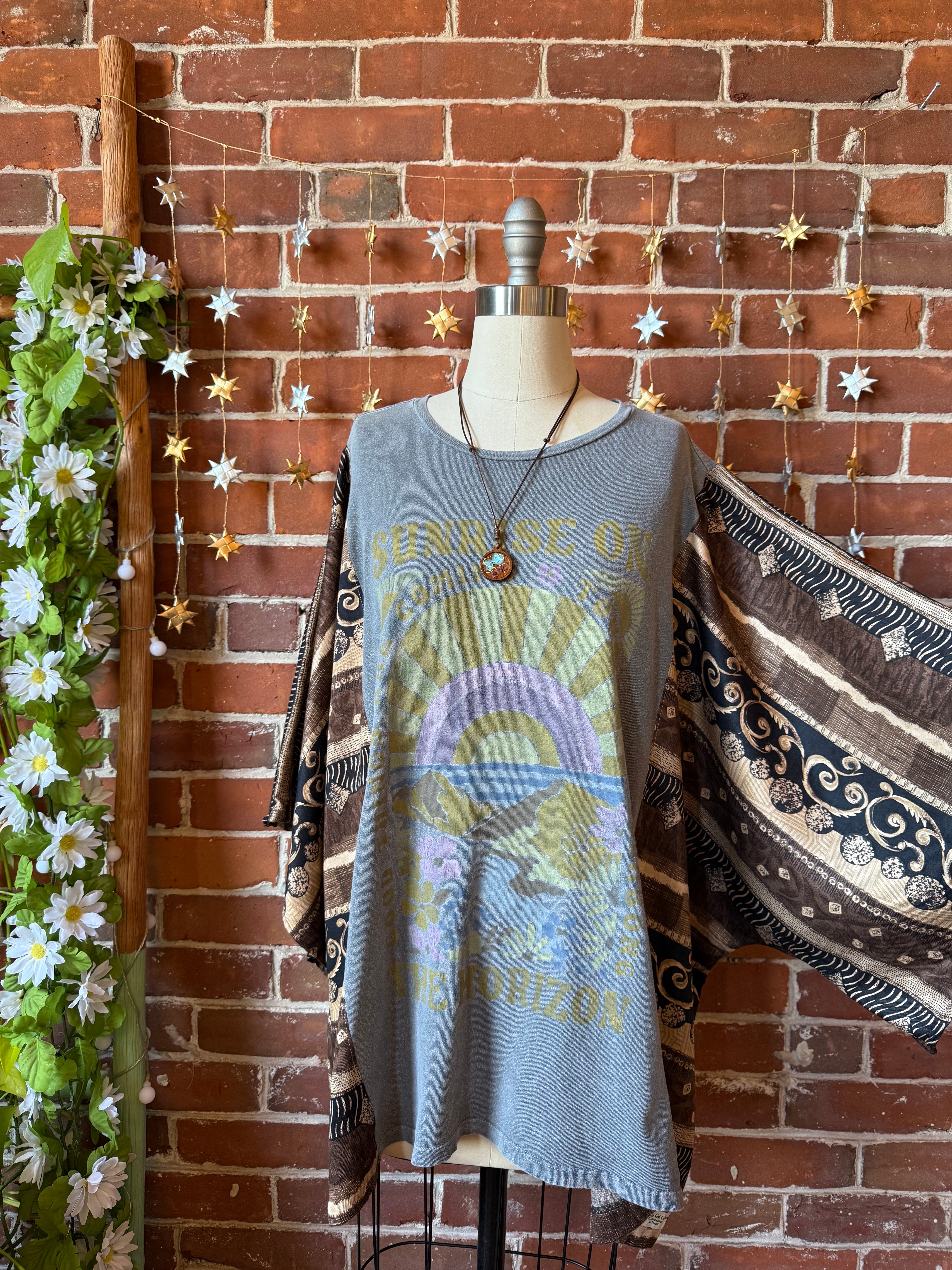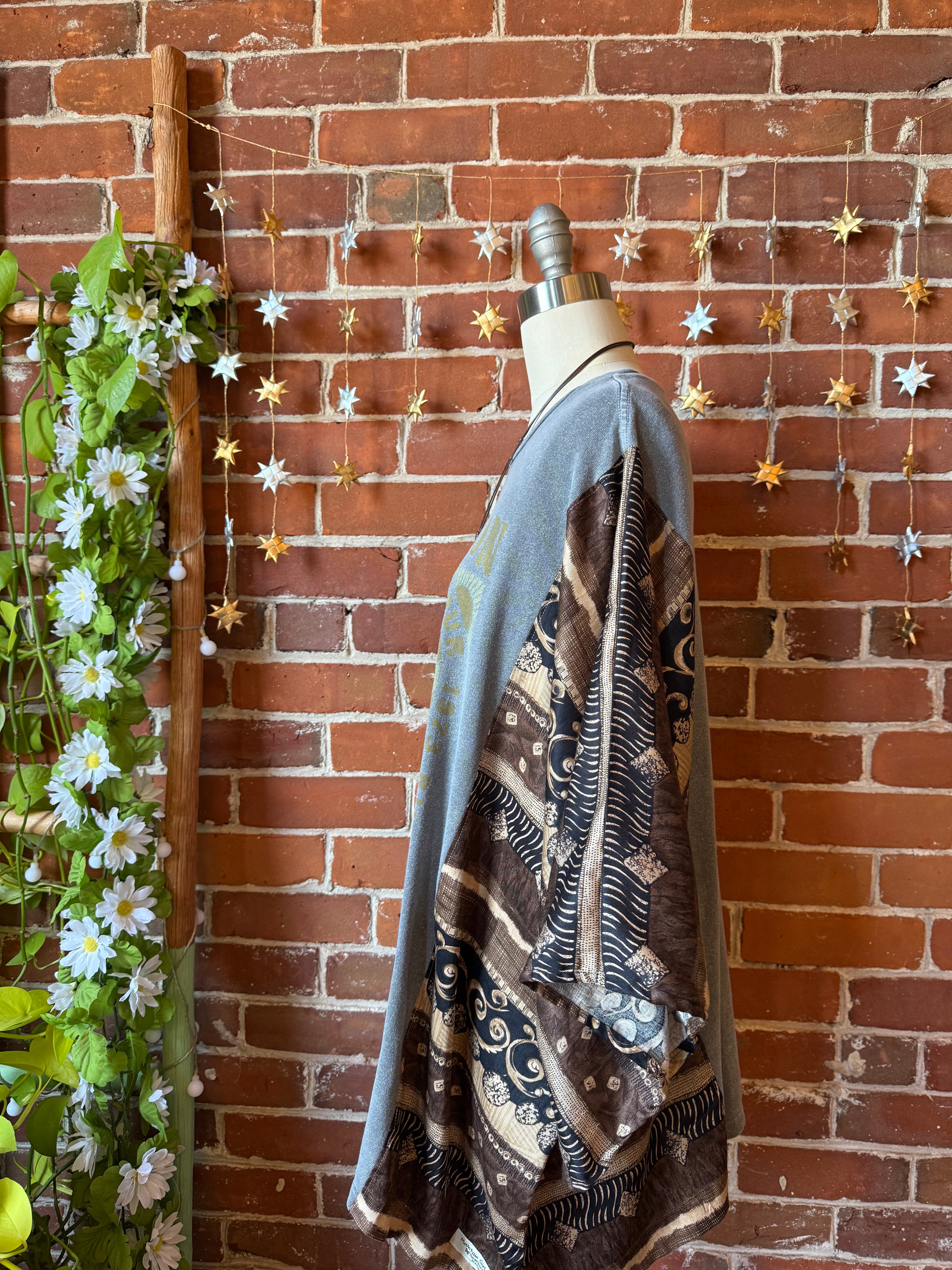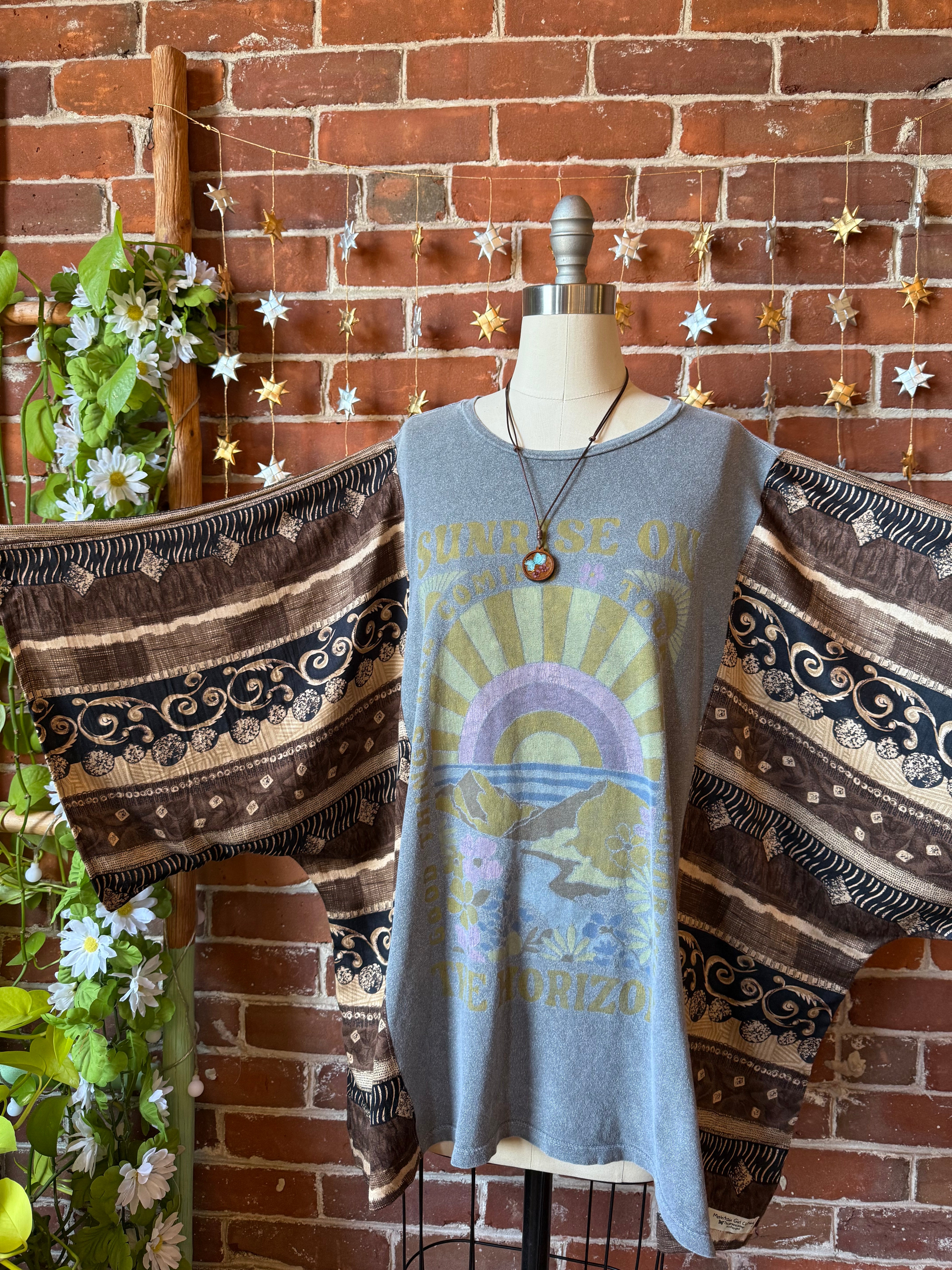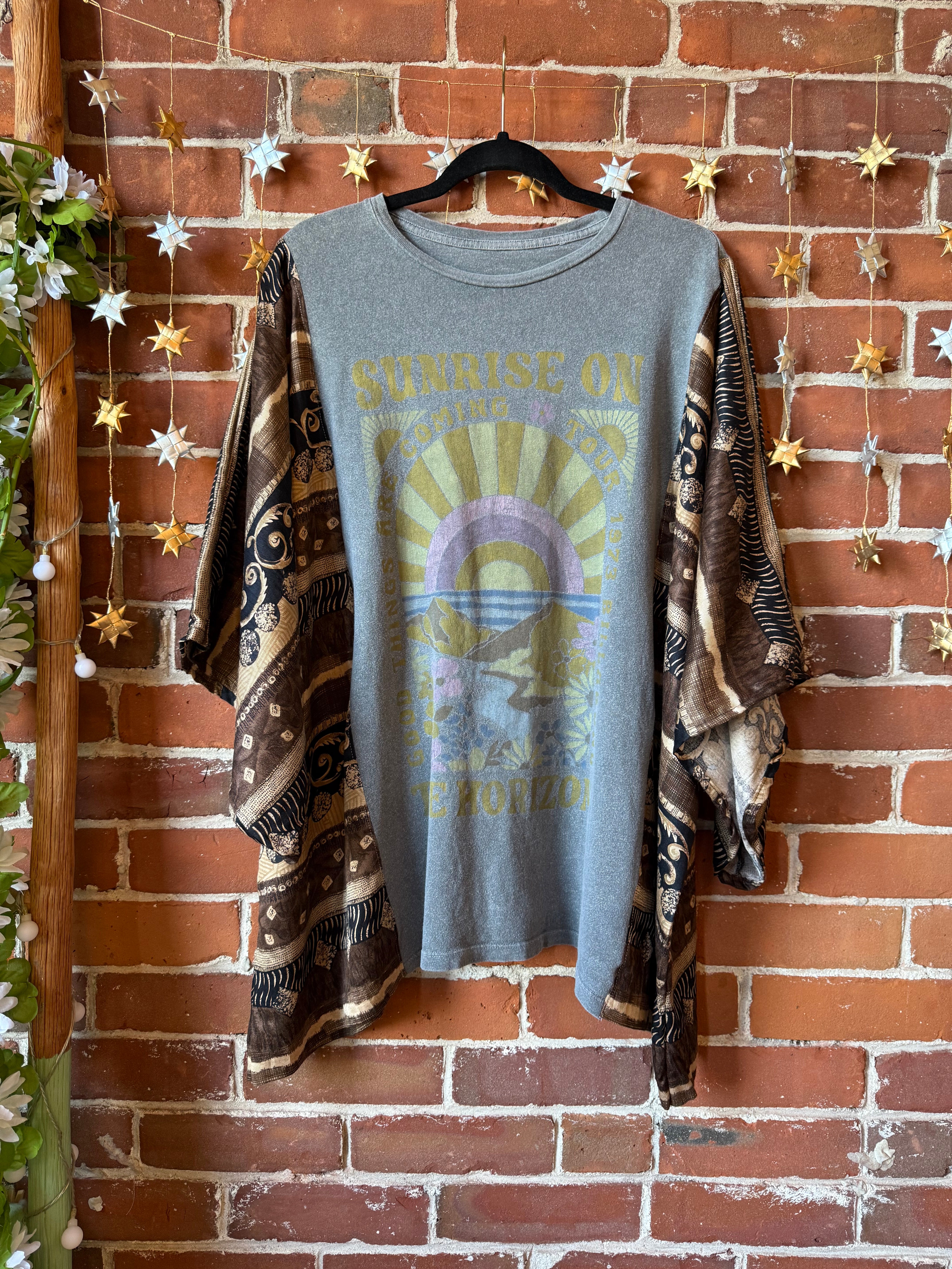 Upcycled soft tee and flowy fabric on the sides/bell sleeves
