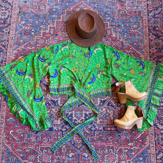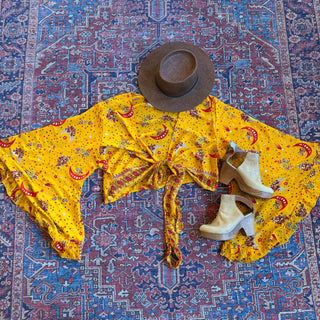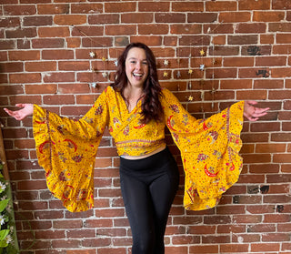 Golden Yellow Sun, Moon + Stars Celestial Cropped Bell Sleeve Wrap Top
