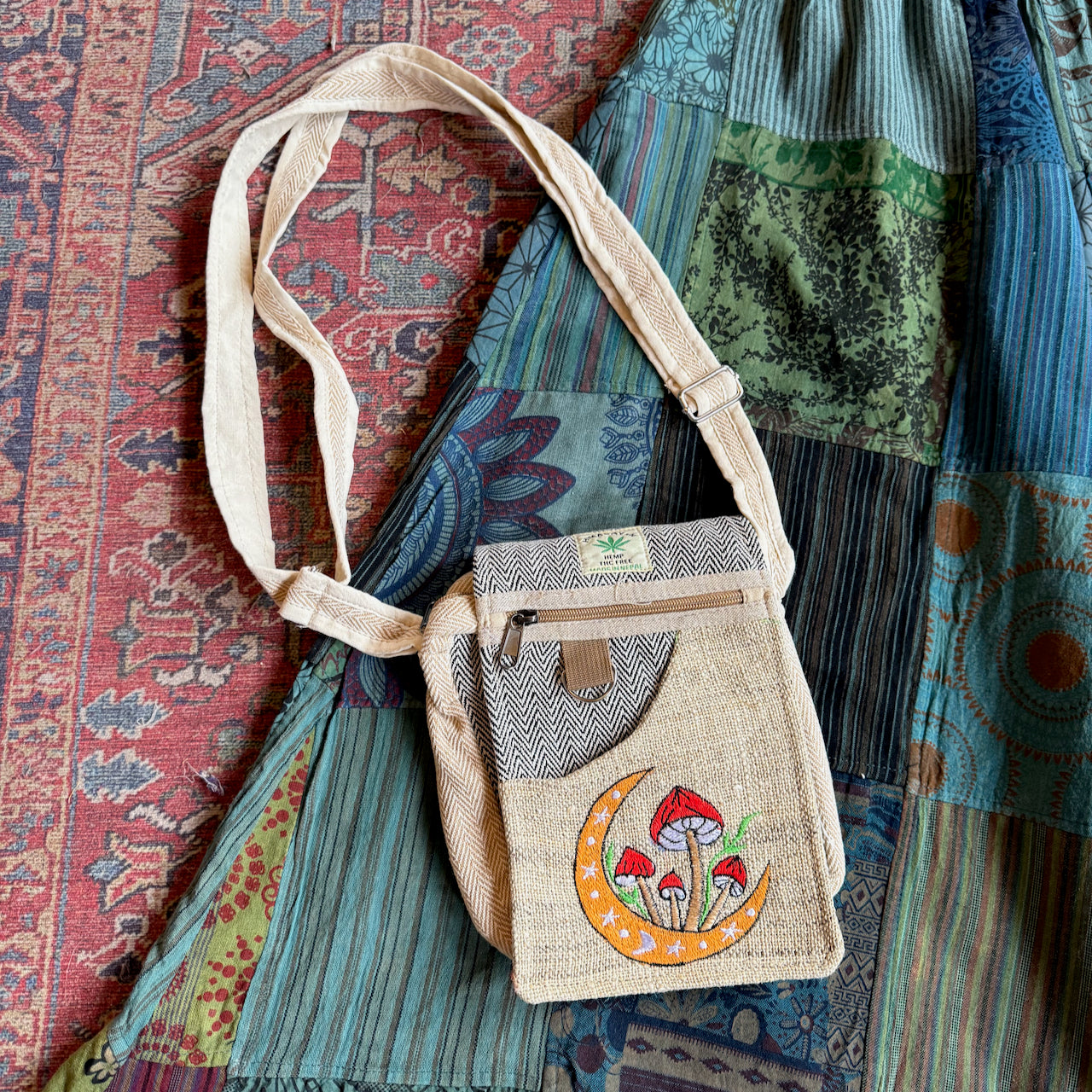 Get ready to make a fun and funky statement with this Hemp Moon Mushroom Bag! Made from 100% hemp and cotton, this backpack features an inner lining, main zipper closure, and adjustable shoulder strap for maximum comfort. You'll have plenty of room for all your essentials