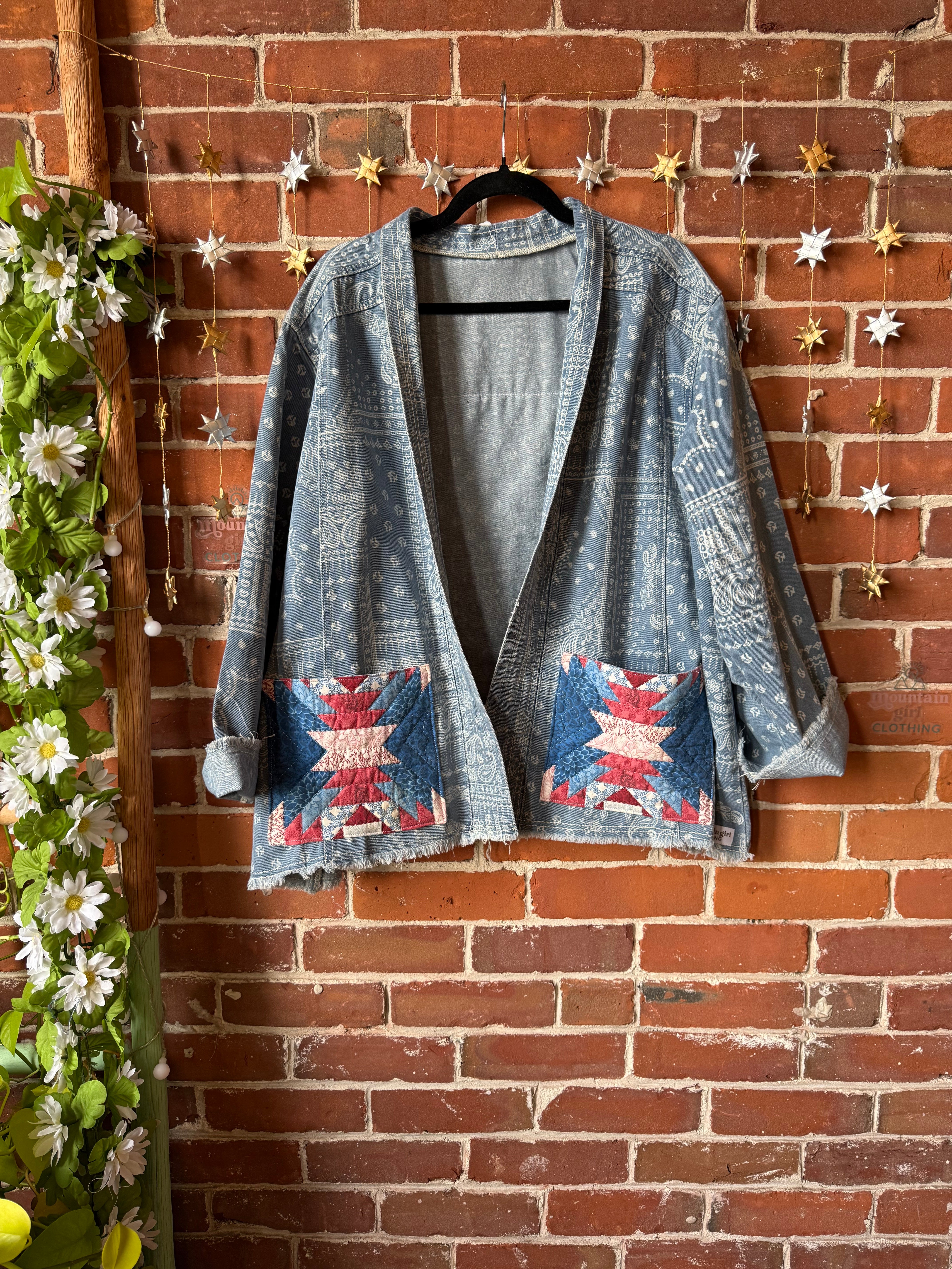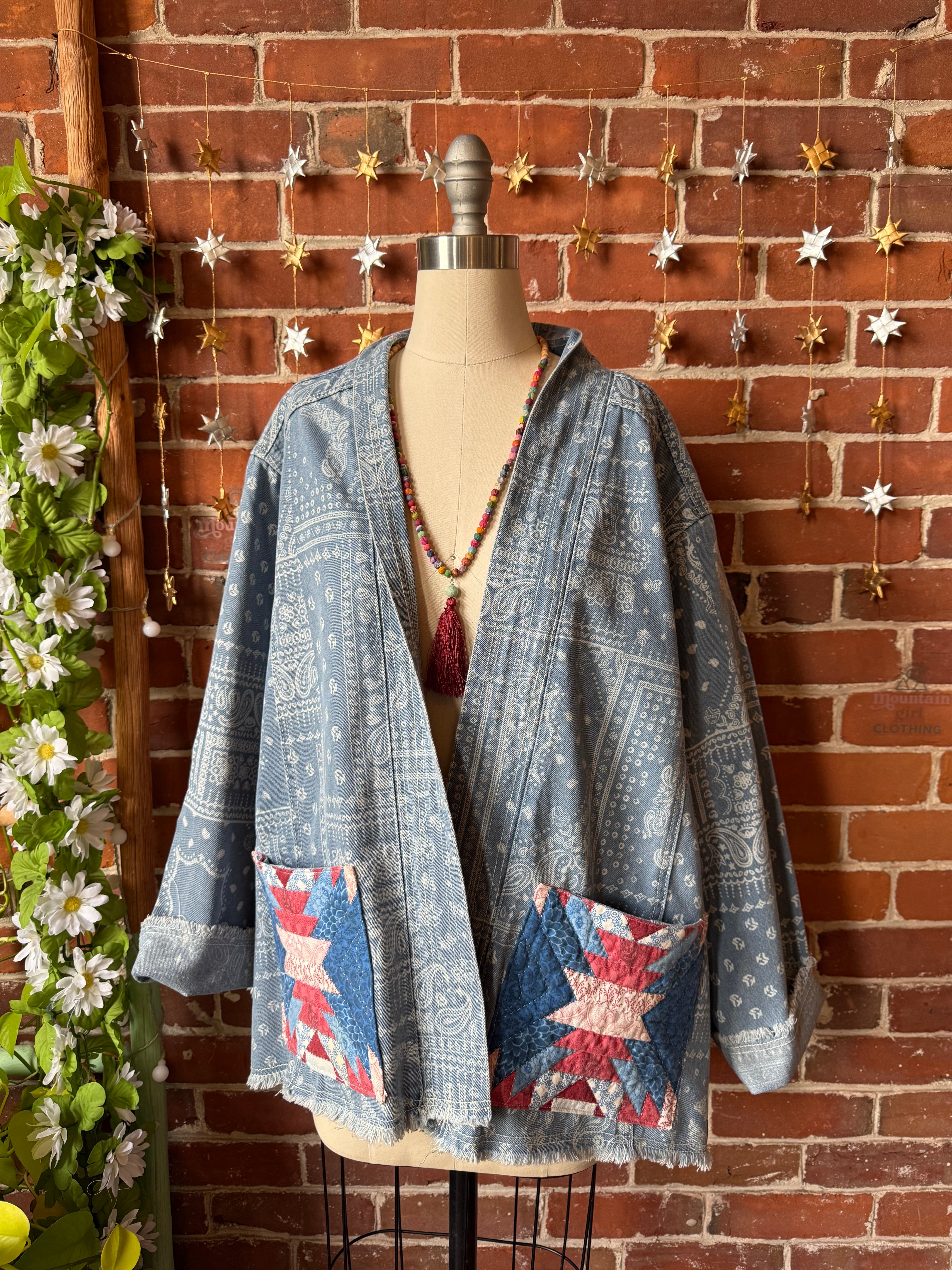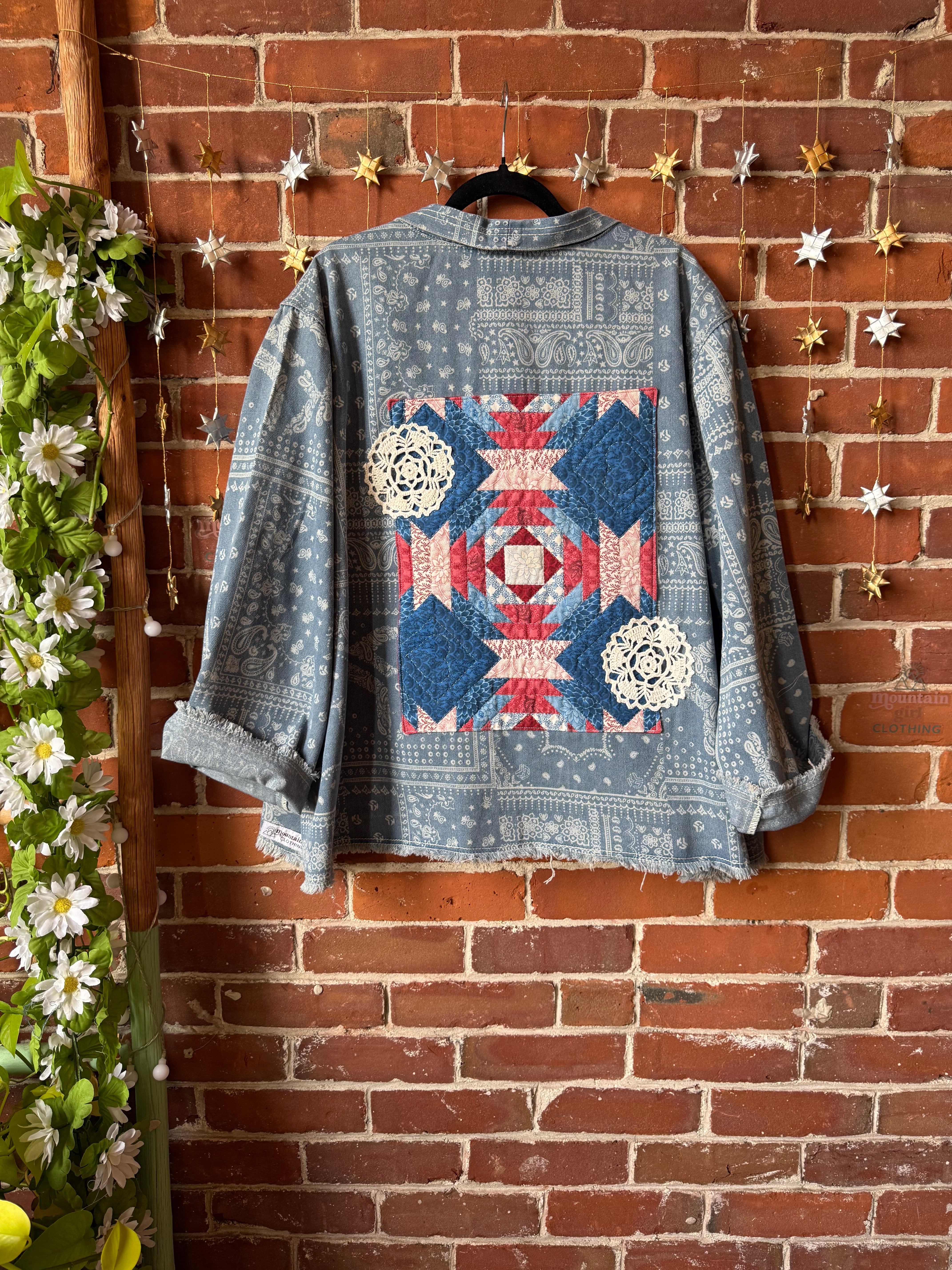 One of a kind jacket with raw edge details and vintage patchwork appliques + doilys