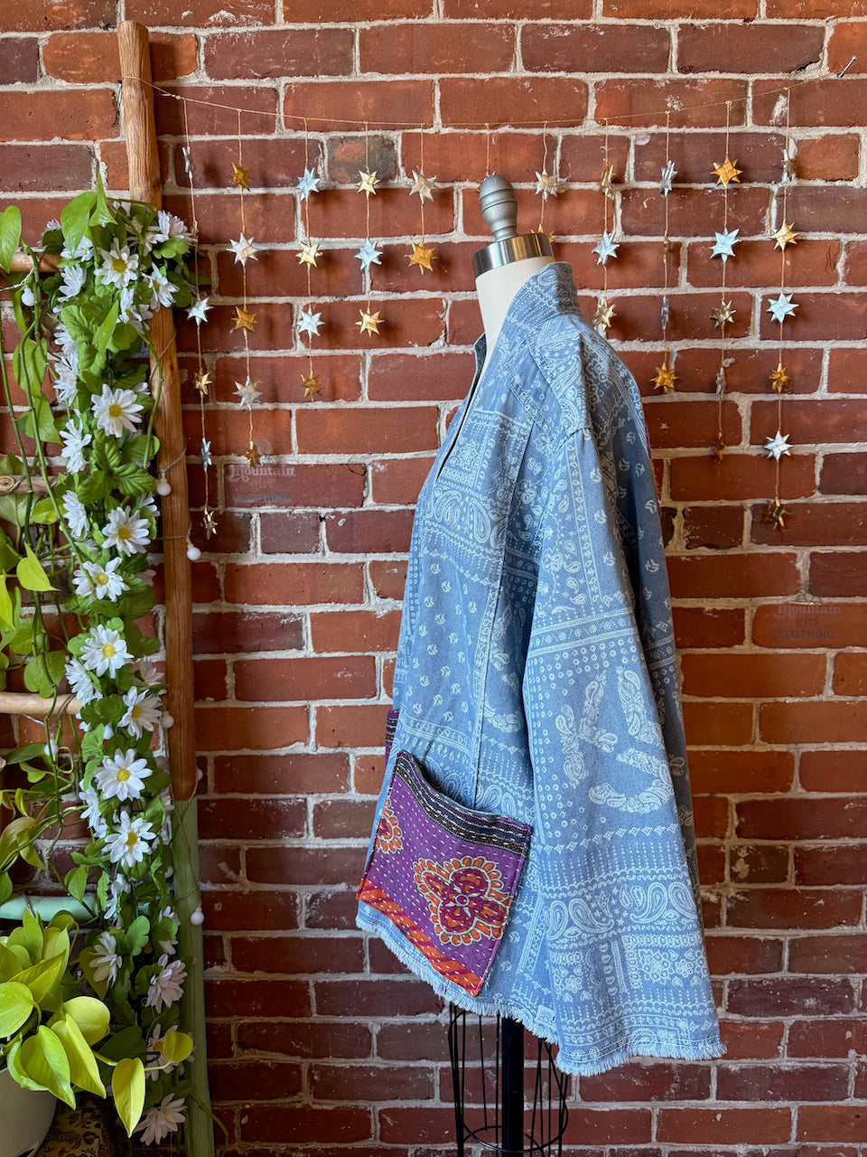 One of a kind jacket with raw edge details, kantha details