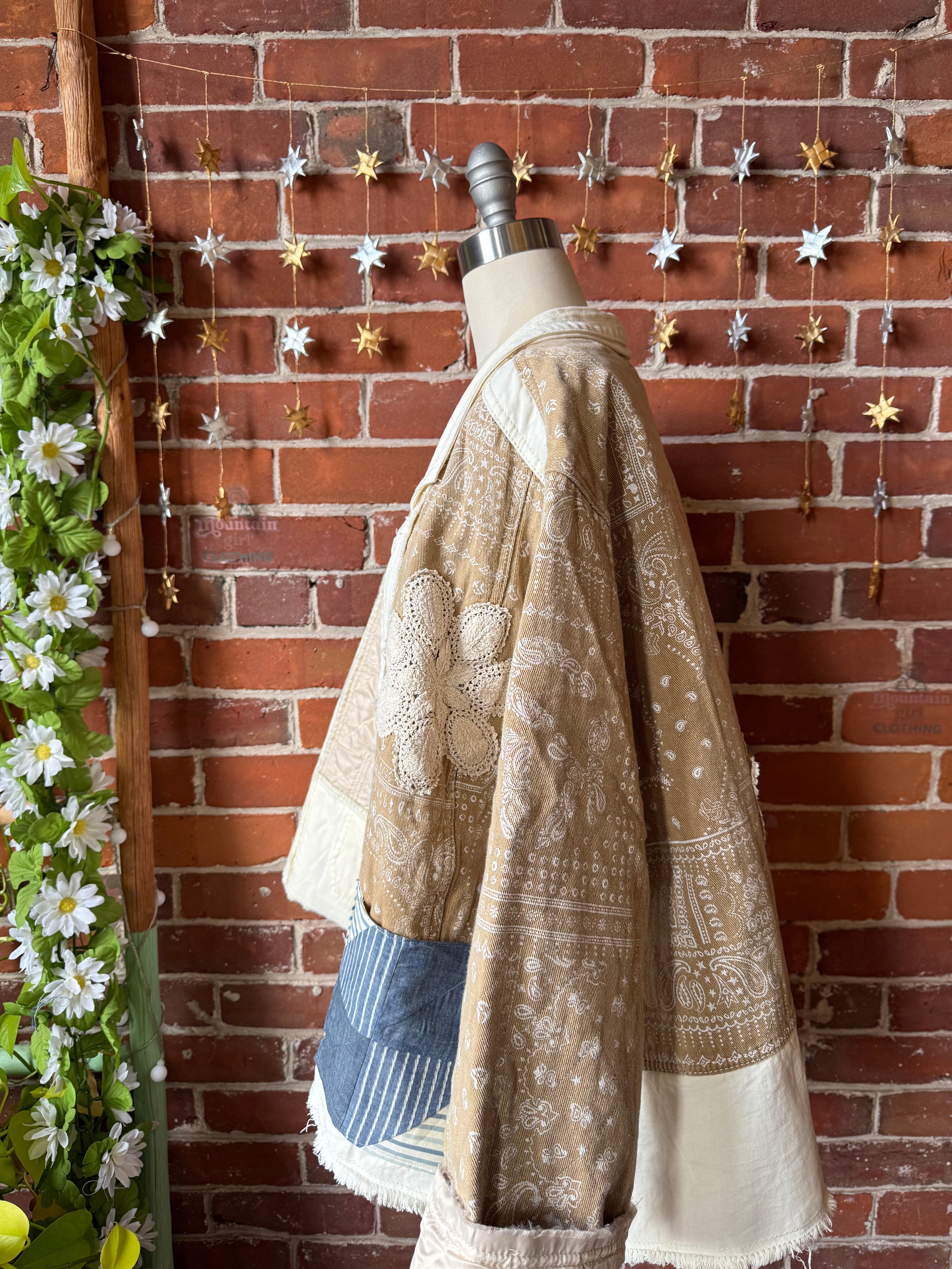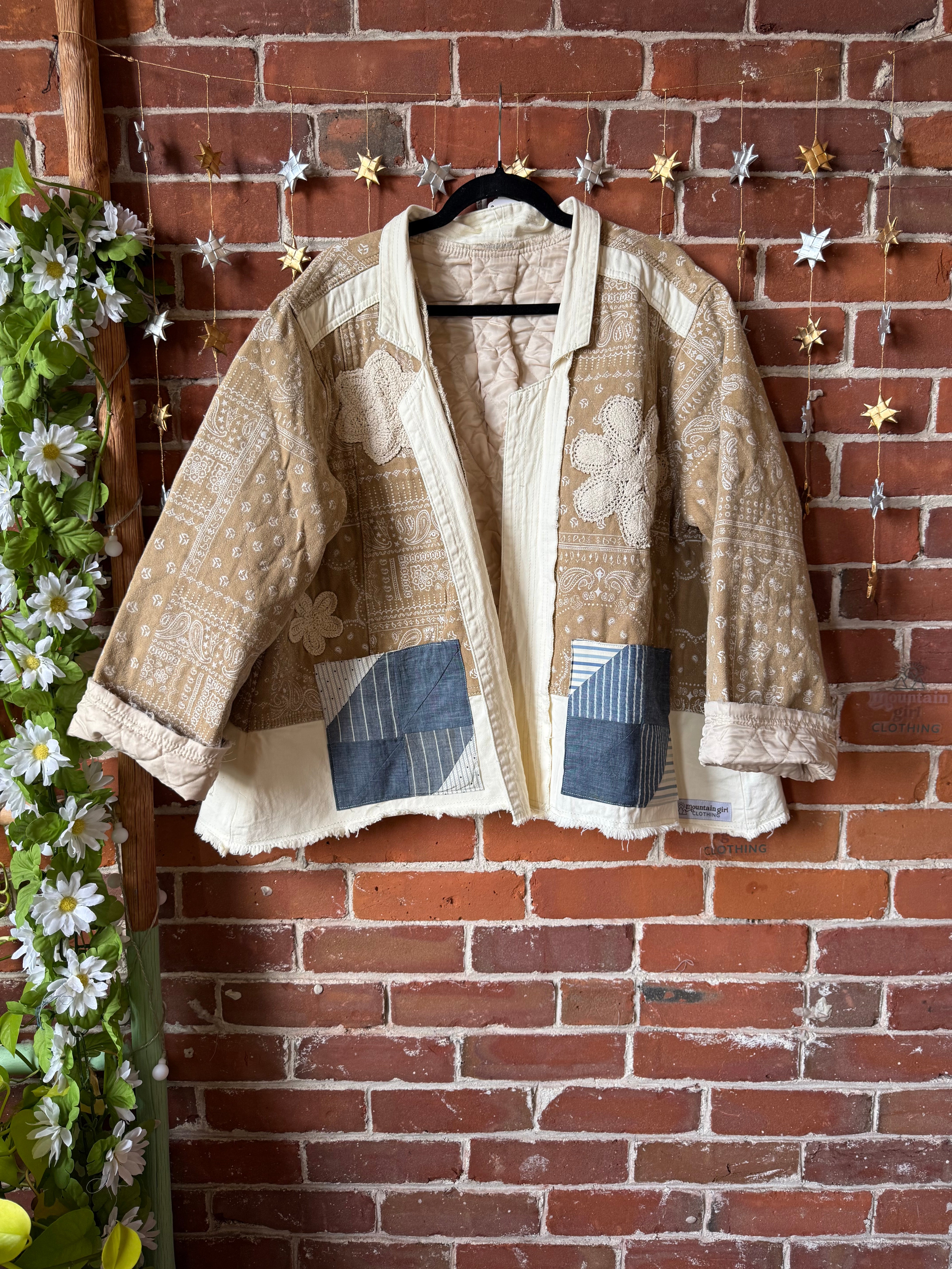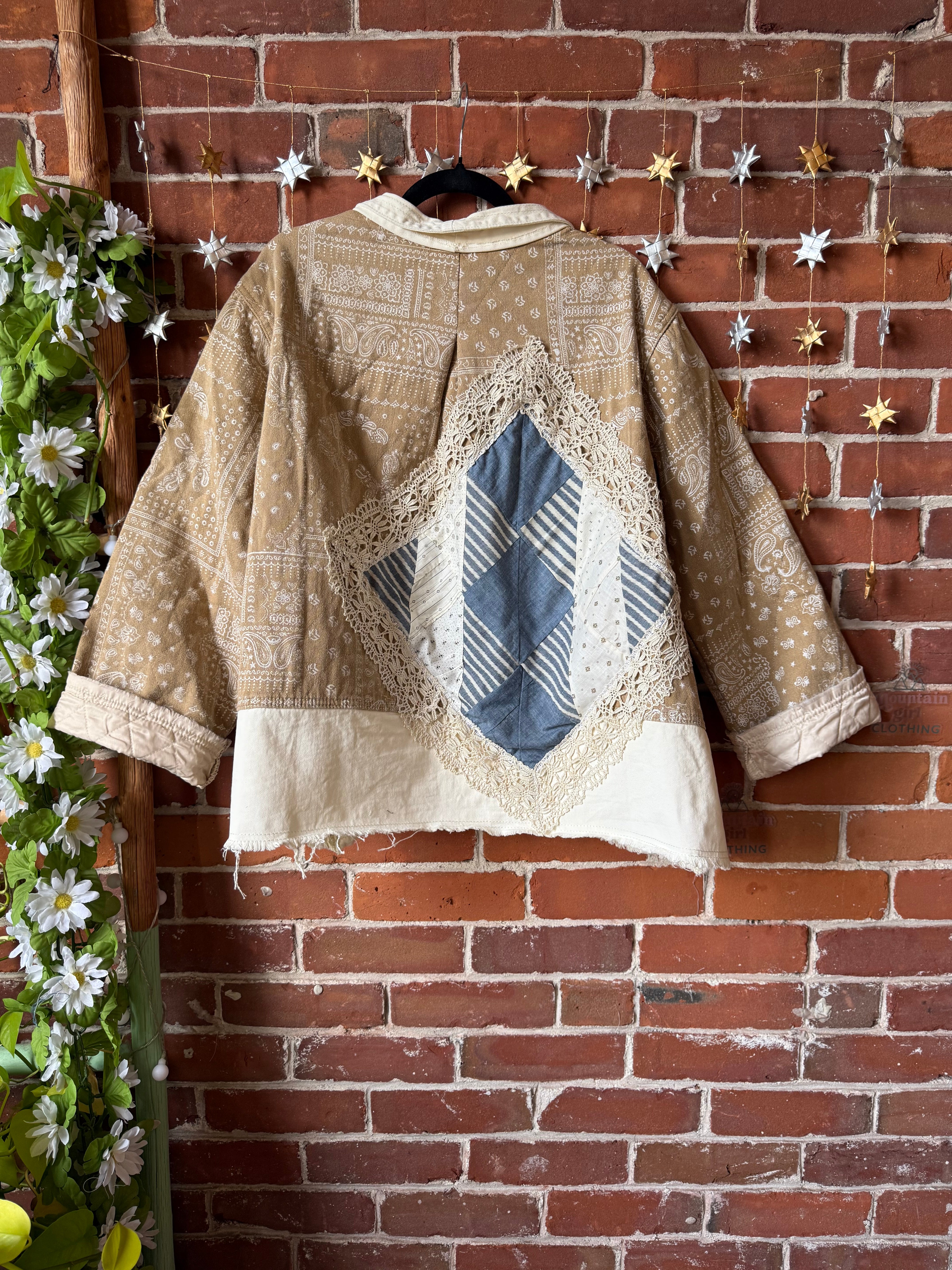 Quilted one of a kind jacket with raw edge details and doily's/vintage fabric patches