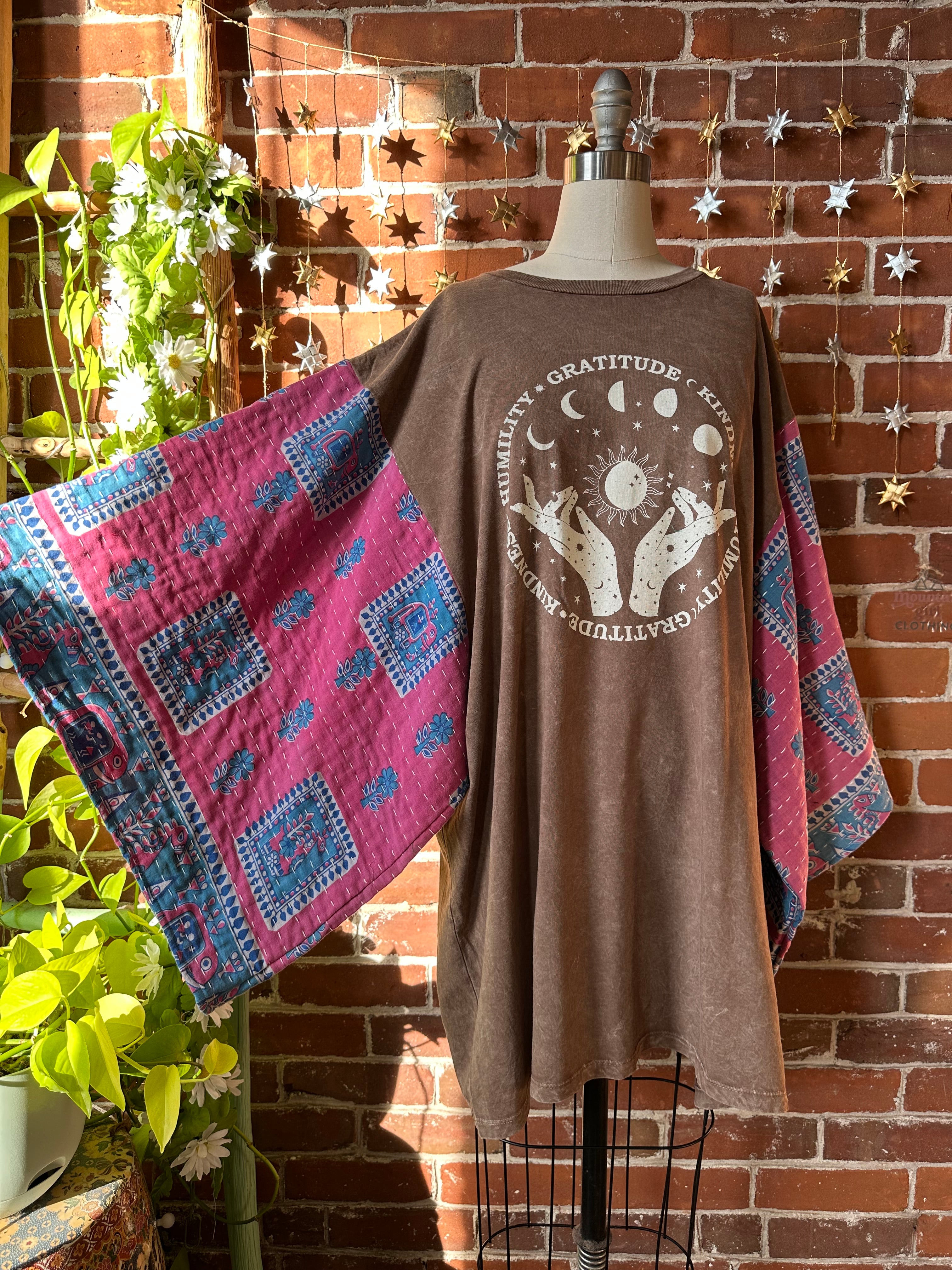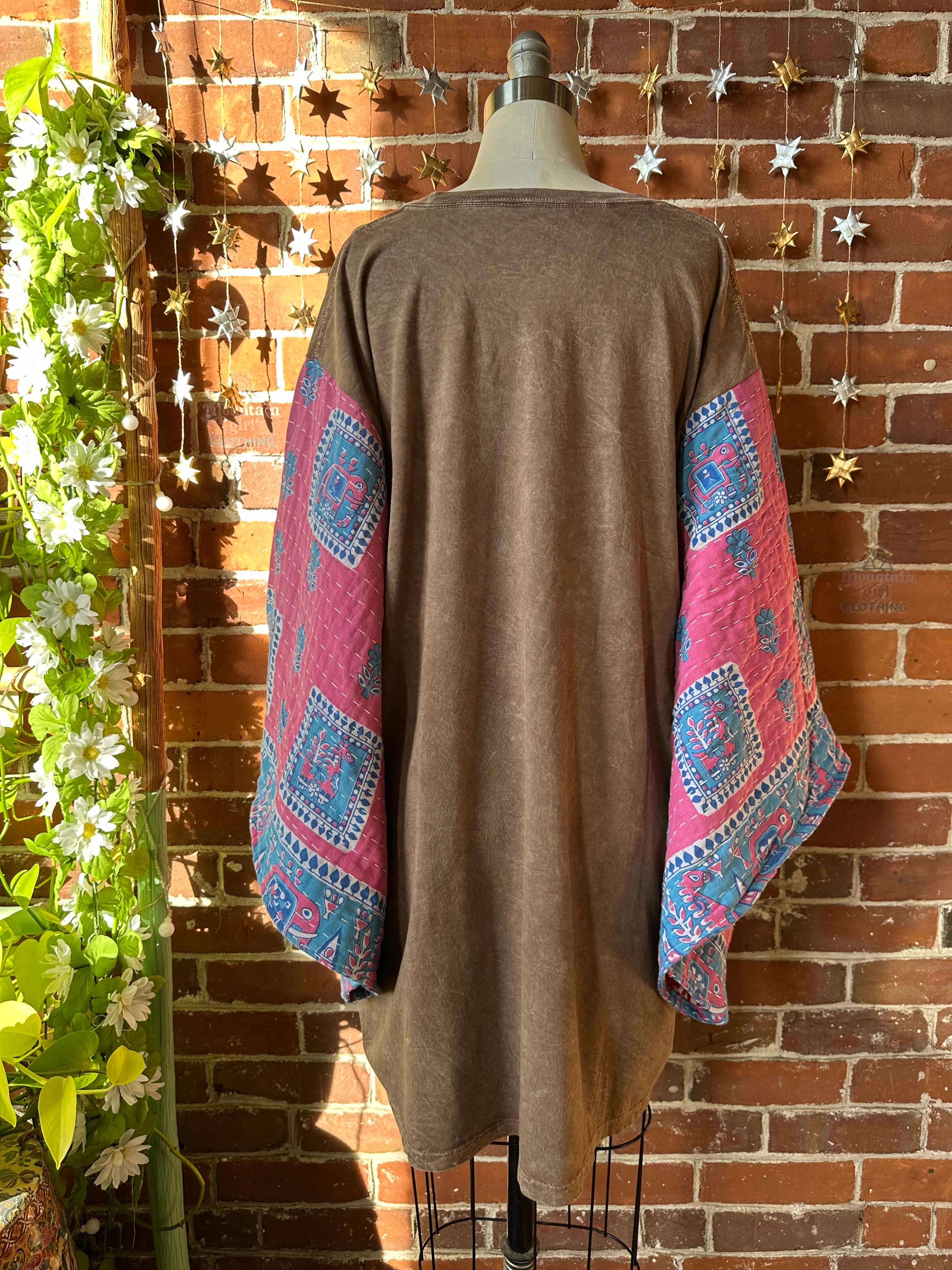 Upcycled long mineral wash tee and flowy kantha fabric bell sleeves