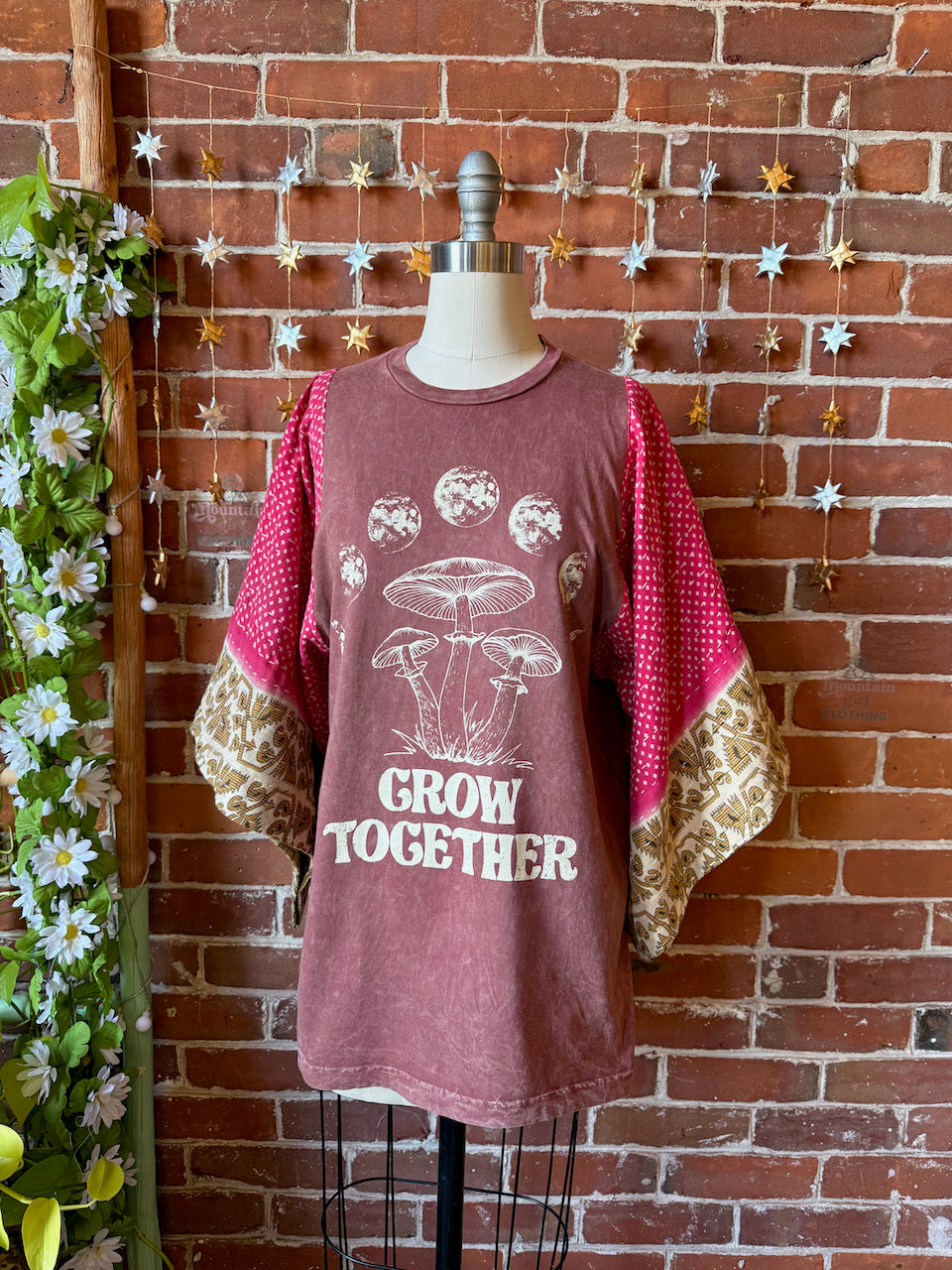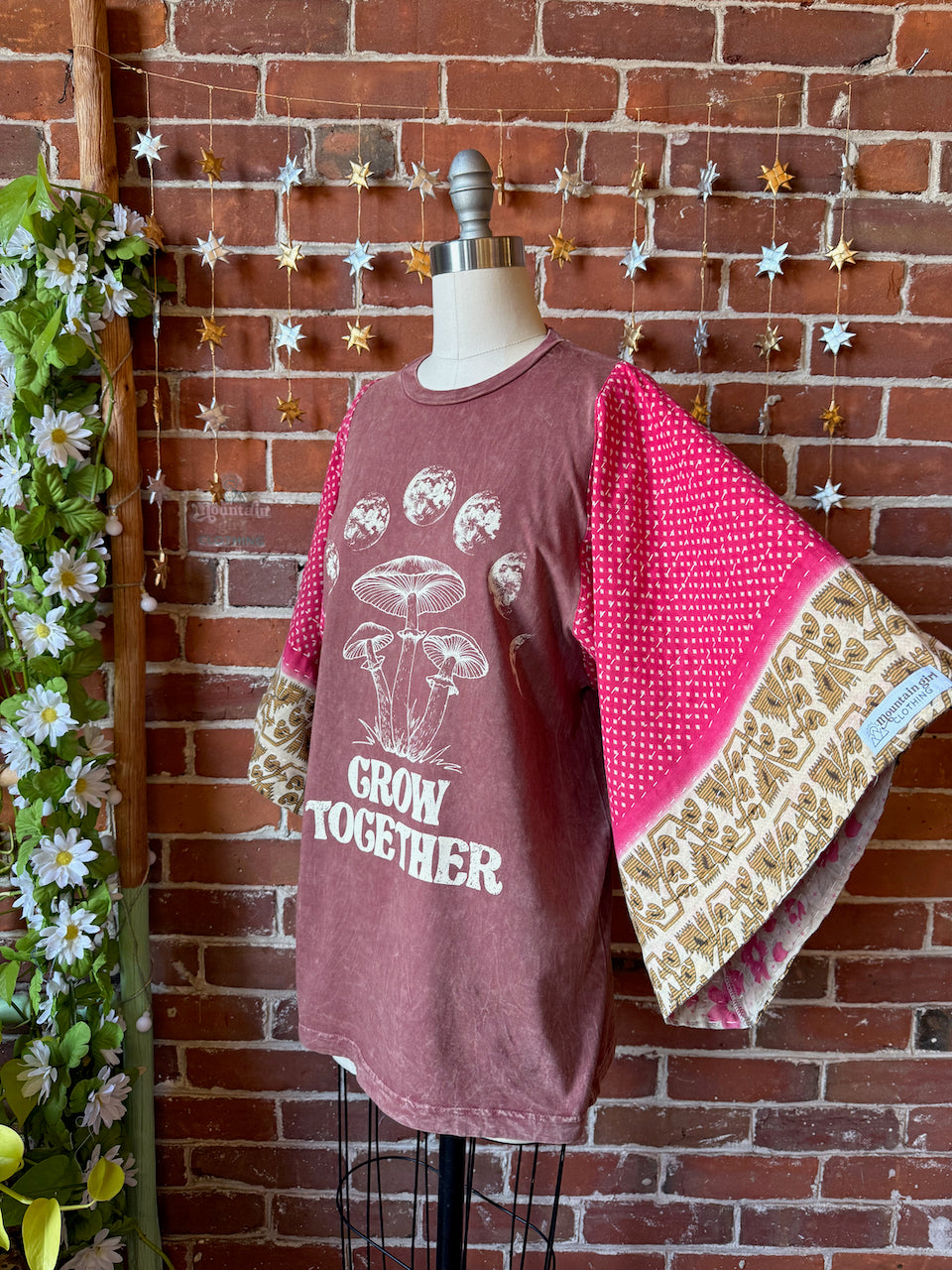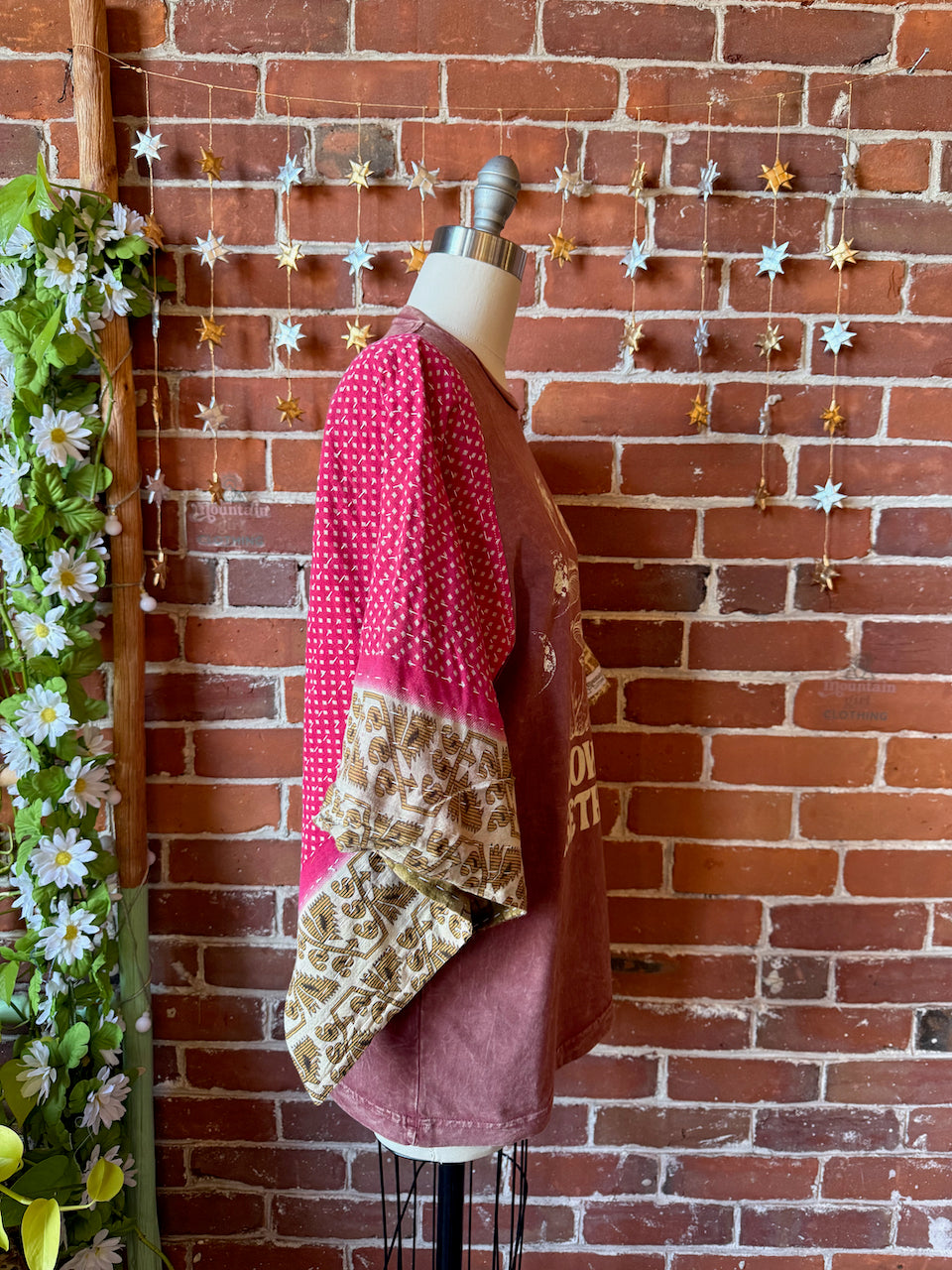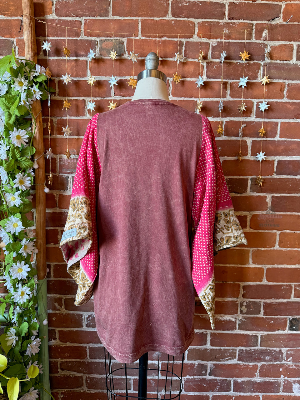Upcycled mineral wash tee and flowy kantha fabric bell sleeves