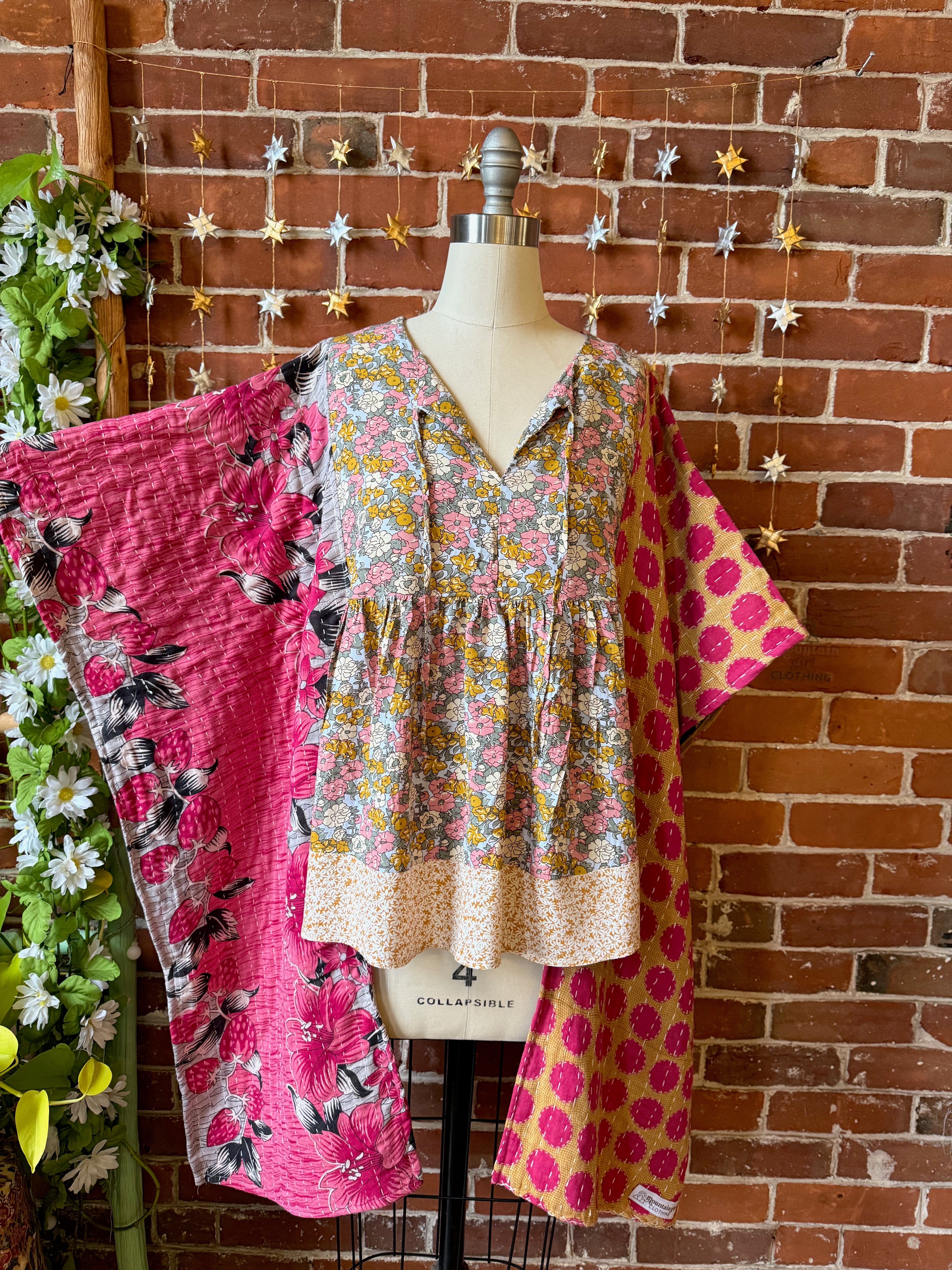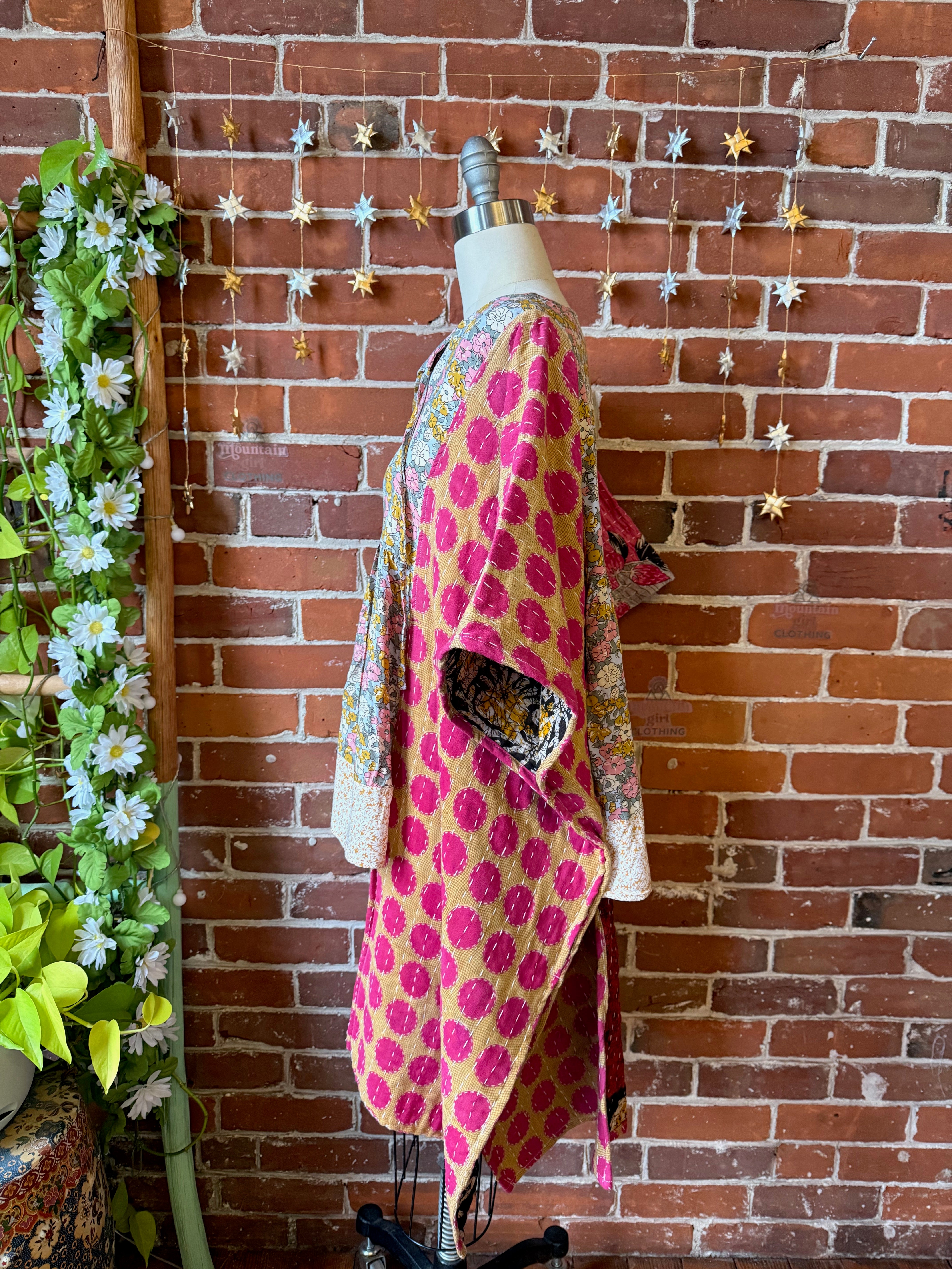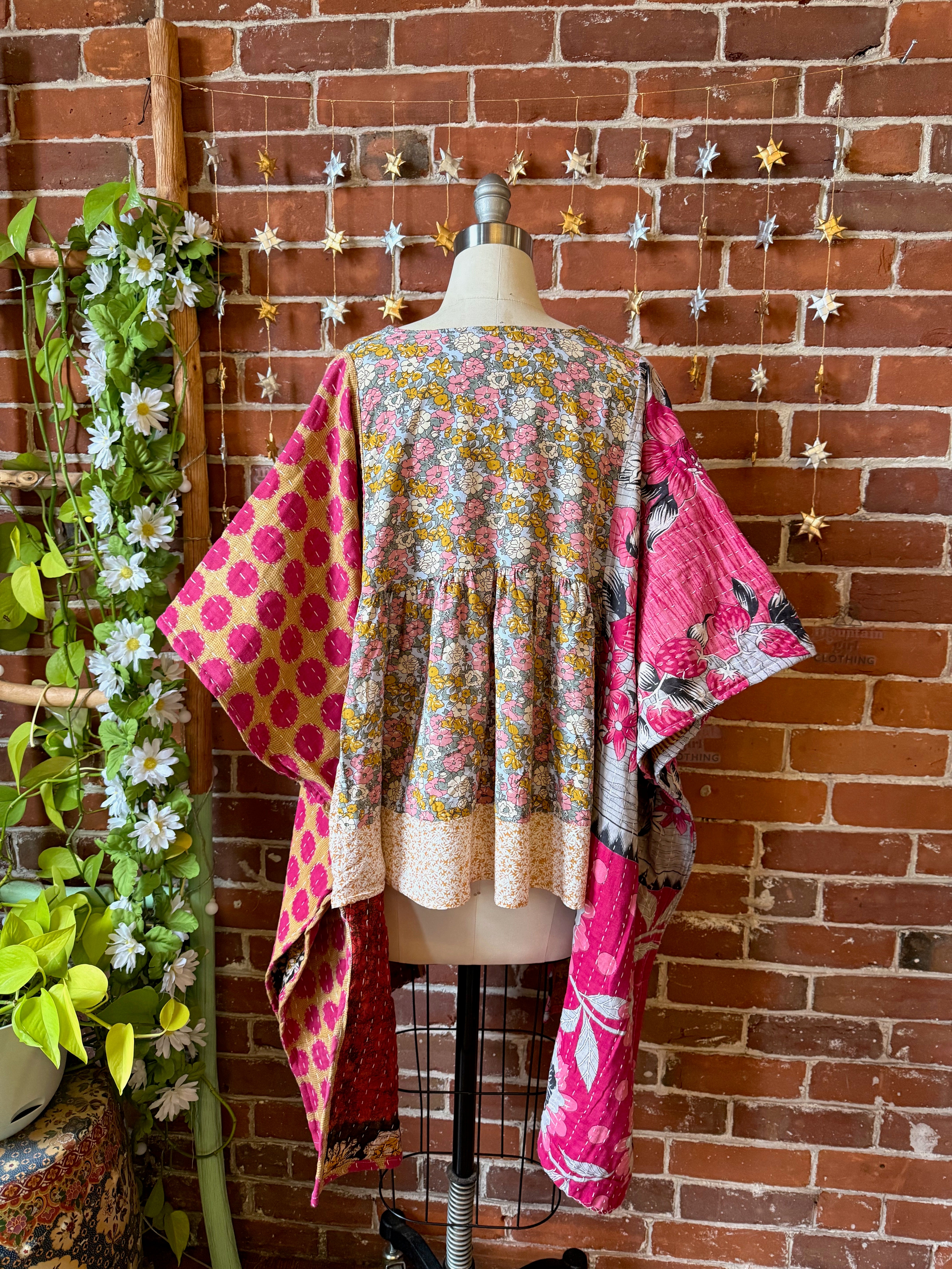 Upcycled flowy floral and kantha fabric on the sides, creating a flowy hi lo silhouette.