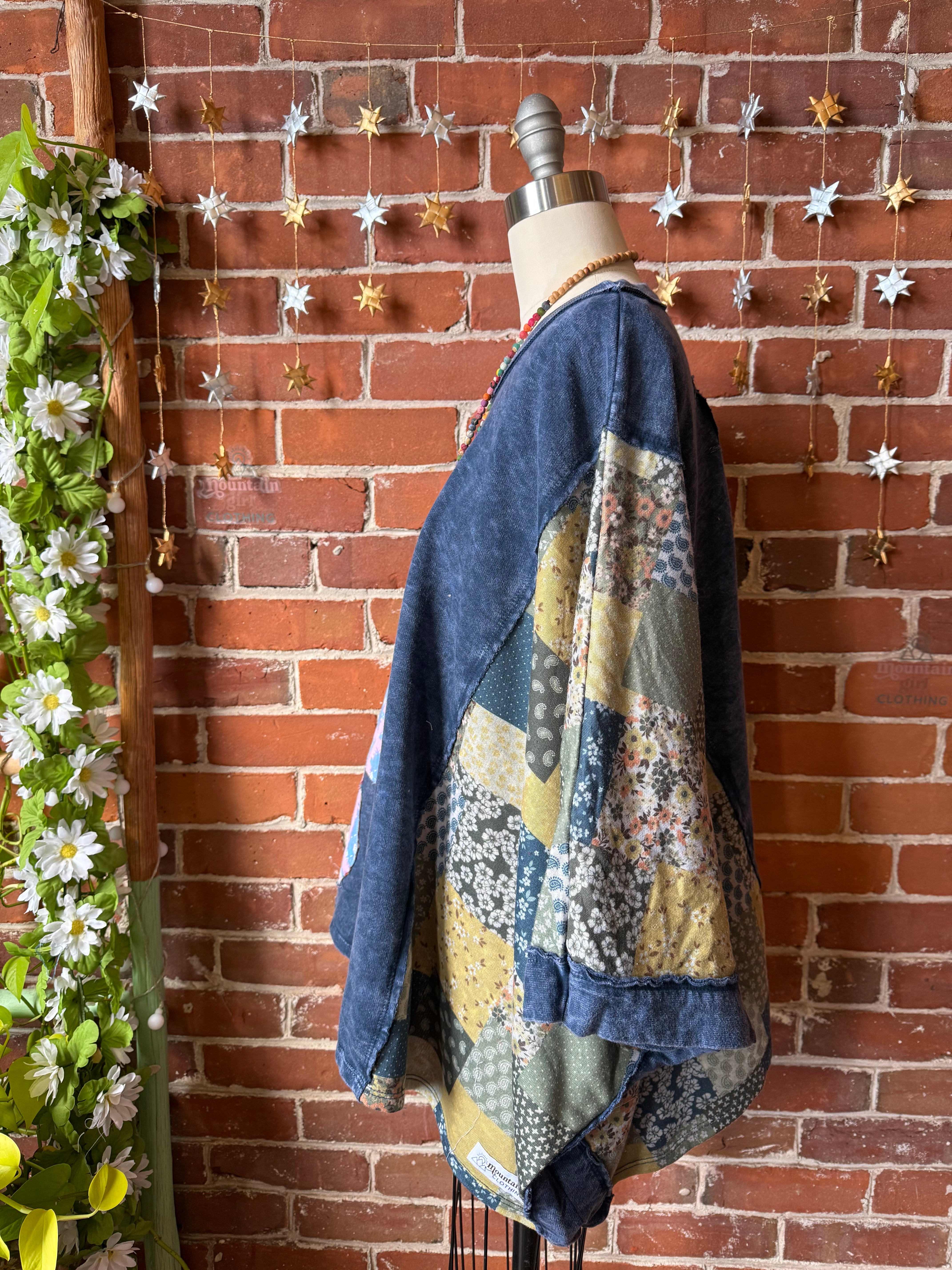 Upcycled flowy lightweight sweatshirt top and poncho sides with armholes.