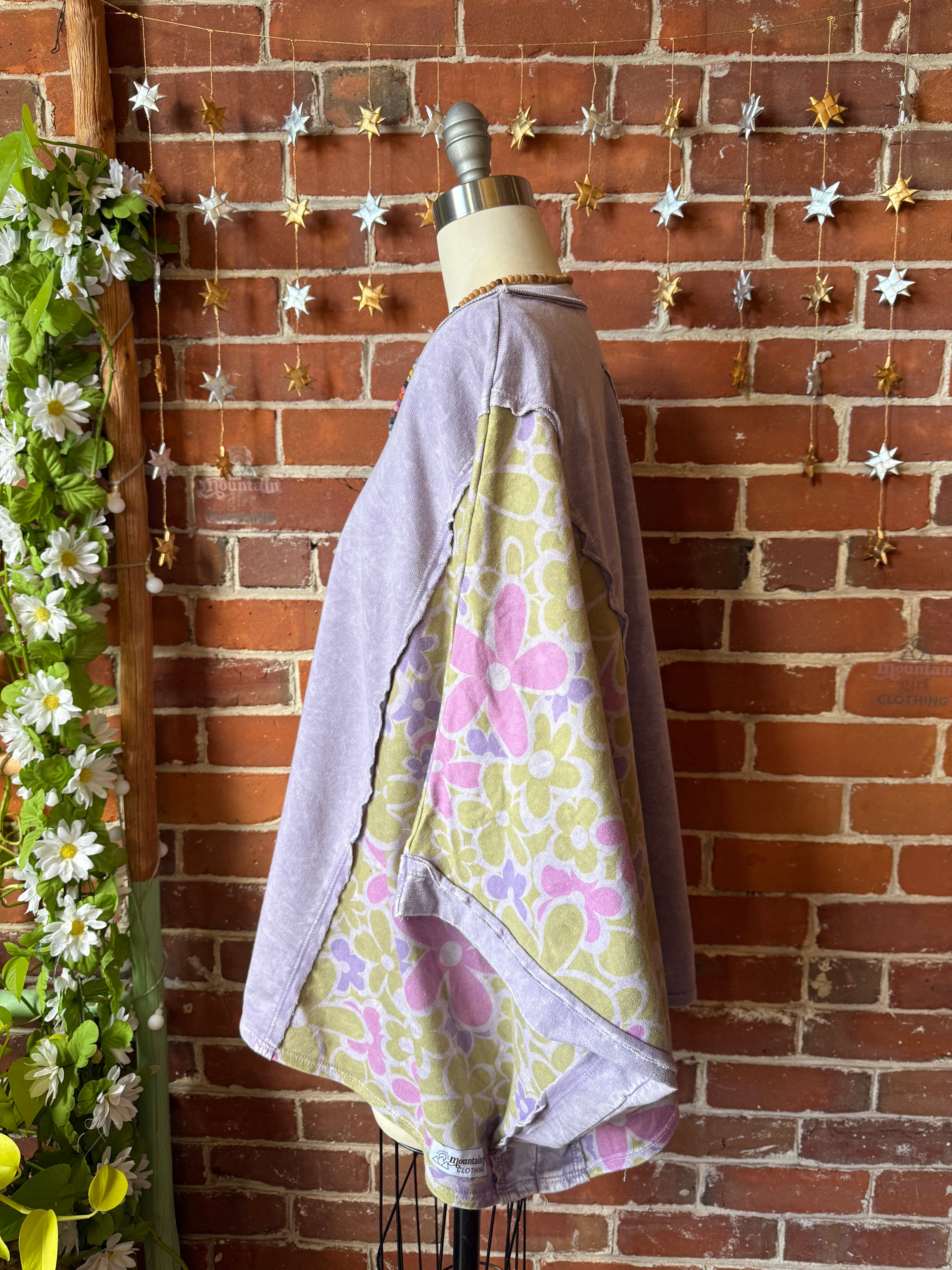 Upcycled flowy lightweight sweatshirt top and poncho sides with armholes.