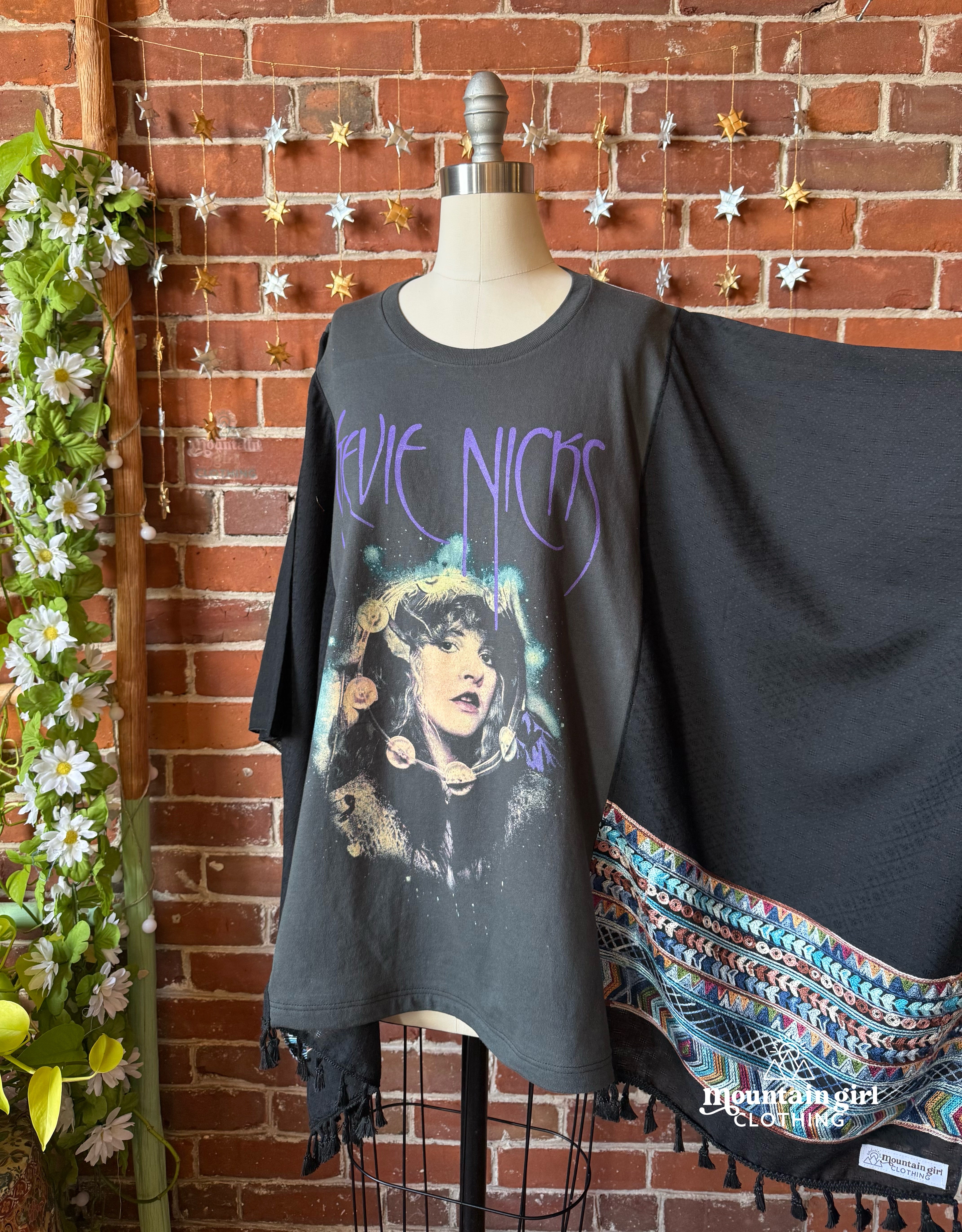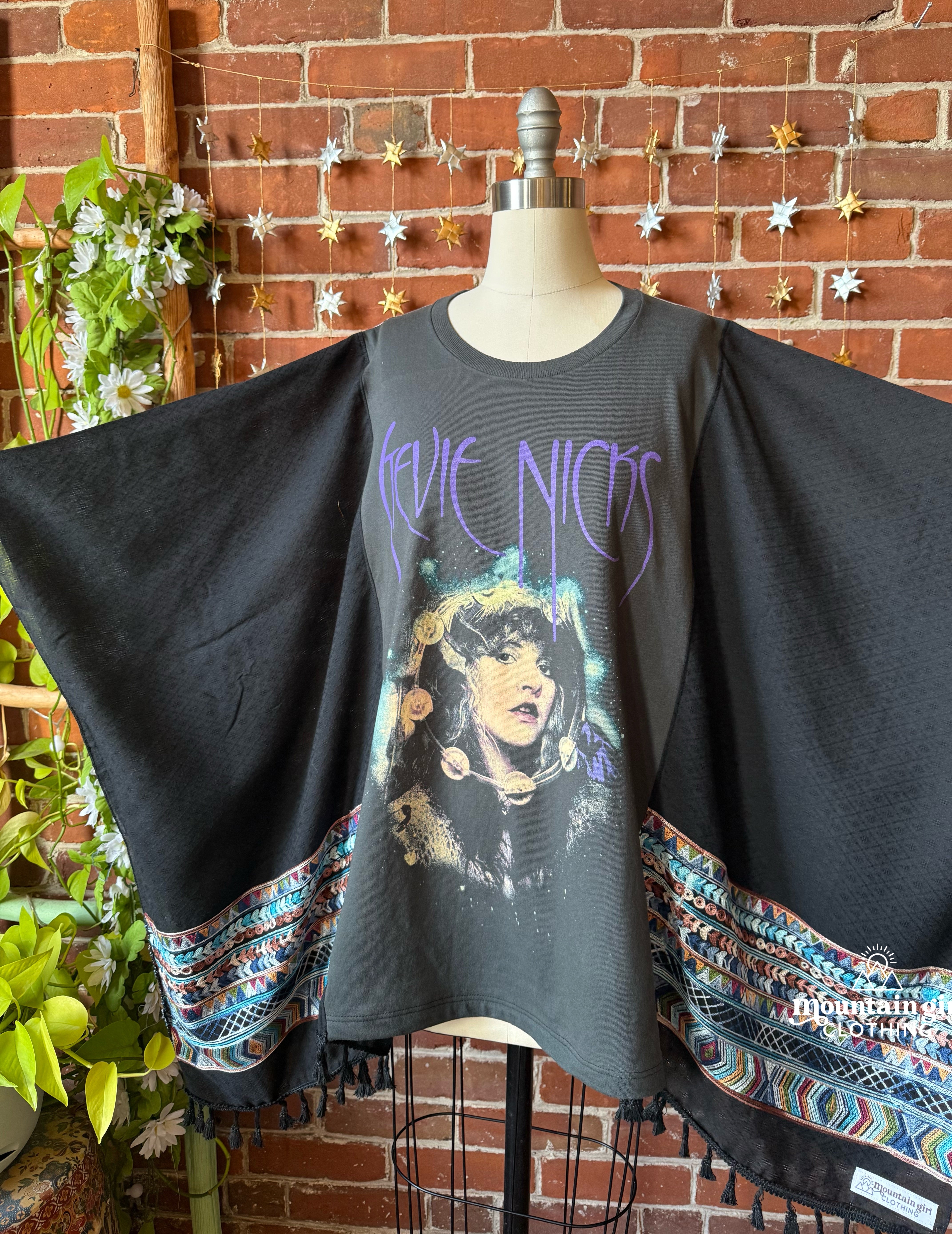 Unleash your inner gold dust woman with this unique Stevie Nicks inspired embroidered poncho. Made from an upcycled Stevie Nicks t-shirt and featuring soft, flowy poncho sleeves, this is a must-have for any die-hard Stevie Nicks fan. Perfect for concerts or everyday wear.
