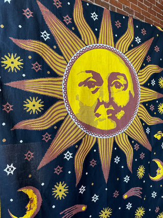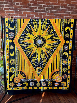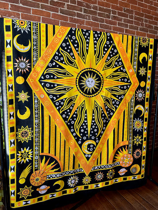 100% Cotton 90's inspired Golden Yellow Black Mandala Celestial Sun Moon Tapestry / Wall Hanging / Bedspread
