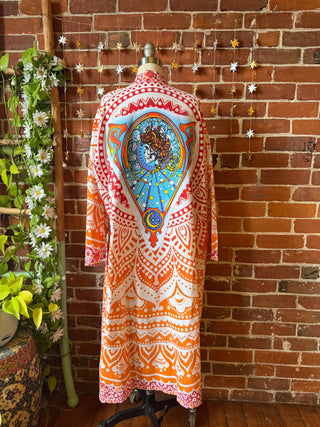 Grateful Inspired Upcycled Red + Yellow Mandala Long Tapestry Robe Kimono with Pockets and Belt