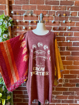 OOAK Winter Collection - Size Medium Upcycled Grow Together Mushroom Kantha Bell Sleeve T-shirt