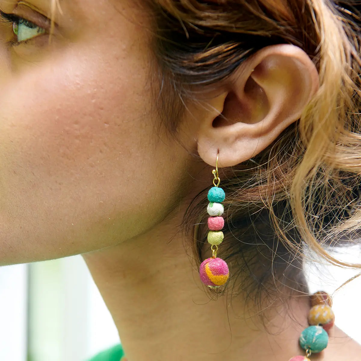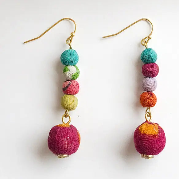 Four stacked Kantha textile beads are accented with a dangling statement bead to form this playful style. • Measures 2.25" long and finished with nickel and lead-free French ear wires. • Colors & patterns will vary due to repurposed textiles. • Sustainably handmade by women artisans in India.