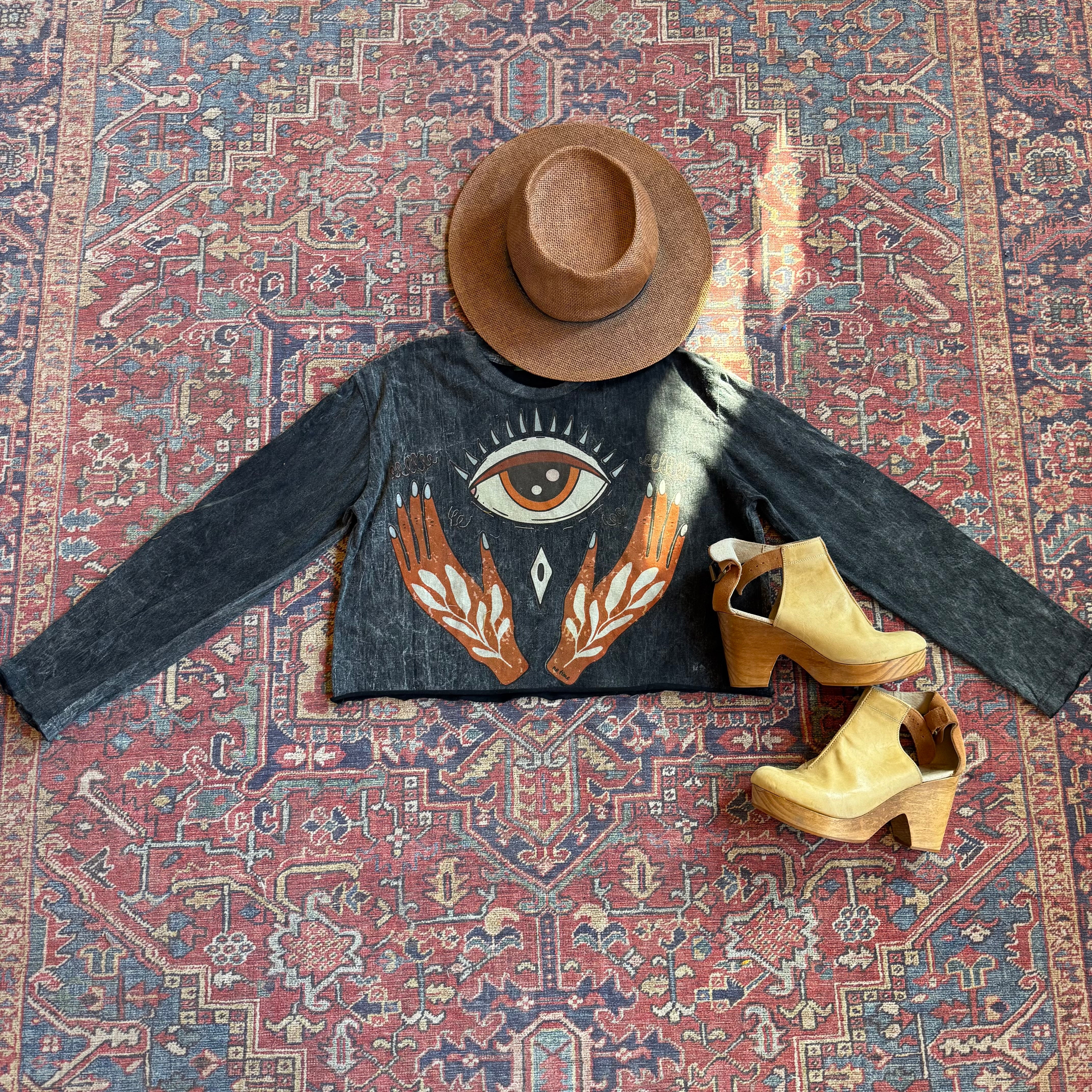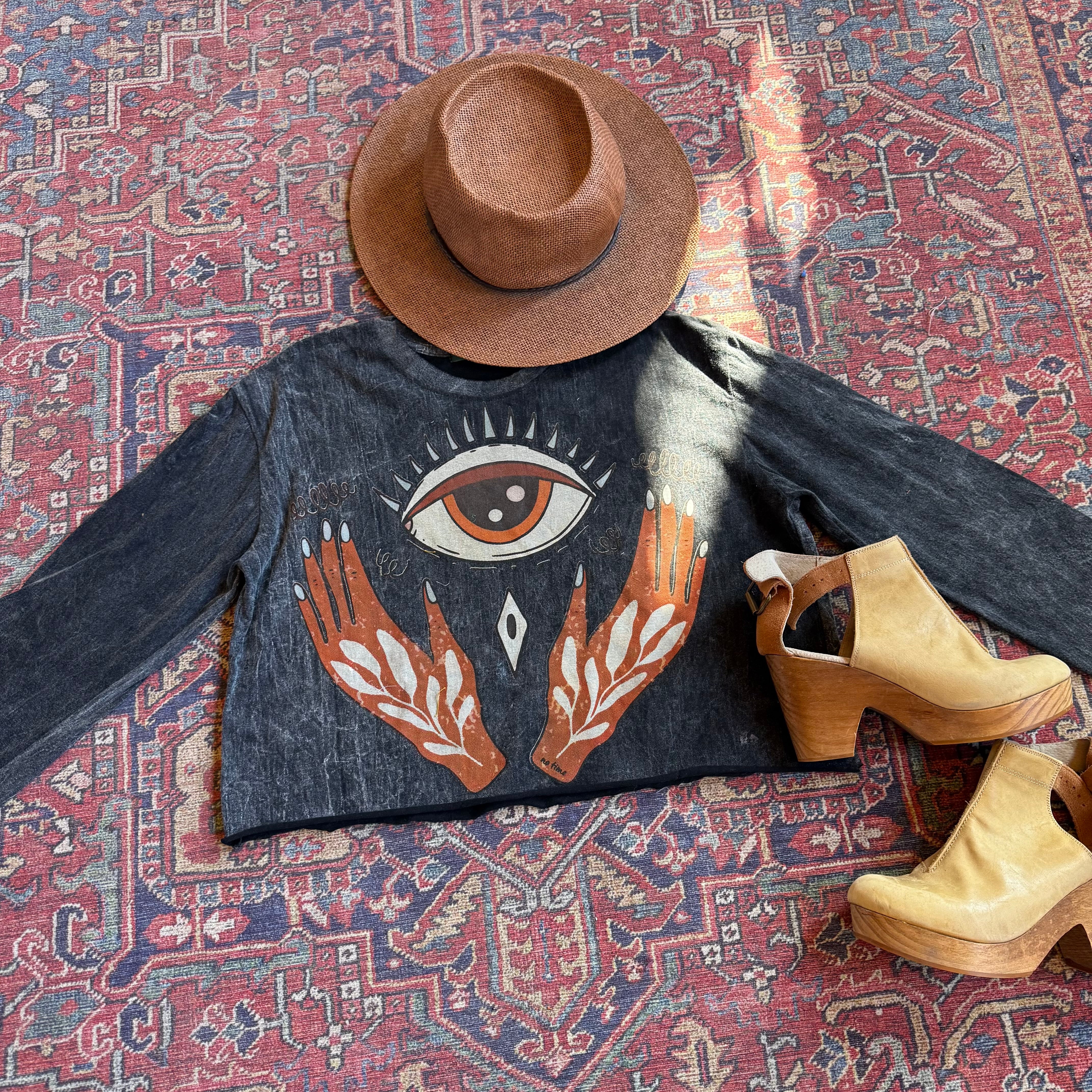 Soft 100% cotton, beautiful mystical eye print on the front.