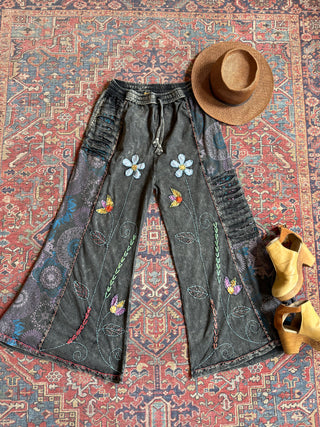 Embroidered Bohemian Spring Wide Leg Lounge Pants - Stone Gray 100% Cotton