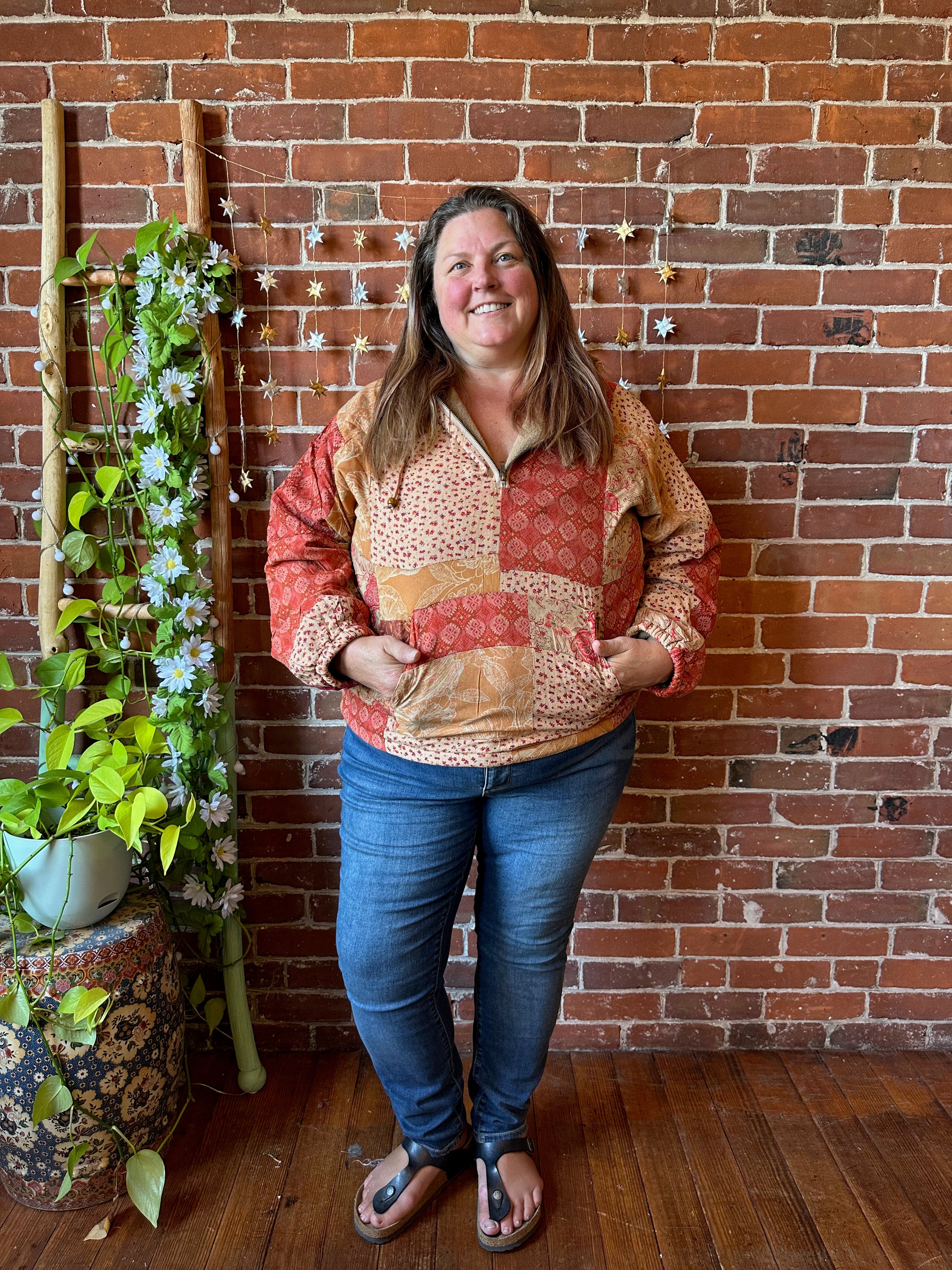 Embrace the bohemian aesthetic with this Patchwork pullover hoodie. Ideal for outdoor adventures in the fall.