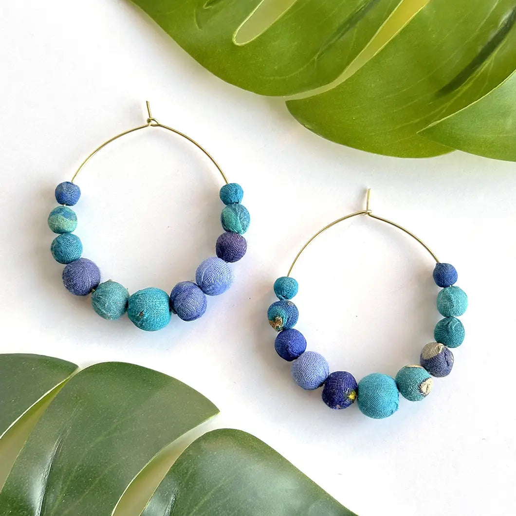 Graduated sizes of Kantha beads in brilliant shades of blue give these hoops a simple yet textured look. • Hoops measure 2.5″ long and 2.1" wide with a nickel-free and lead-free closure. • Colors & patterns will vary slightly due to repurposed textiles. • Sustainably handmade by women artisans in India.
