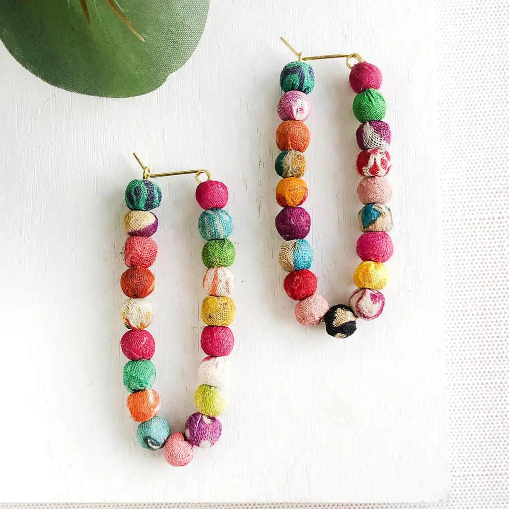 These elongated hoops feature a one-of-a-kind assortment of colorful Kantha textile beads. • Measures 2.5″ long, with nickel-free and lead-free wire closure. • Colors & patterns will vary due to repurposed textiles. • Sustainably handmade by women artisans in India.