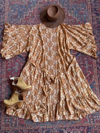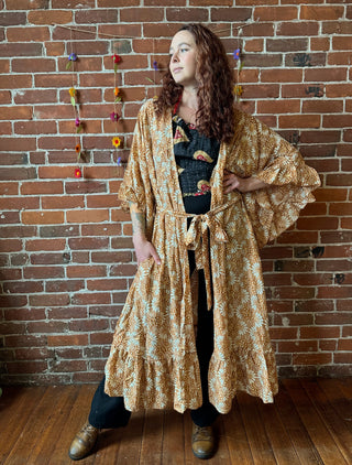 Long Garden Goddess Ruffle Kimono - Golden + Brown Sari
