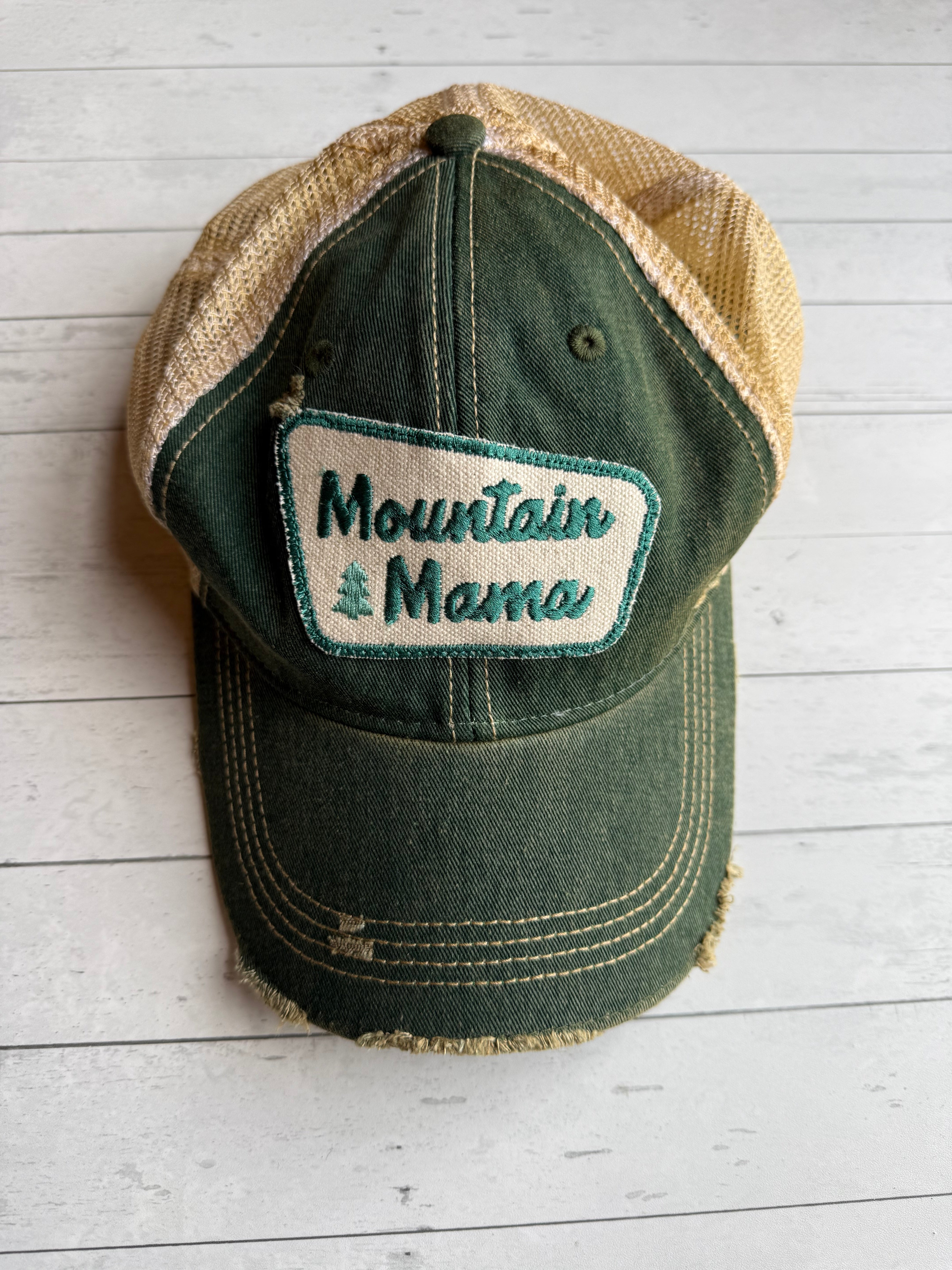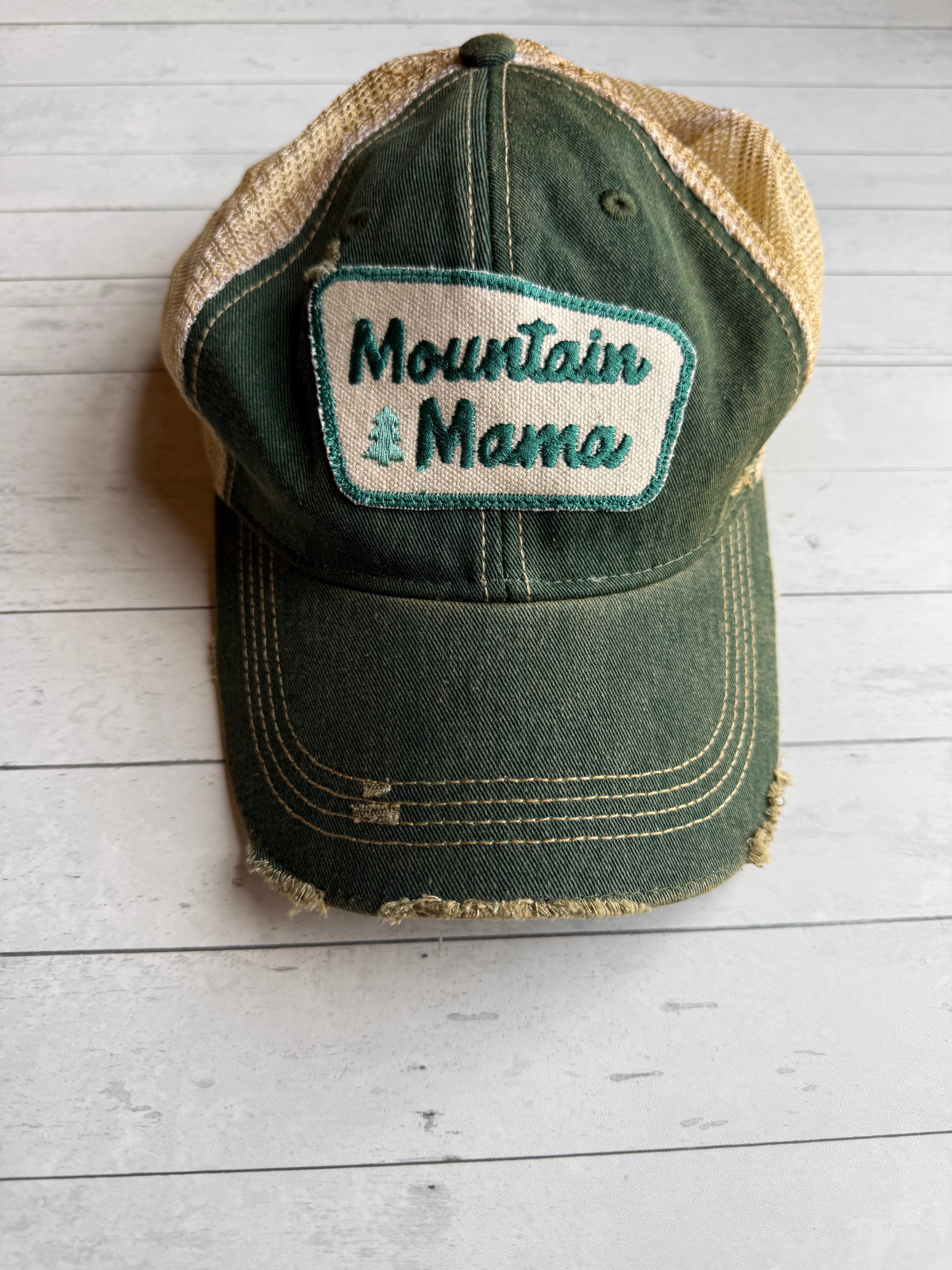 Add a touch of boho to your outfit. This one of a kind distressed trucker hat features an embroidered patch on the front, adding a pop of color and personality to any casual look. The soft mesh back and adjustable snapback closure ensure a comfortable and secure fit for all-day wear.