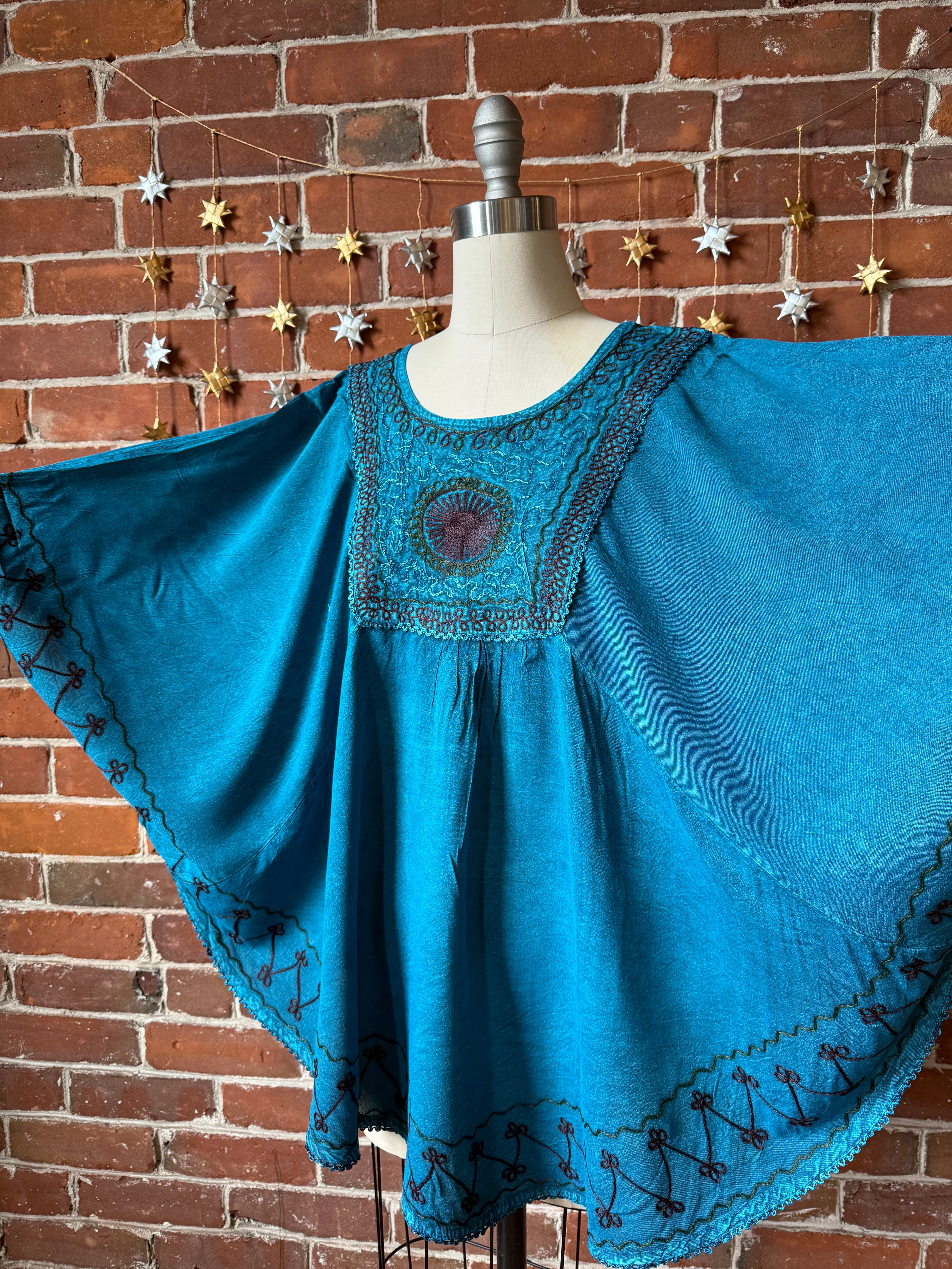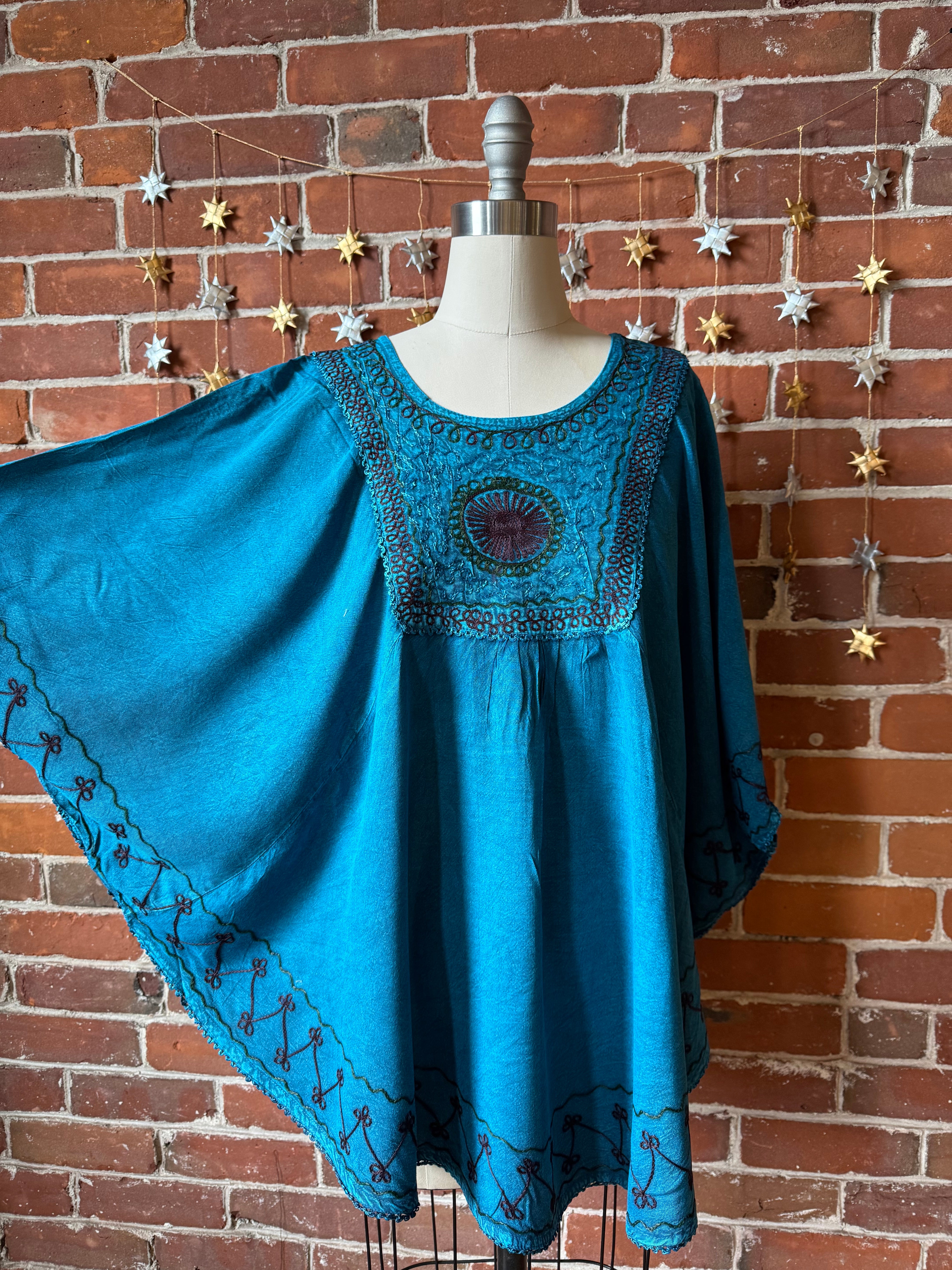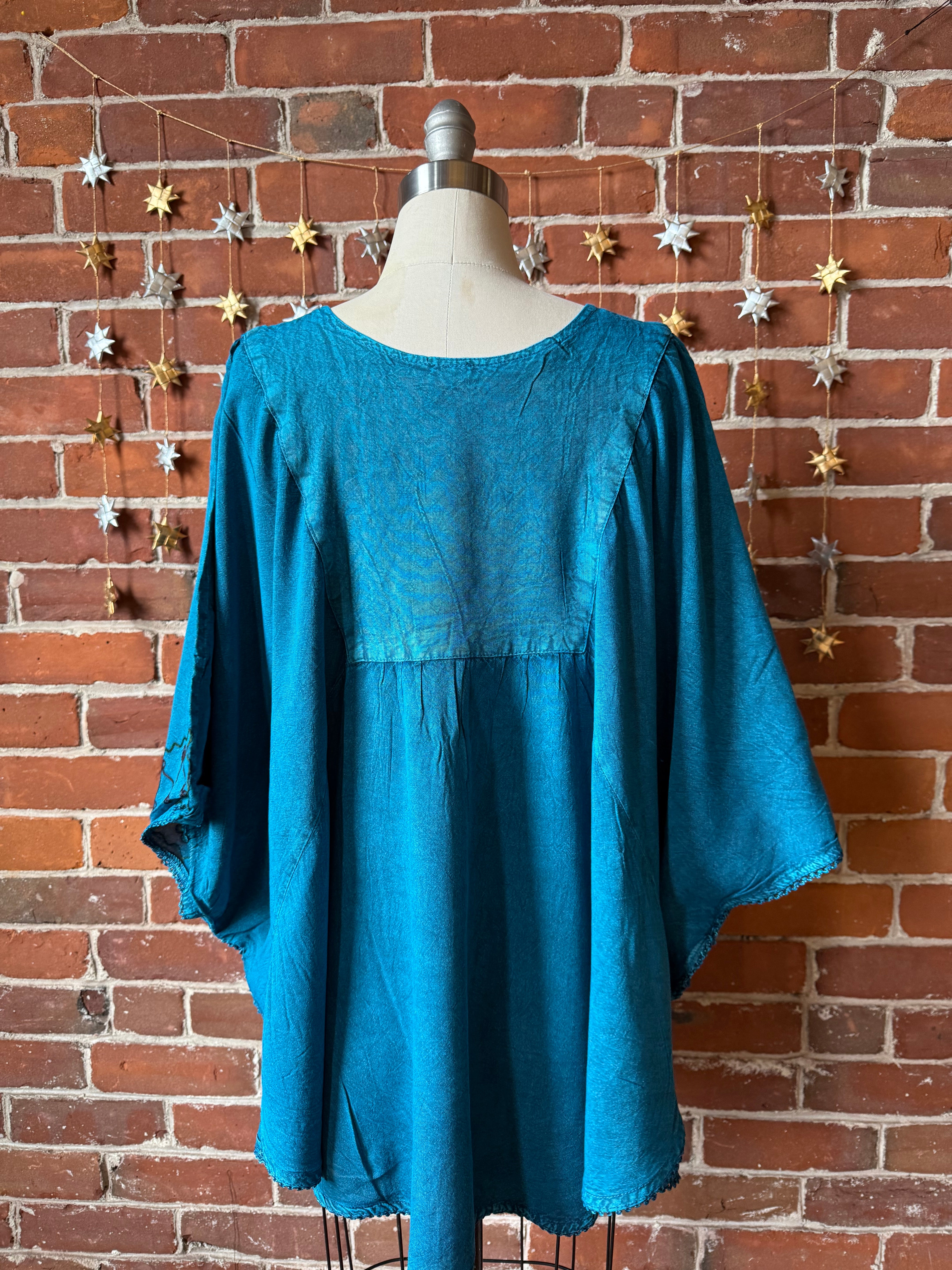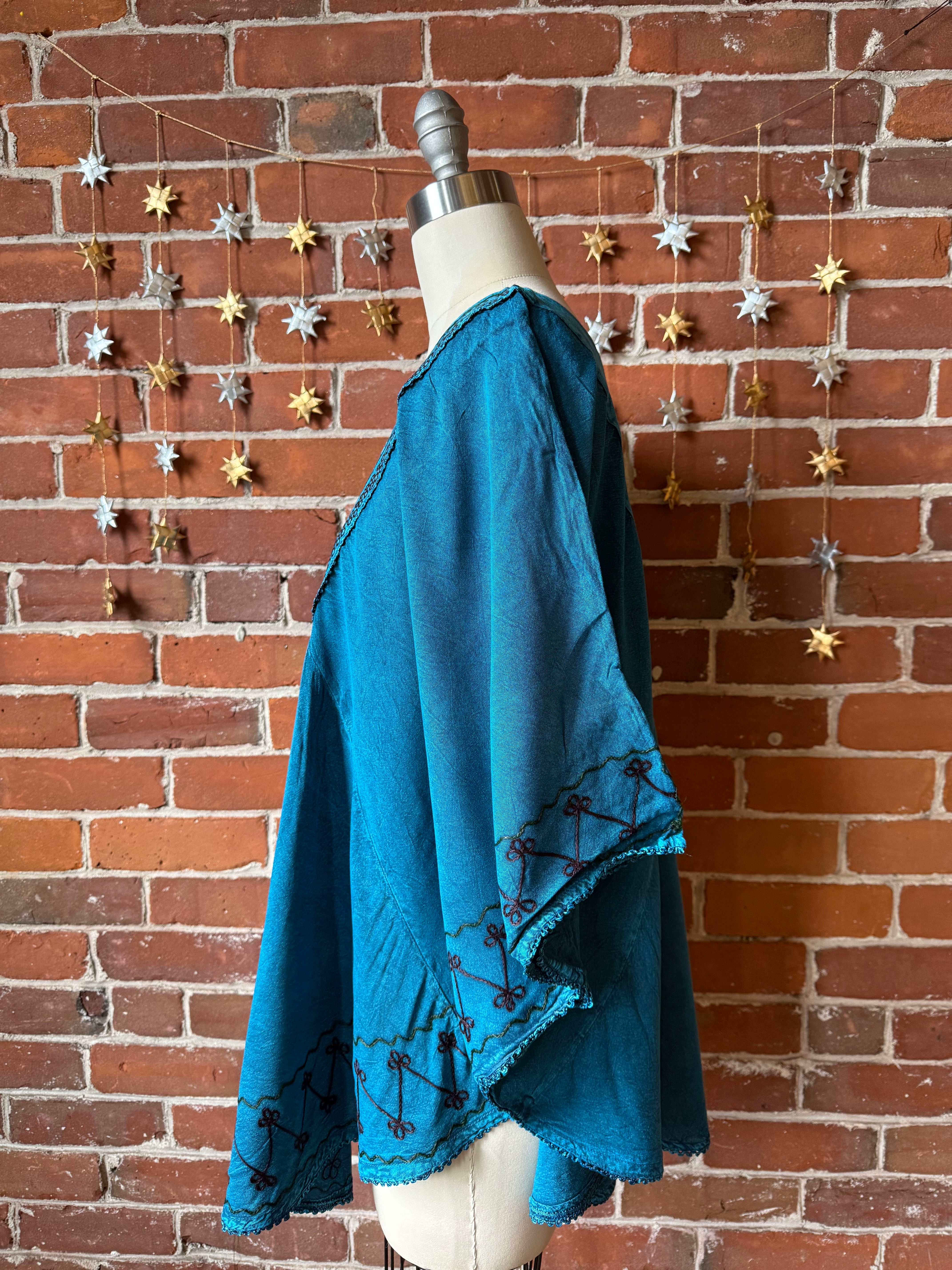 Hannah Embroidered Poncho Capelet Top - Stone Washed Teal