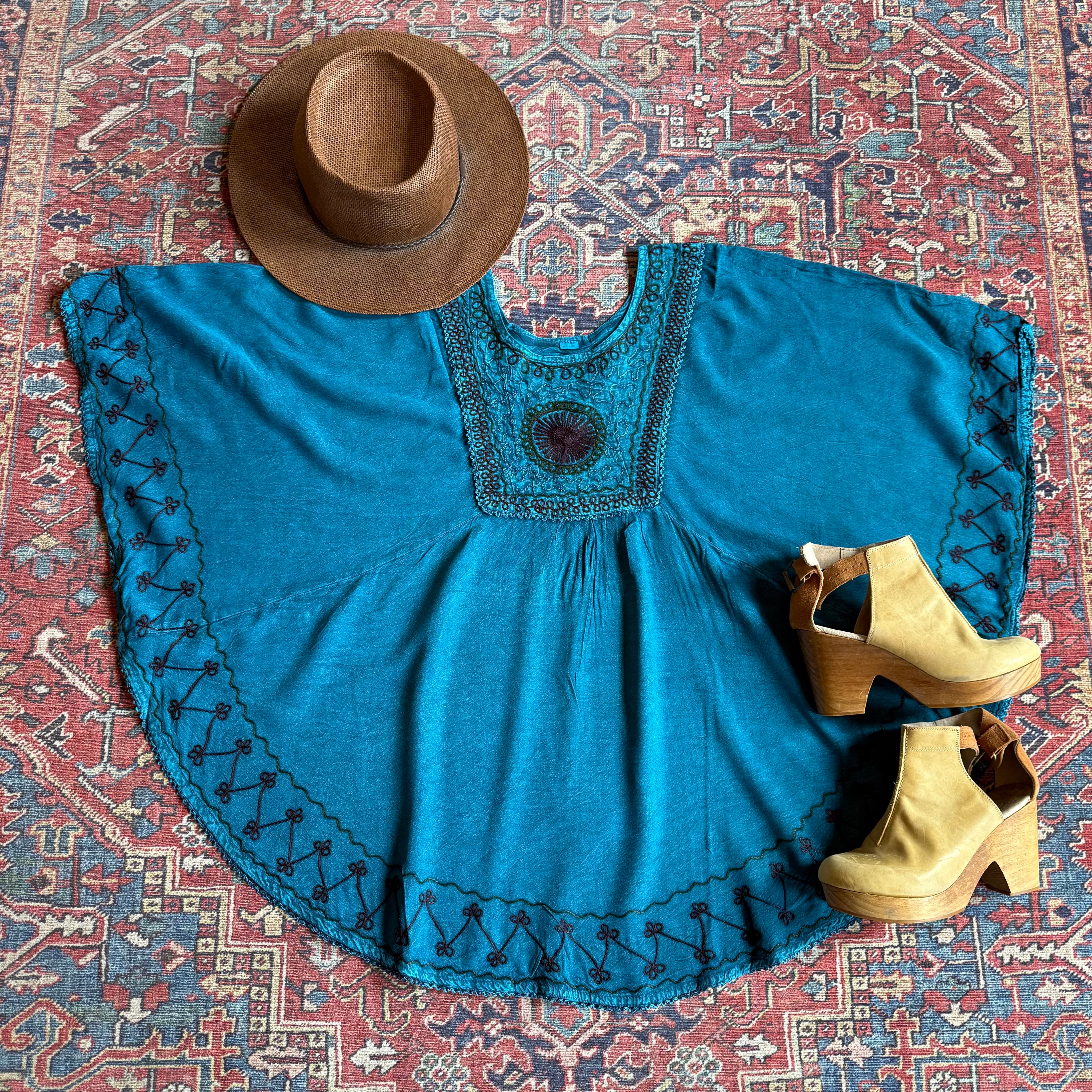 Beautiful intricate hand embroidery for this super cool groovy hippie cape style shirt. Lots of room to frolic & flow / twist & twirl!