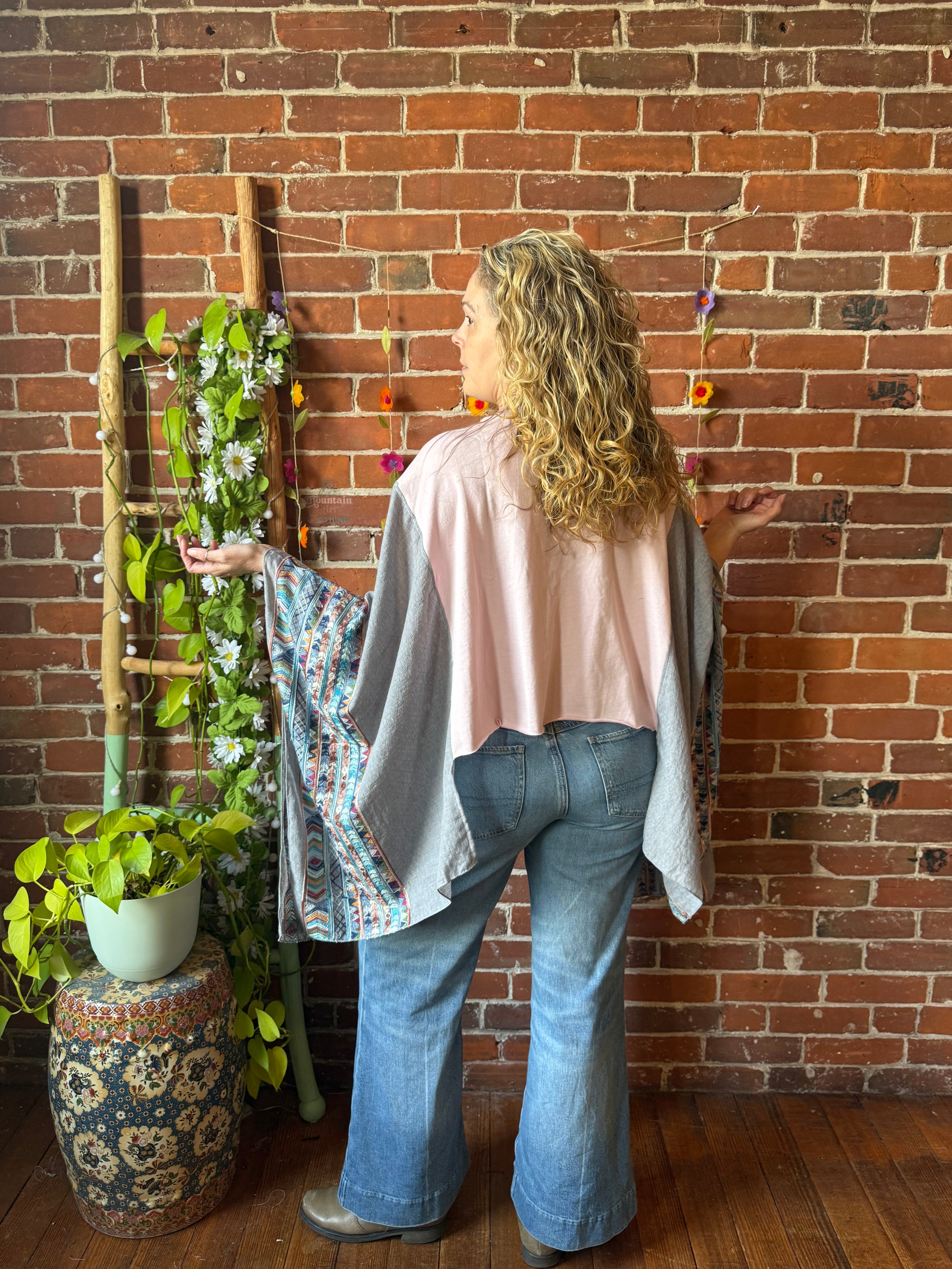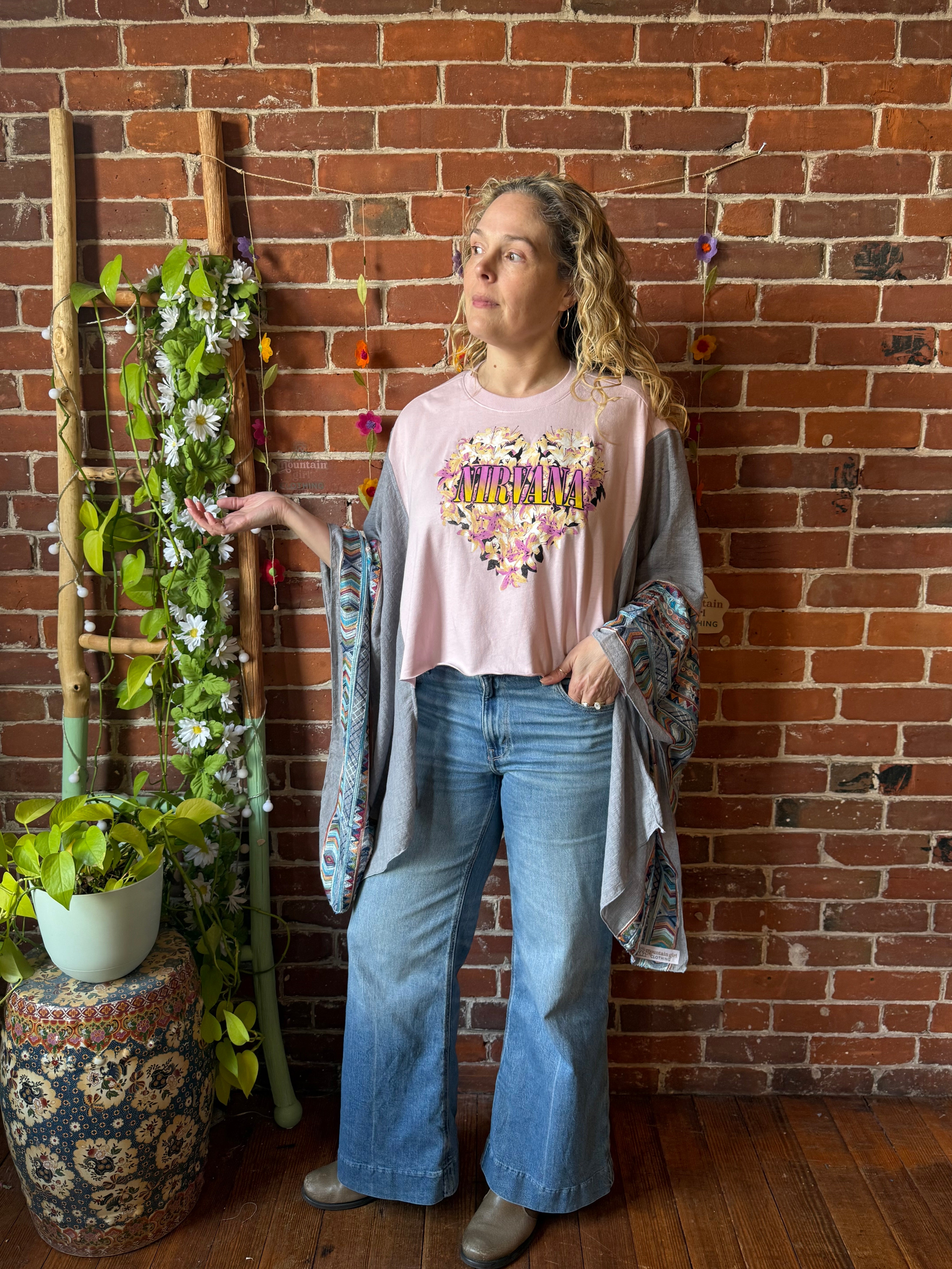 Unleash your 90s era with this unique NIrvin’s inspired embroidered poncho. Made from an upcycled Nirvana tshirt and featuring soft, flowy poncho sleeves, this is a must-have for any die-hard grunge fan. Perfect for concerts or everyday wear.