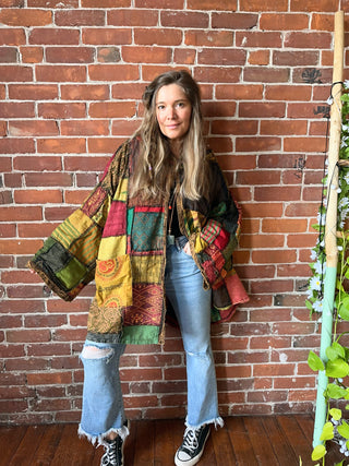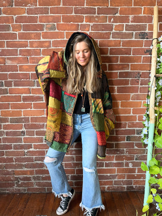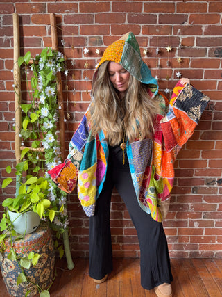 OOAK Autumn Collection- Birdsong Floral Wing Style Kantha Poncho Hoodie Jacket