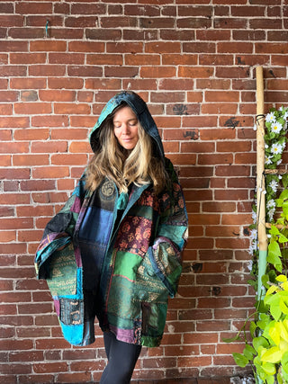 Sierra Dreams Patchwork Upcycled Cotton Kantha Poncho Tunic Hoodie - Fair Trade Made