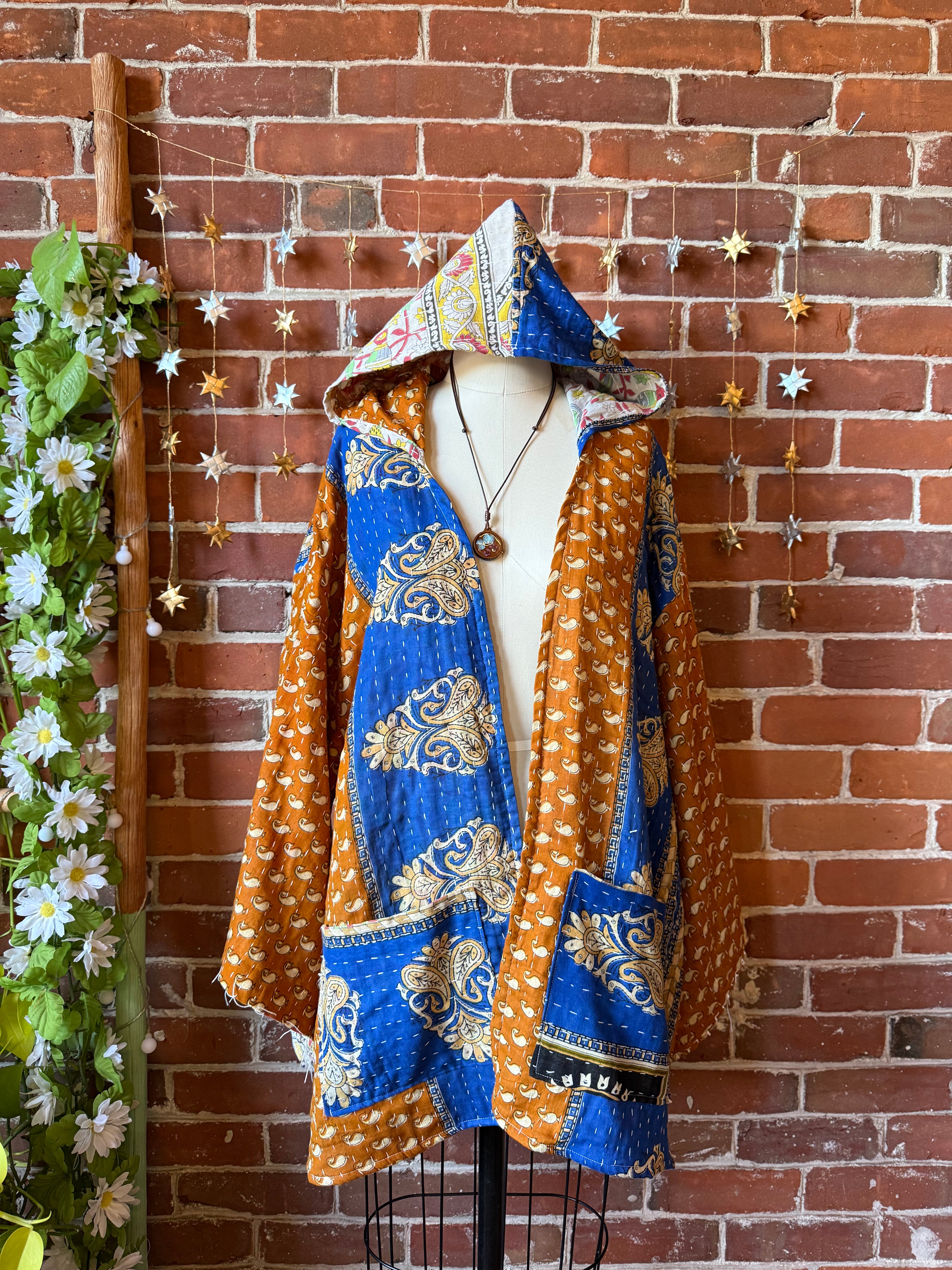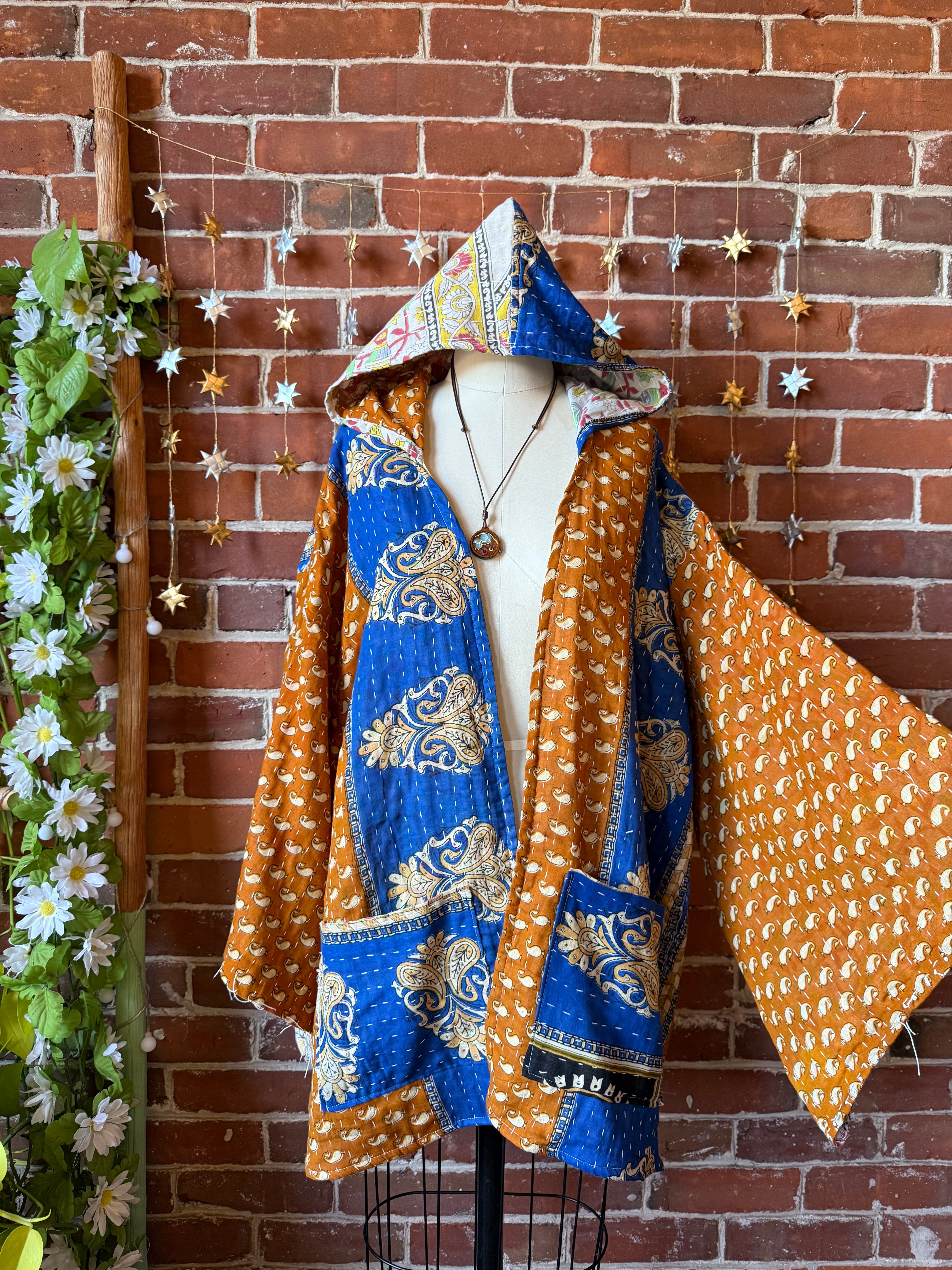 Upcycled vintage kantha with a cascade sides, bell sleeves hoodie and two pockets in the front