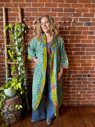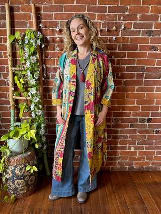 Solstice Stroll Patchwork Batwing Sleeve Kimono Layer - Dark Earth Tones -Fair Trade Made