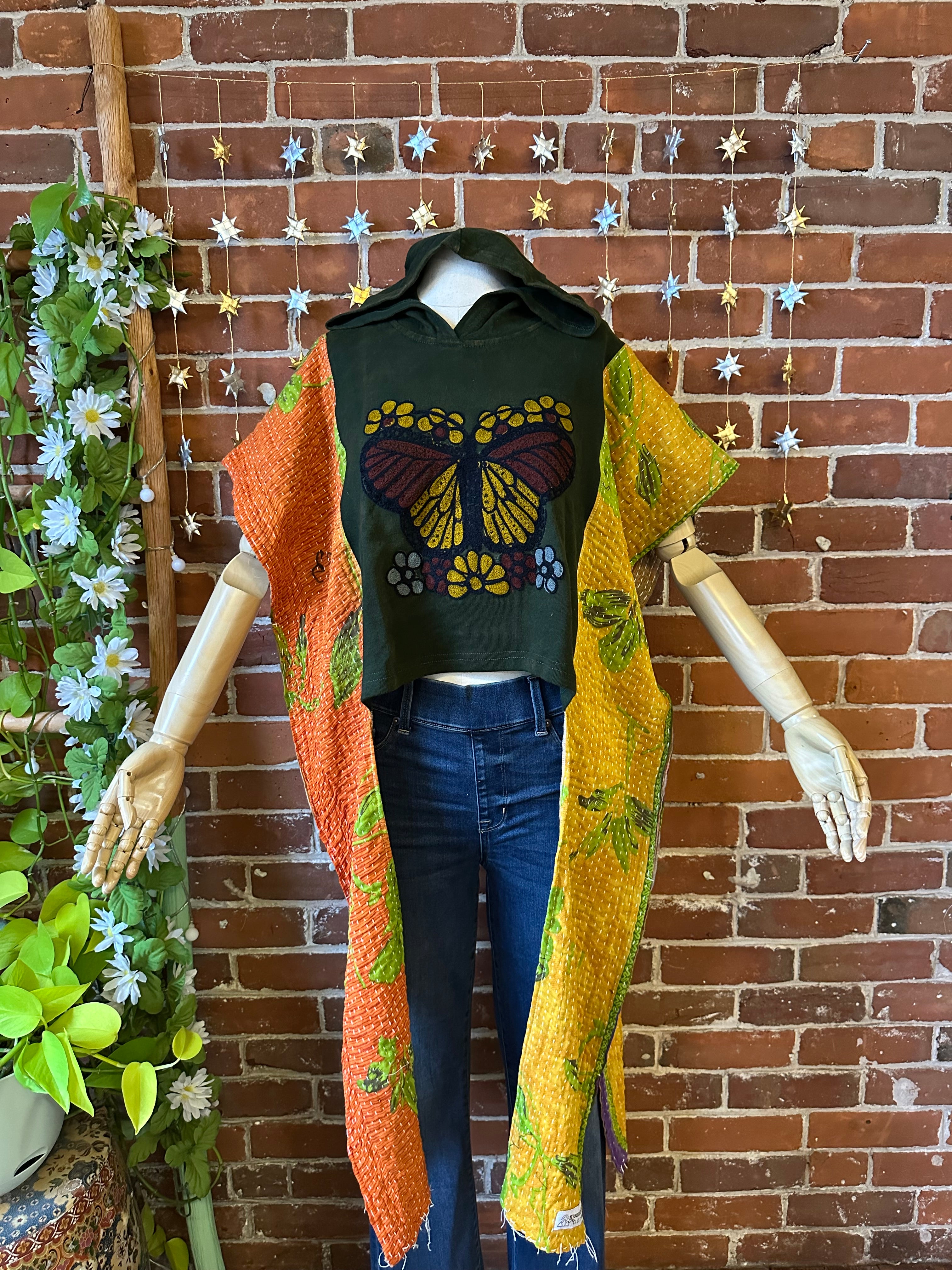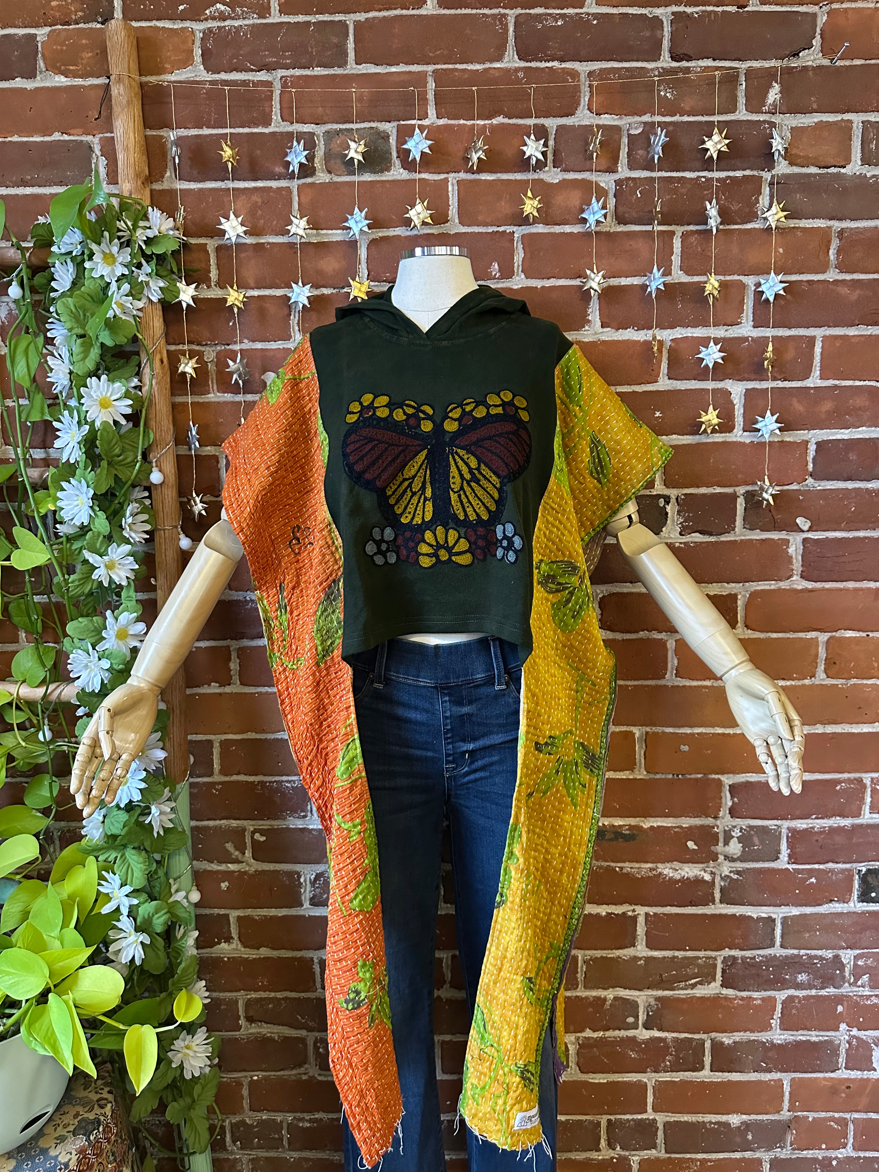 OOAK Autumn Collection - Upcycled Embroidered Butterfly Cropped Hybrid Hi Lo Kantha Hoodie