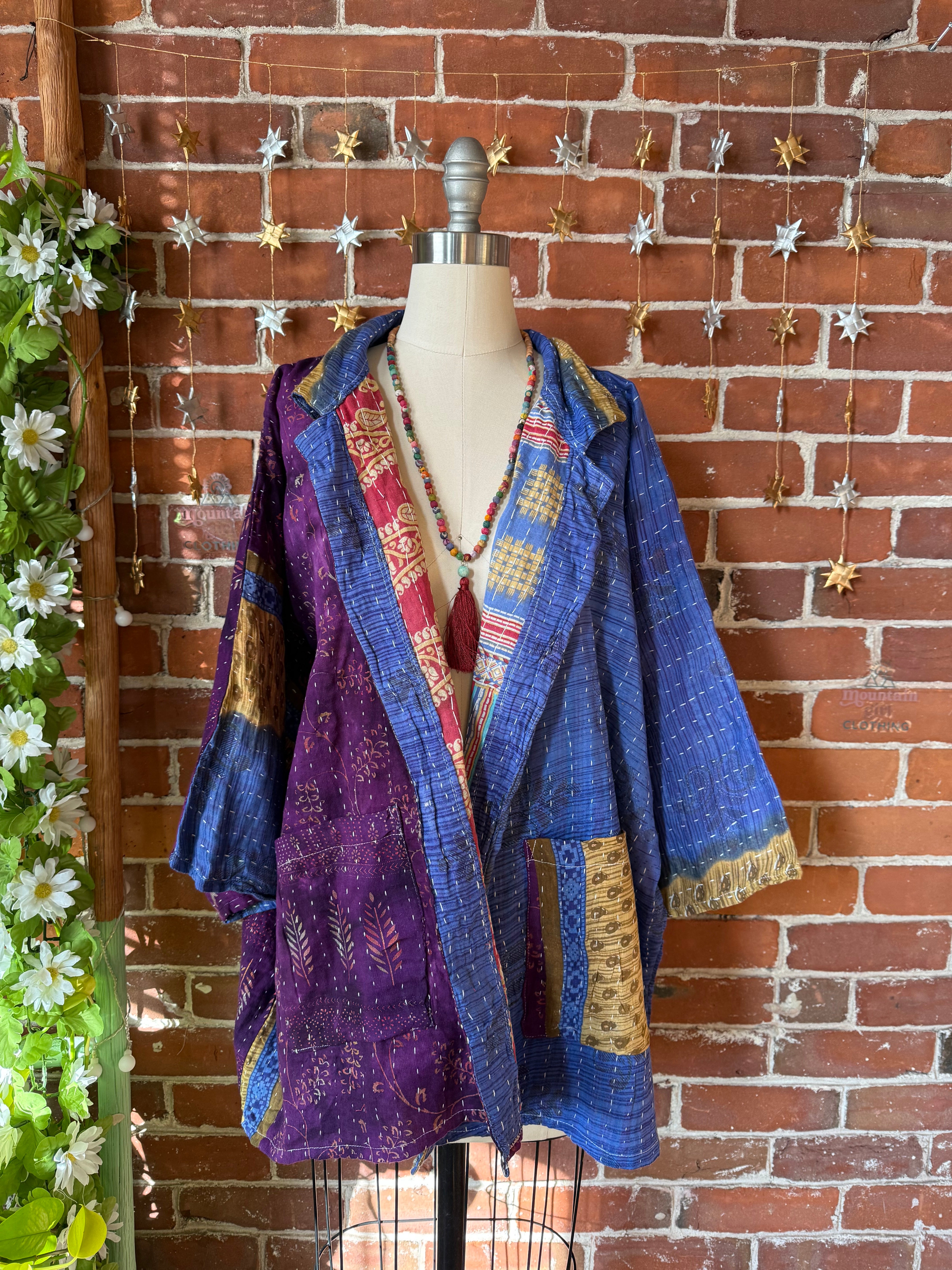 Soft lightweight Kantha jacket with collar and pockets at each side.
