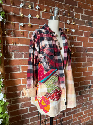 OOAK Autumn Collection - Unisex Size Medium Upcycled Flower Patchwork Bleach Button Up Flannel
