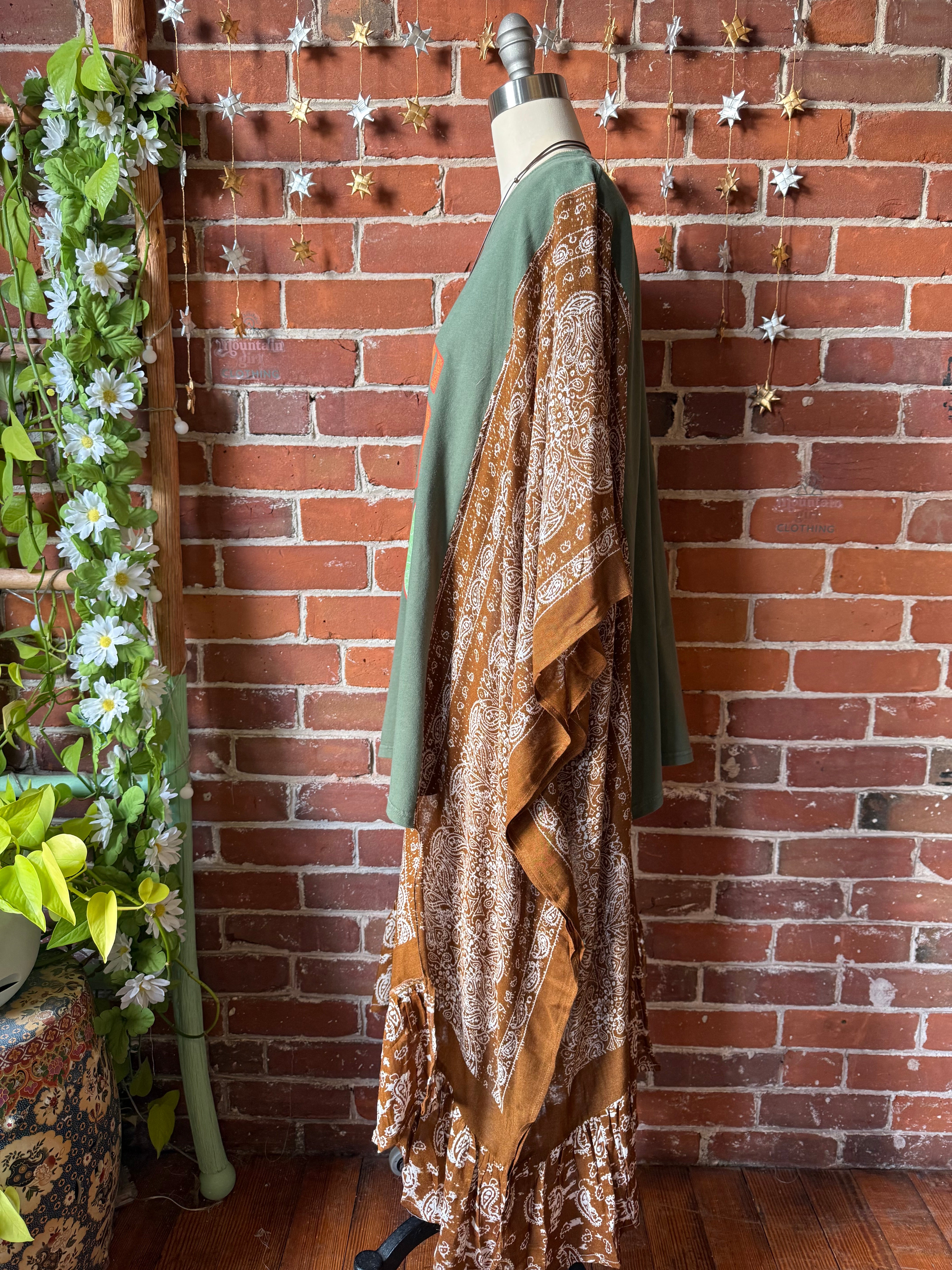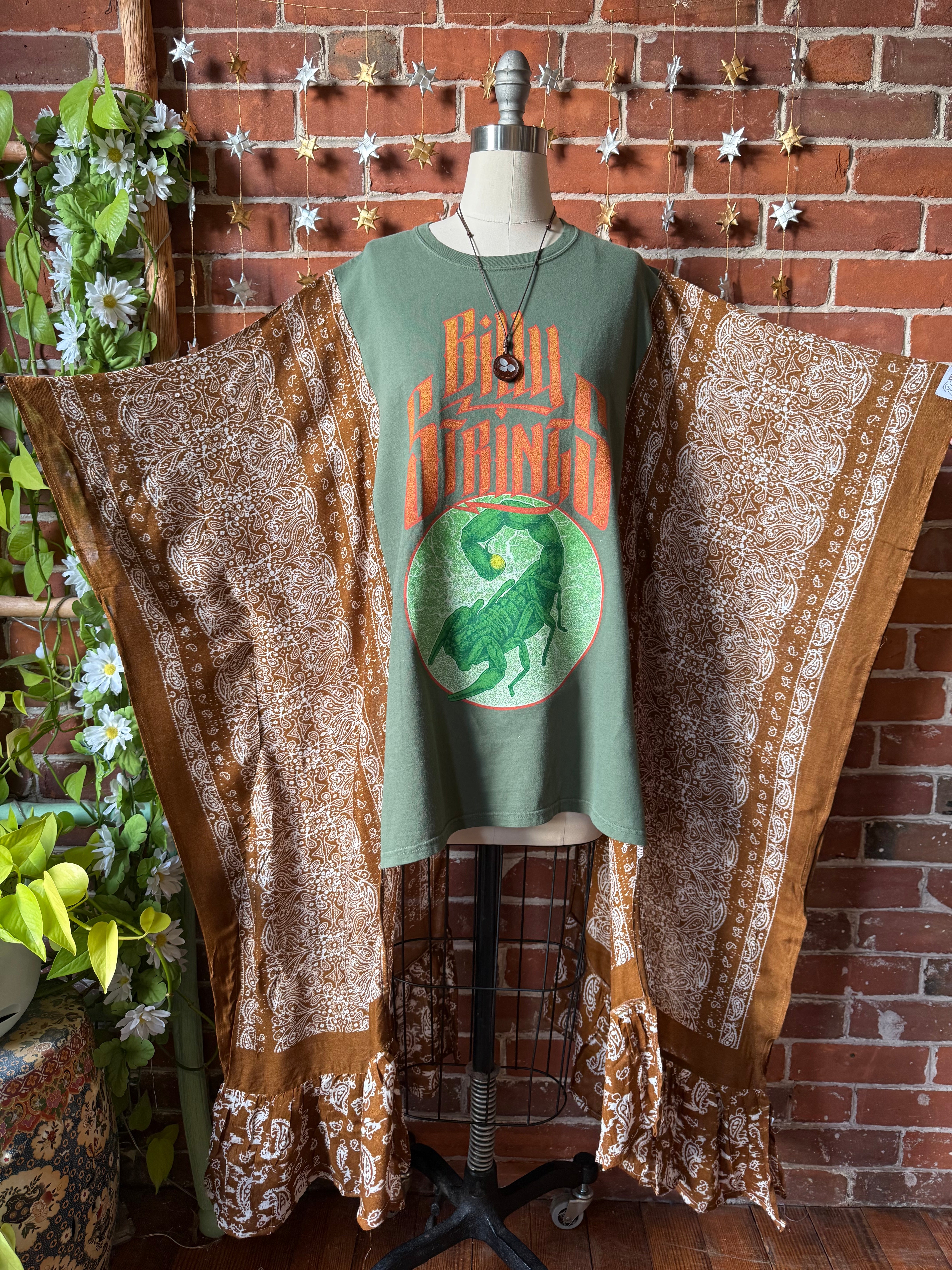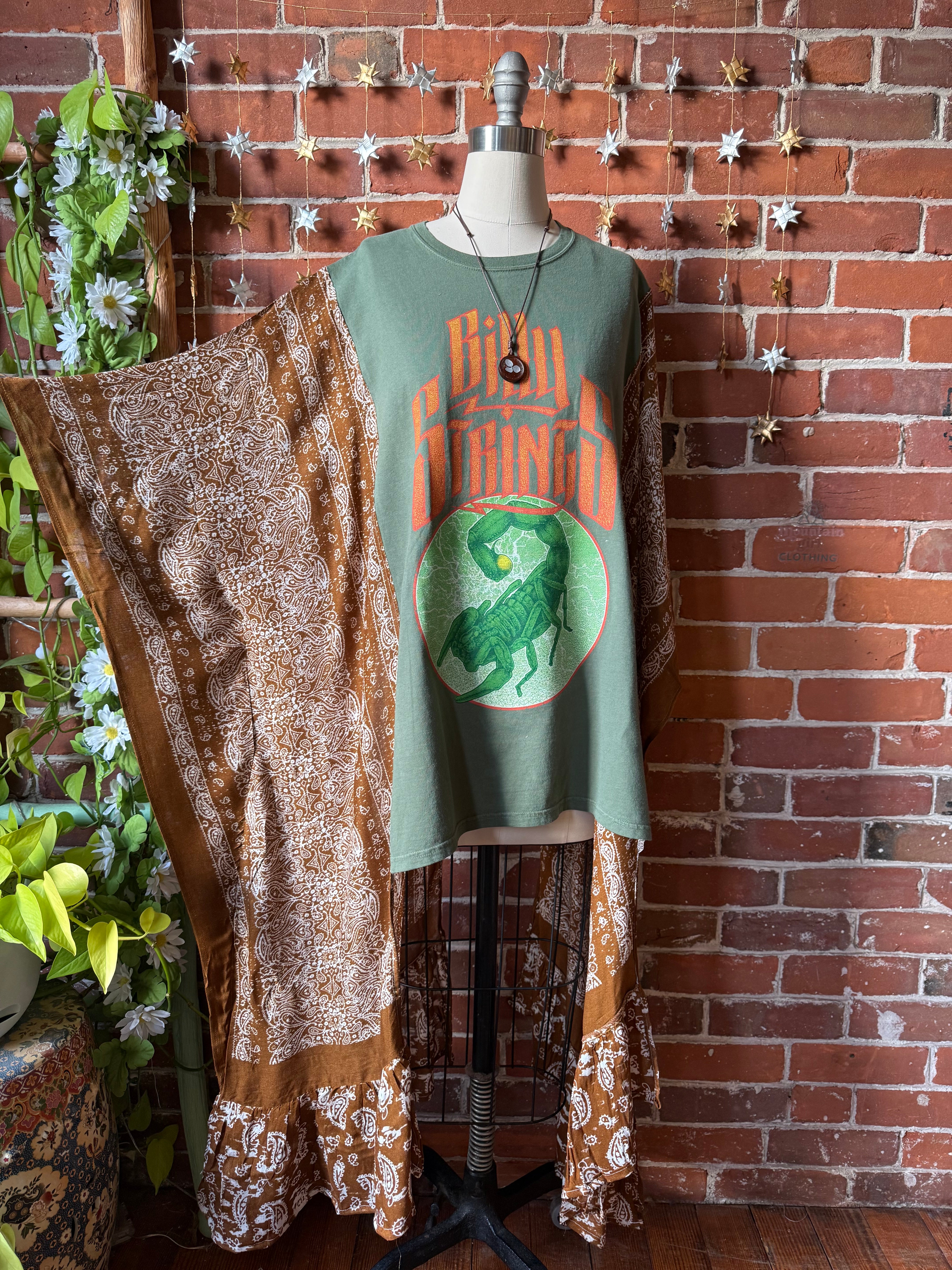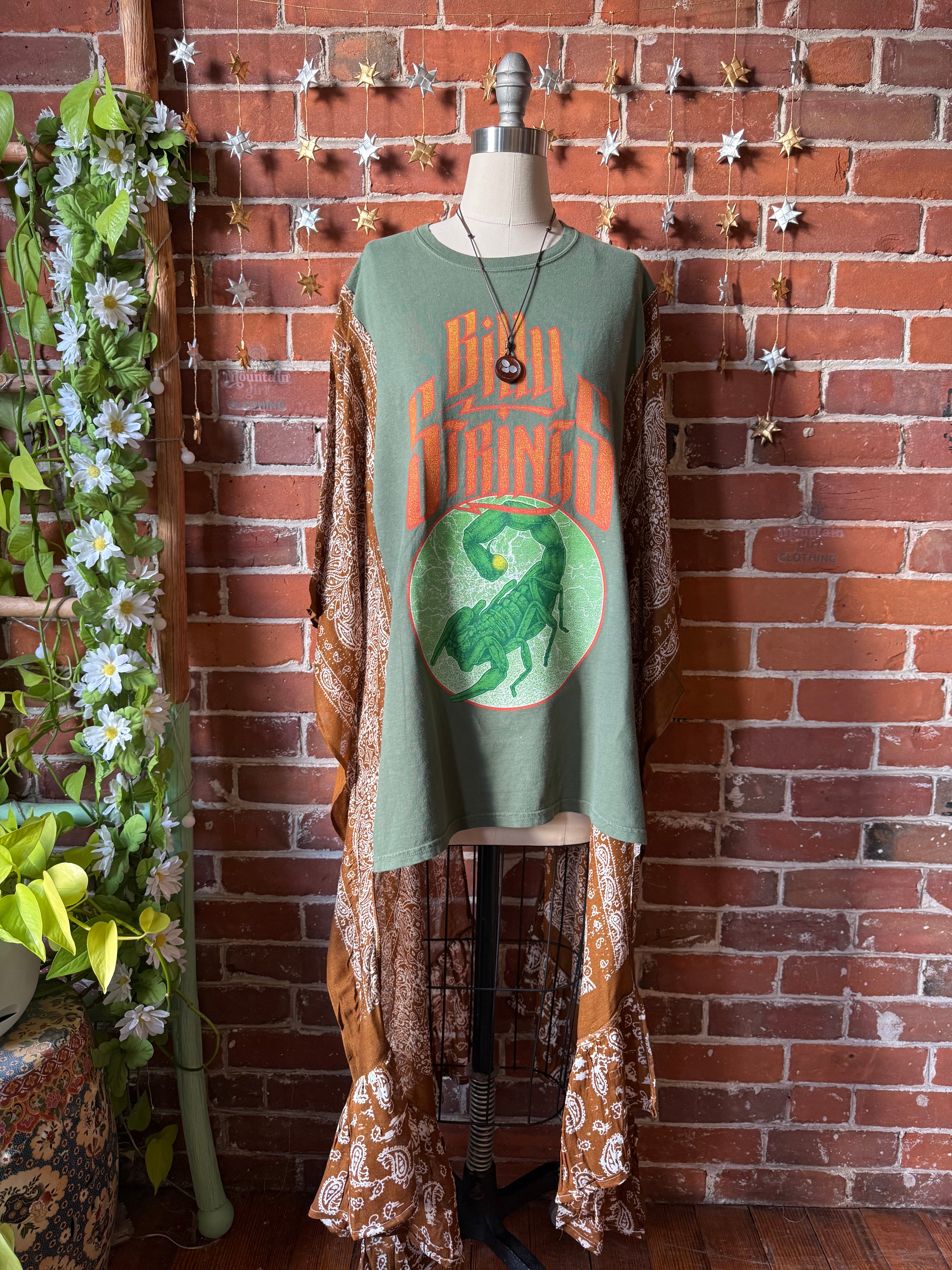 Channel your inner bluegrass queen with this Billy Strings inspired hybrid hi lo top. Handmade with love, this boho chic top features a unique tie dye pattern and a flowy fit that is perfect for all seasons. The hi lo hem adds a touch of drama to your outfit, making it perfect for concerts, festivals, or just adding a bit of country flare to your everyday style.
