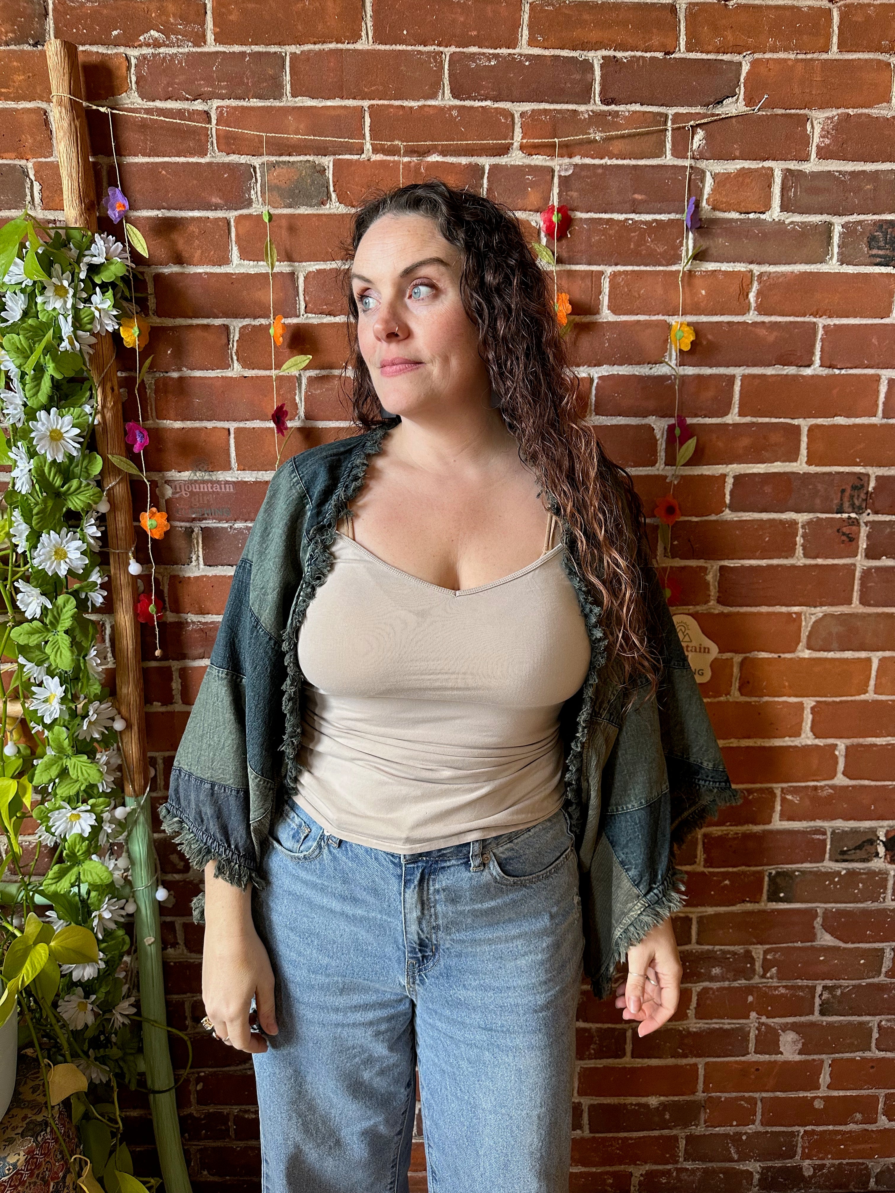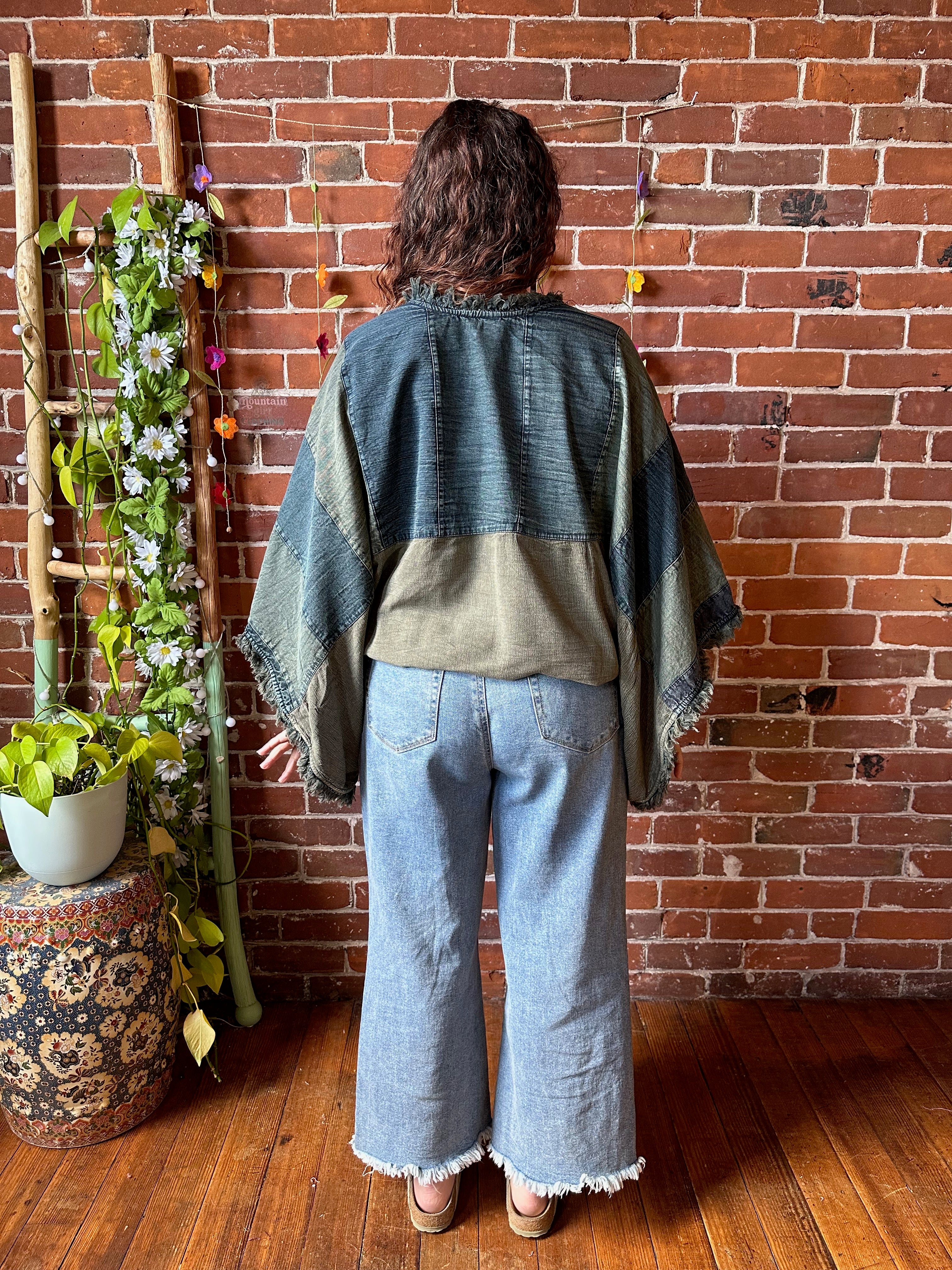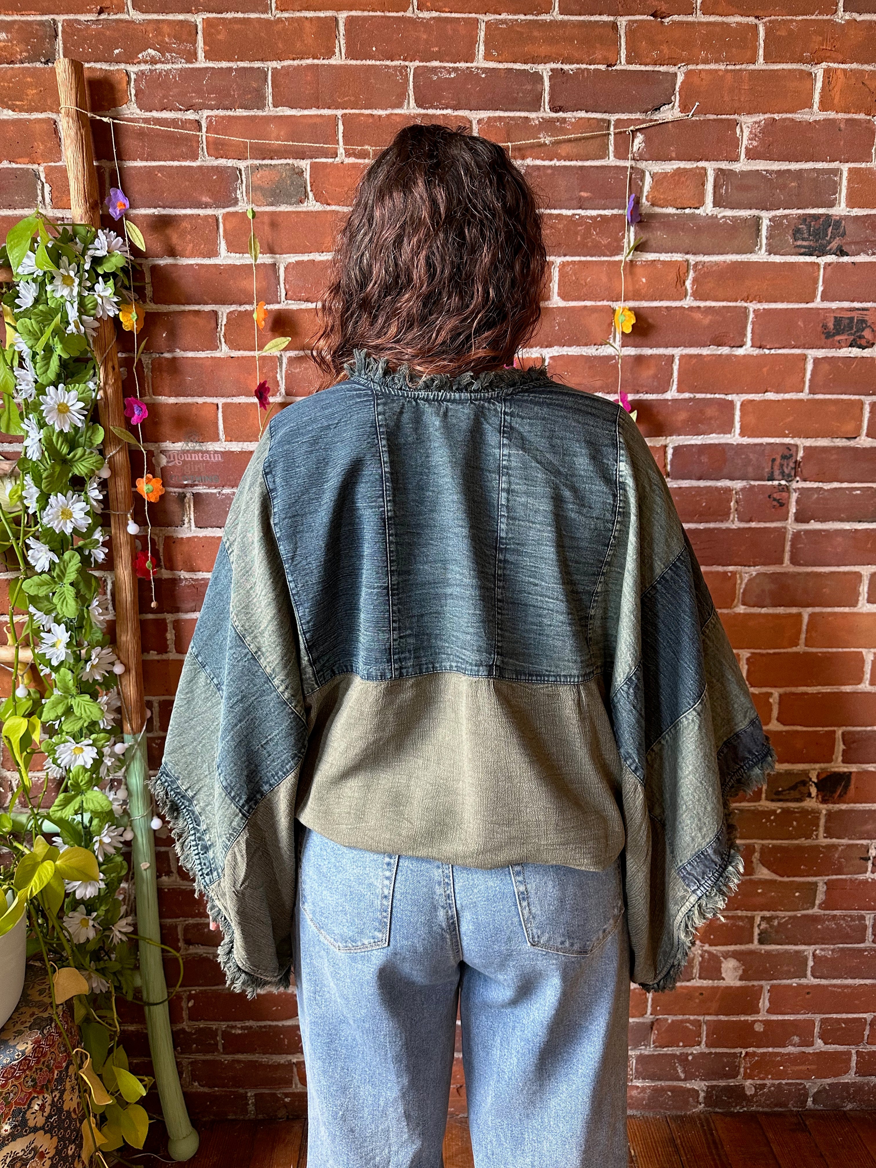 Wrap yourself in versatile style and comfort with the denim mosaic patchwork cocoon wrap. This unique piece is one of a kind with gorgeous floral patterns. The cocoon style wrap shawl features armholes at the sides for easy wear with a bohemian touch.