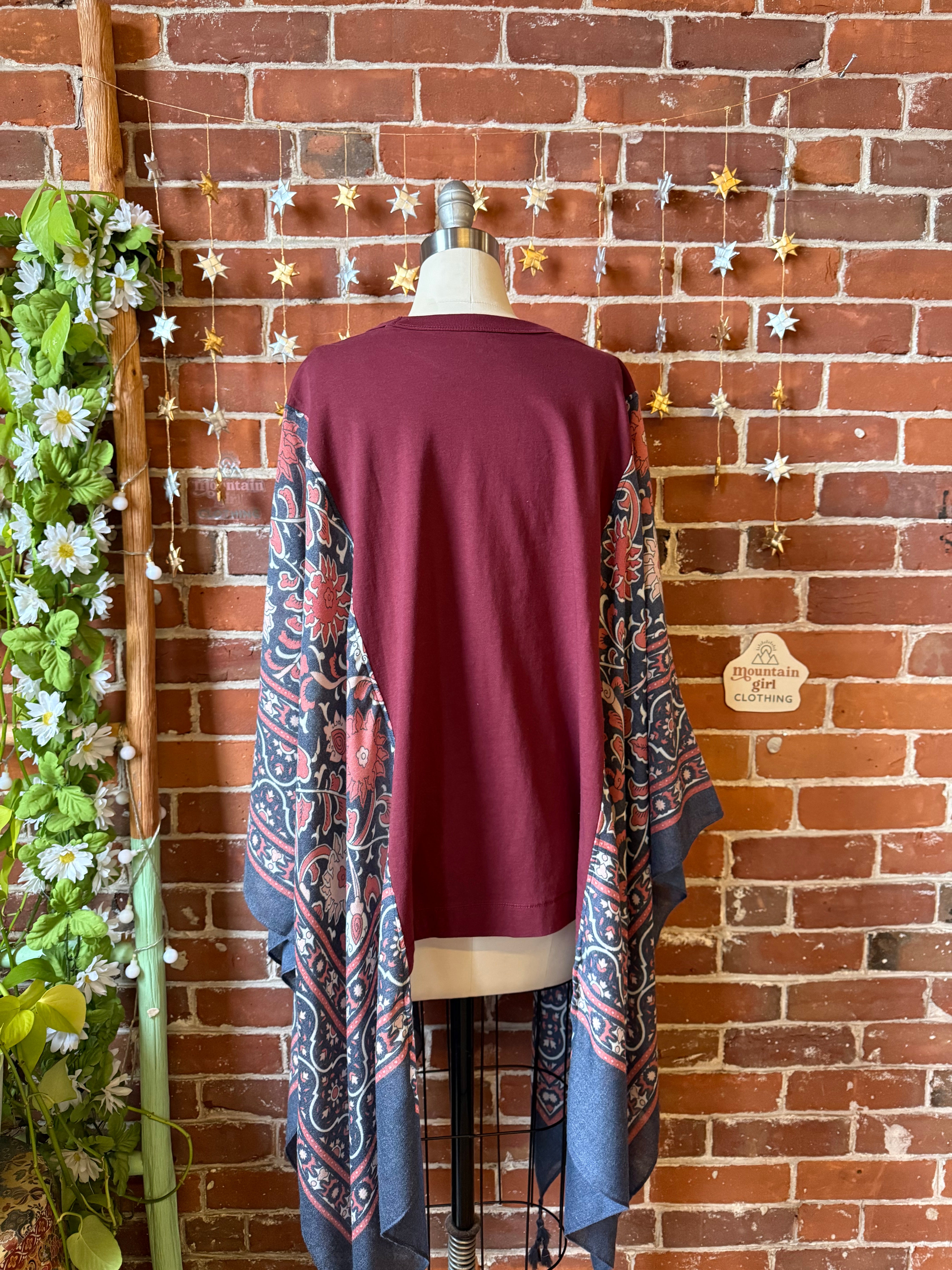 Say Hello to Boho in this unique flowy tshirt top. Made from an upcycled tshirt and featuring soft, flowy fabric sides in a botanical print.  Perfect for concerts or everyday wear.