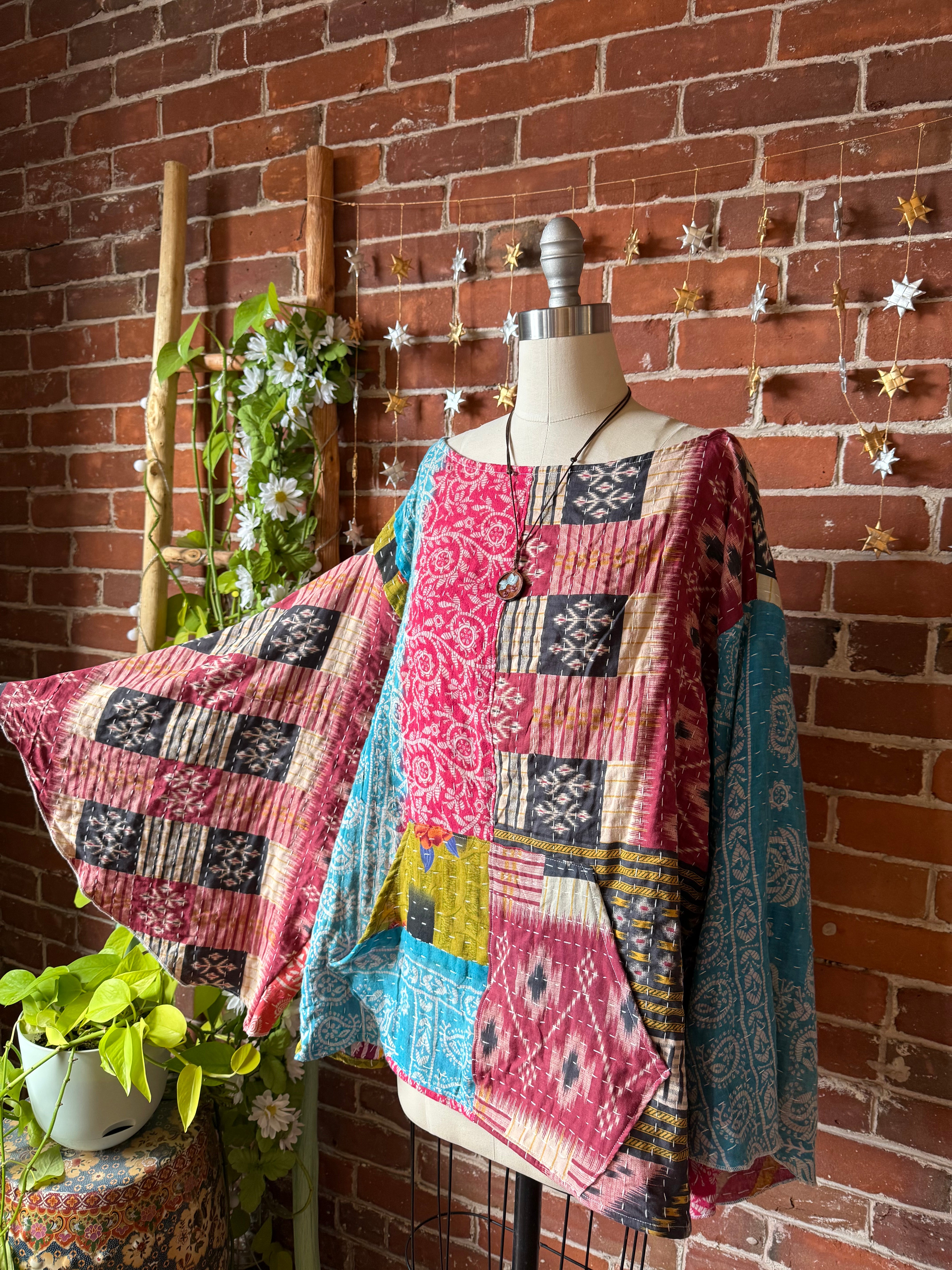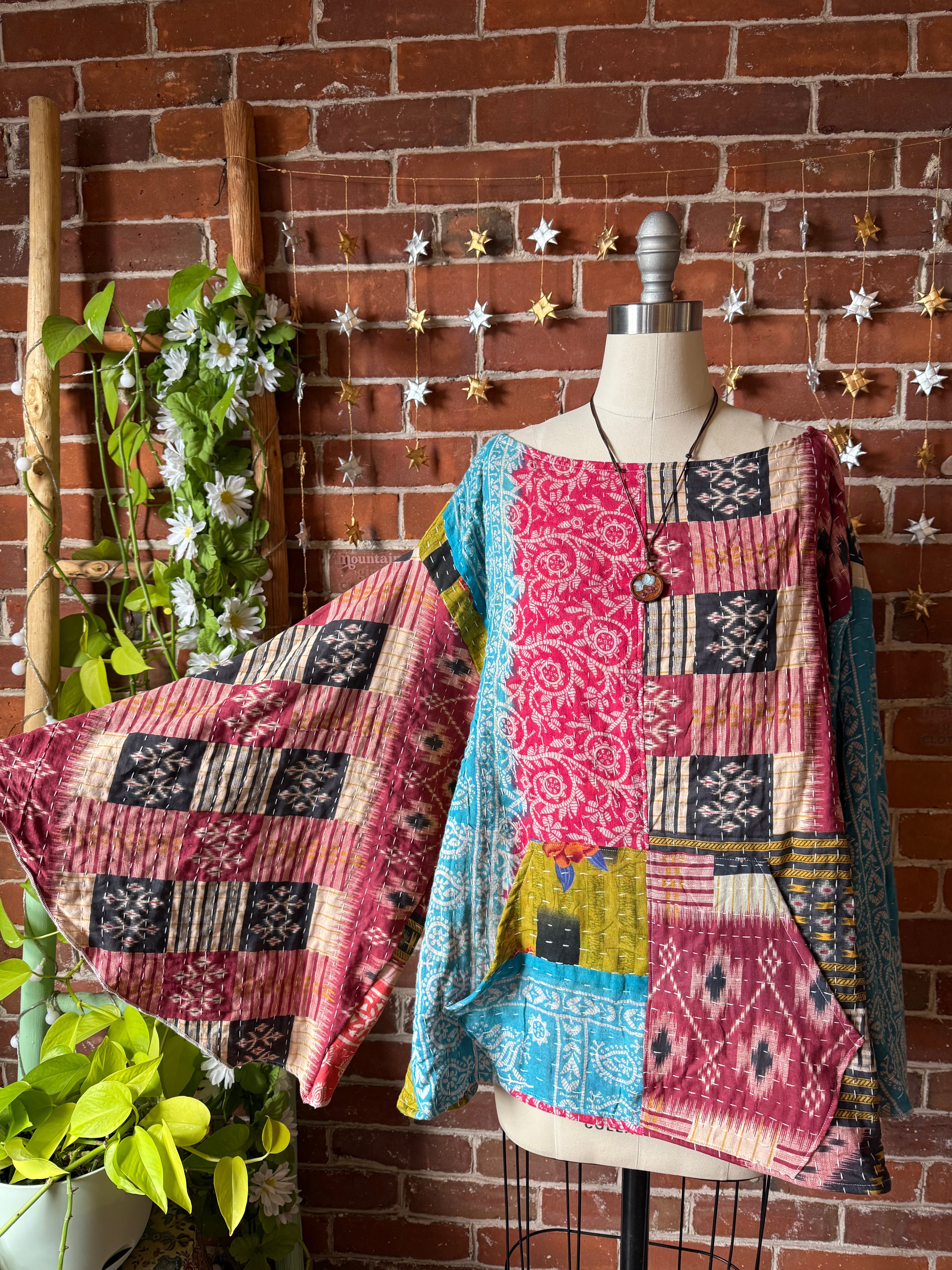 Get ready to channel your inner bohemian goddess with our Free Size Into The Mystic Kantha Pullover Top. Handcrafted from one-of-a-kind kantha fabric, this top features a relaxed fit and bell sleeves for an effortless boho chic look. The pullover style makes it easy to throw on and go, perfect for those days when you want to look stylish without putting in too much effort.