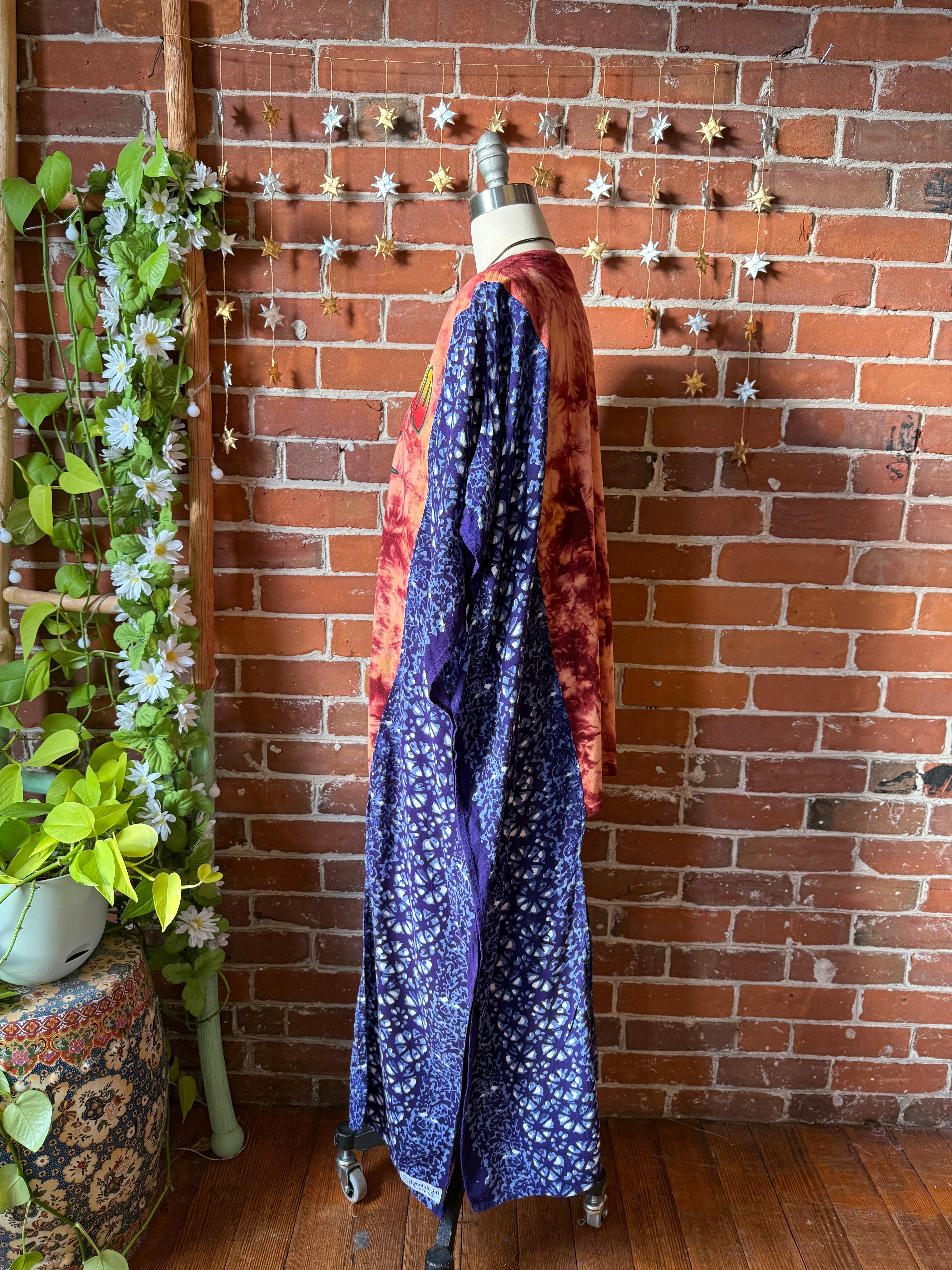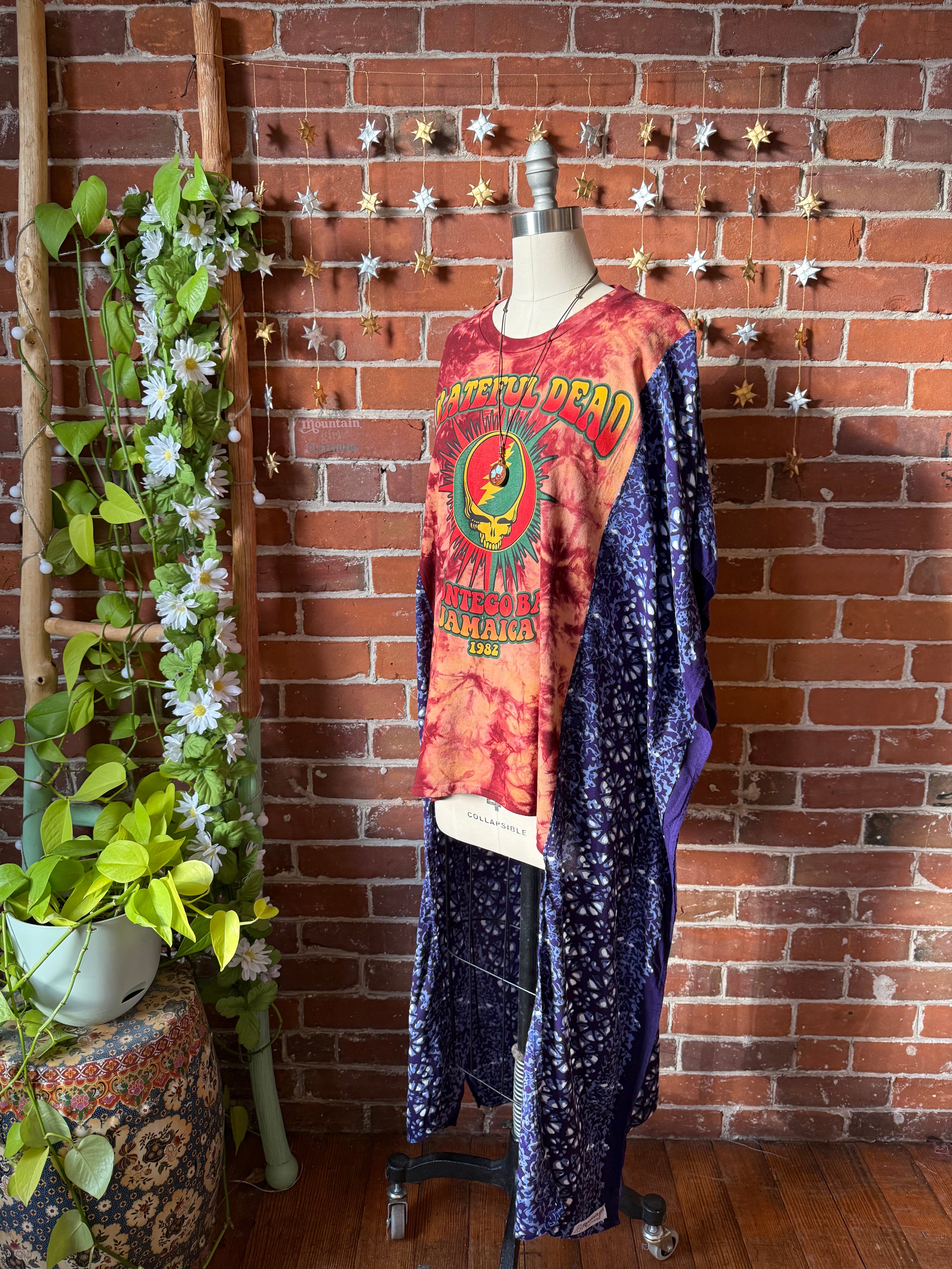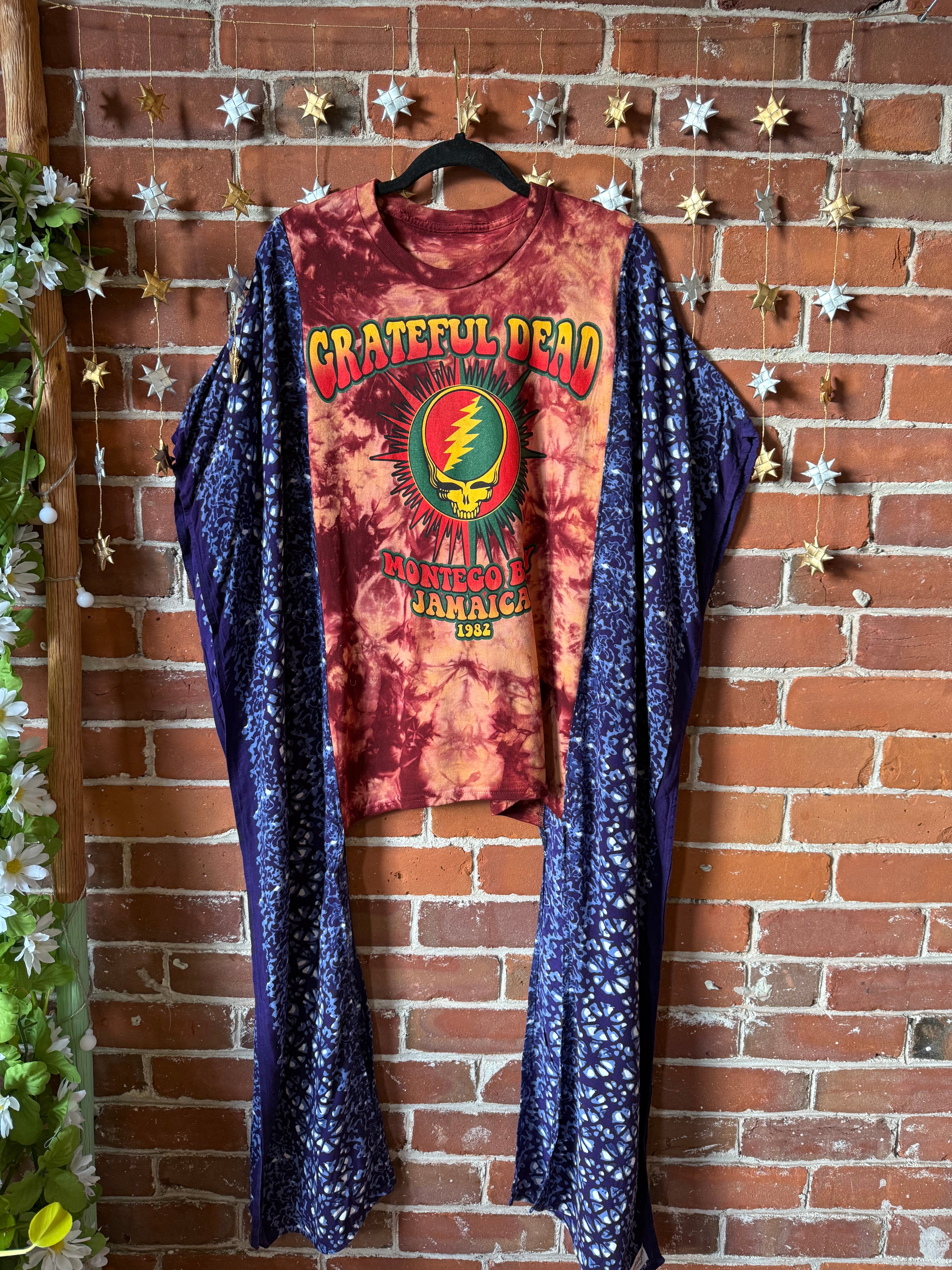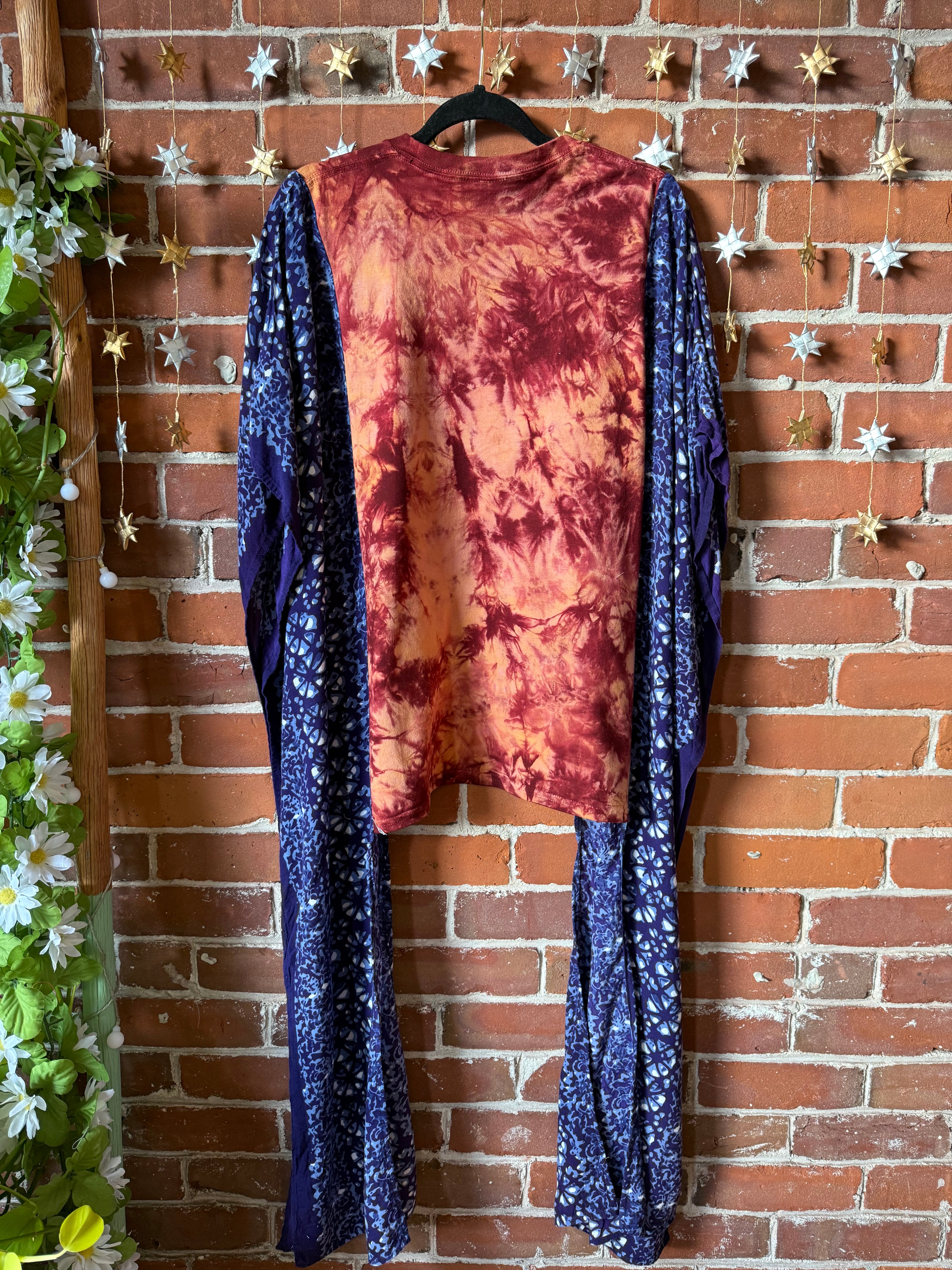 Say Hello to Boho in this unique flowy tshirt top. Made from an upcycled tshirt and featuring soft, flowy fabric sides in a batik style print. Perfect for concerts or everyday wear.