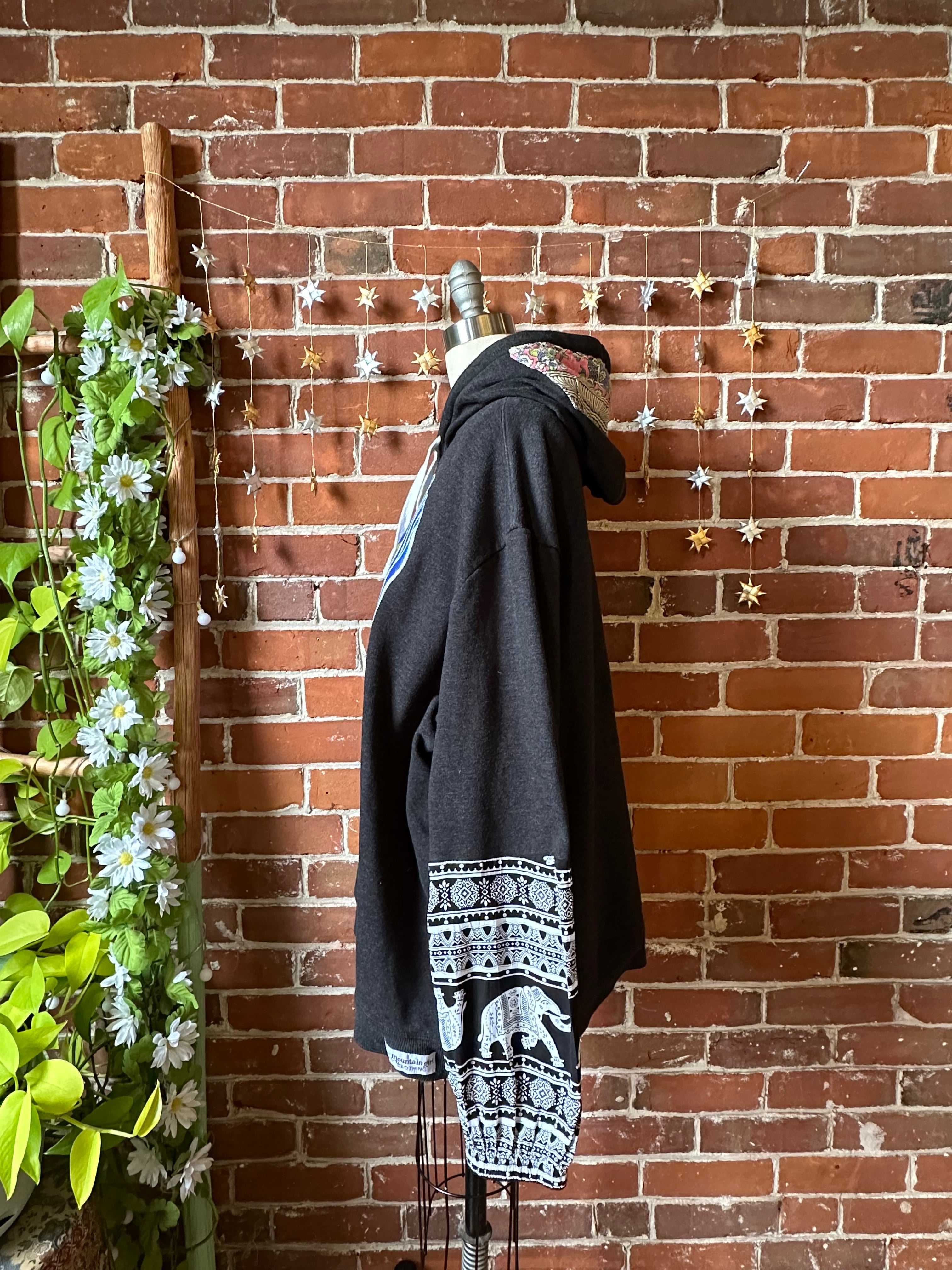 Upcycled soft hoodie with sleeve cuff details and kantha on the hood