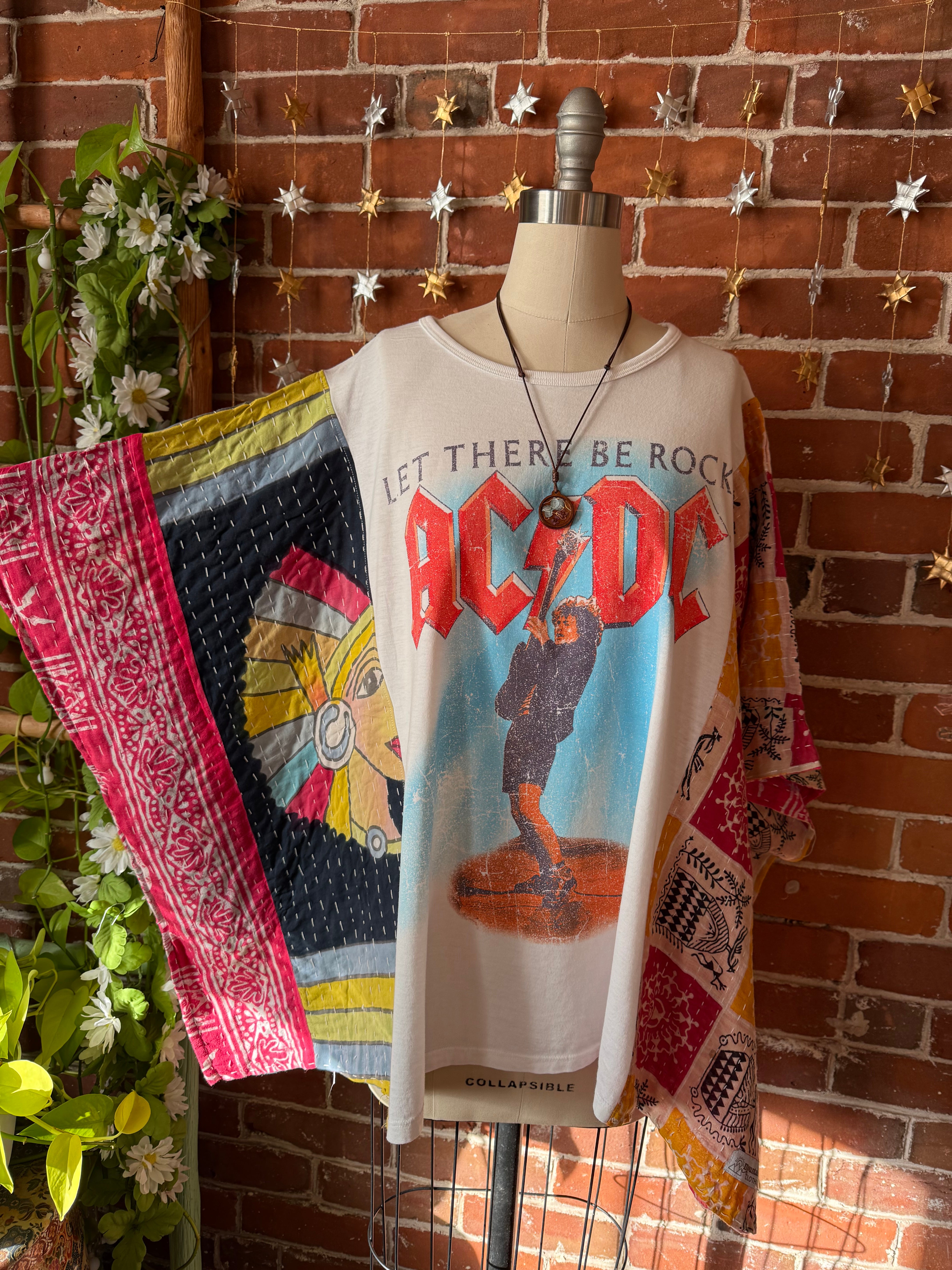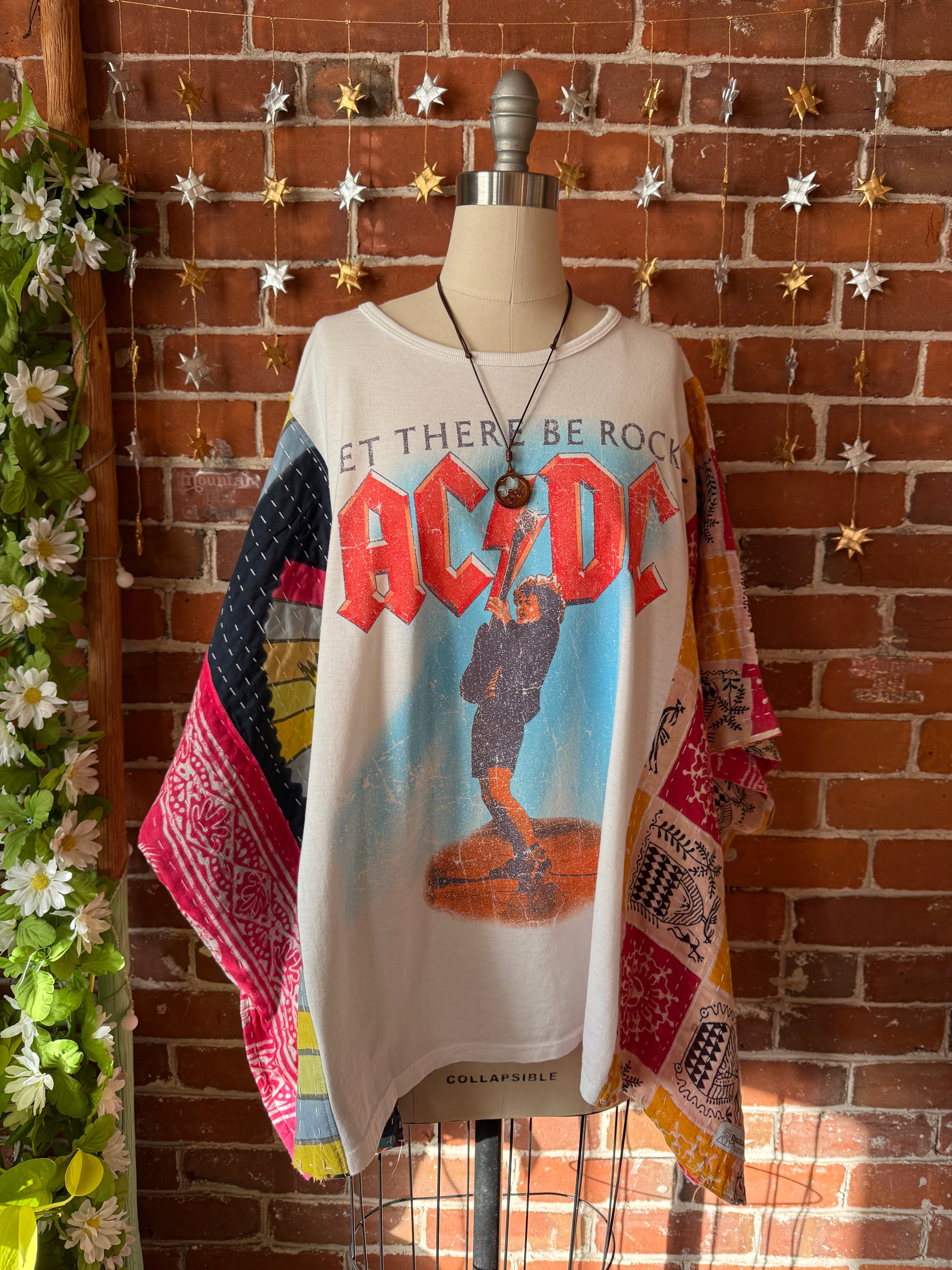 Upcycled poncho tee and kantha fabric at the sides, flowy fit with armholes at the sides.