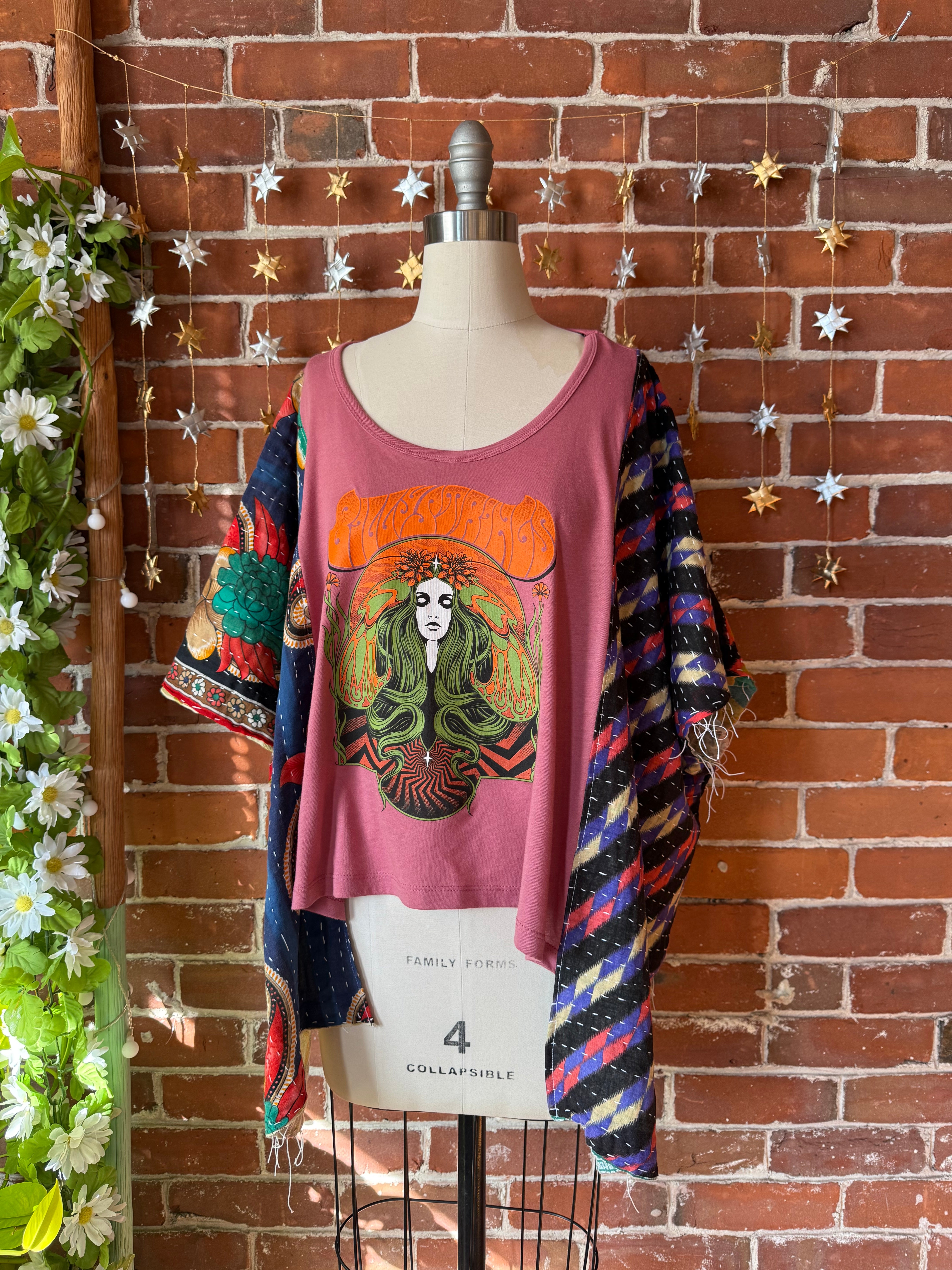 OOAK Autumn Collection- Upcycled Billy Strings Inspired Cropped Kantha Hi Lo Poncho Tee