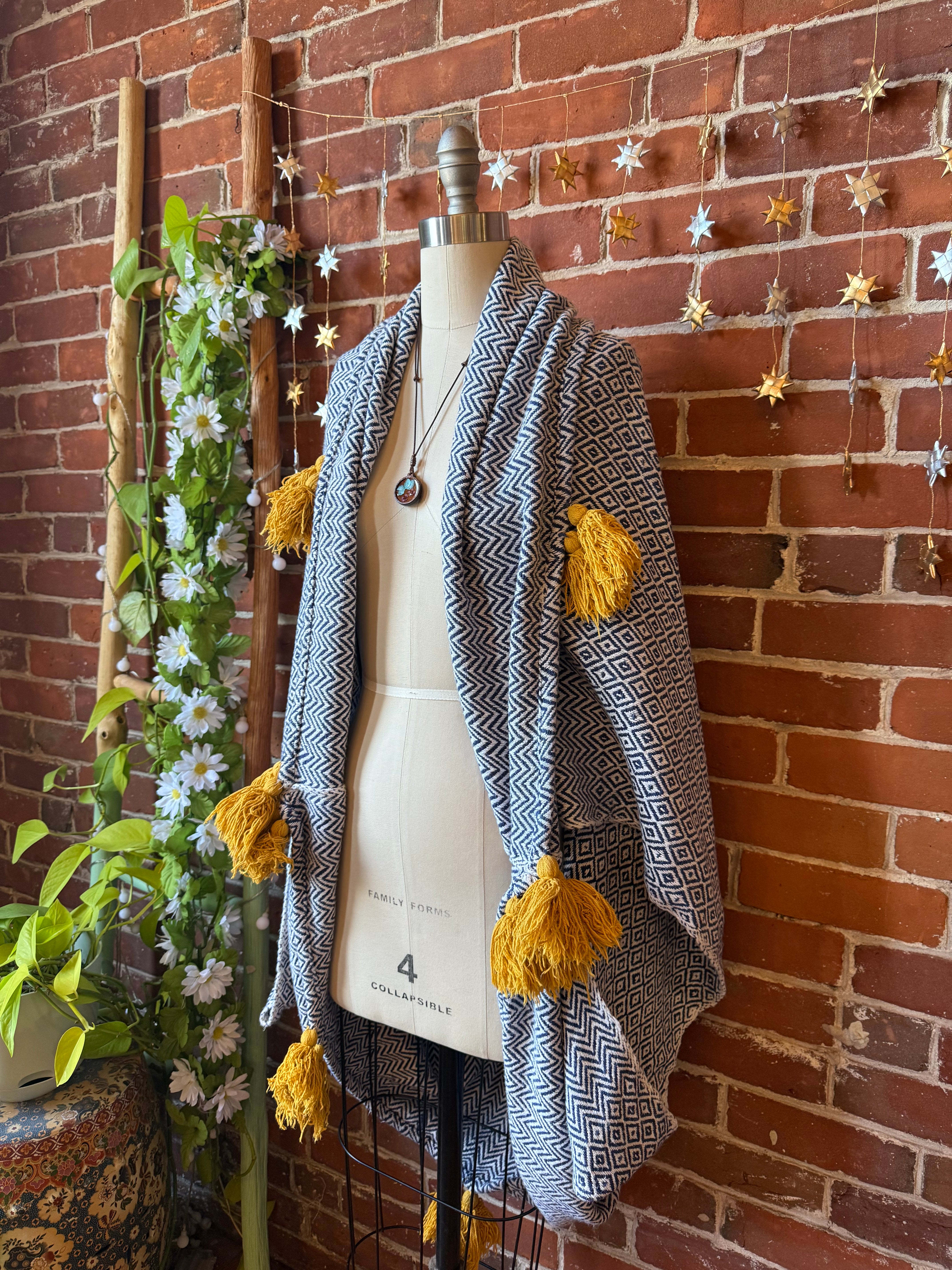 Wrap yourself in versatile style with this upcycled cocoon shawl. The cocoon style wrap shawl features armholes at the sides for easy wear with a bohemian touch. Handmade with upcycled materials.