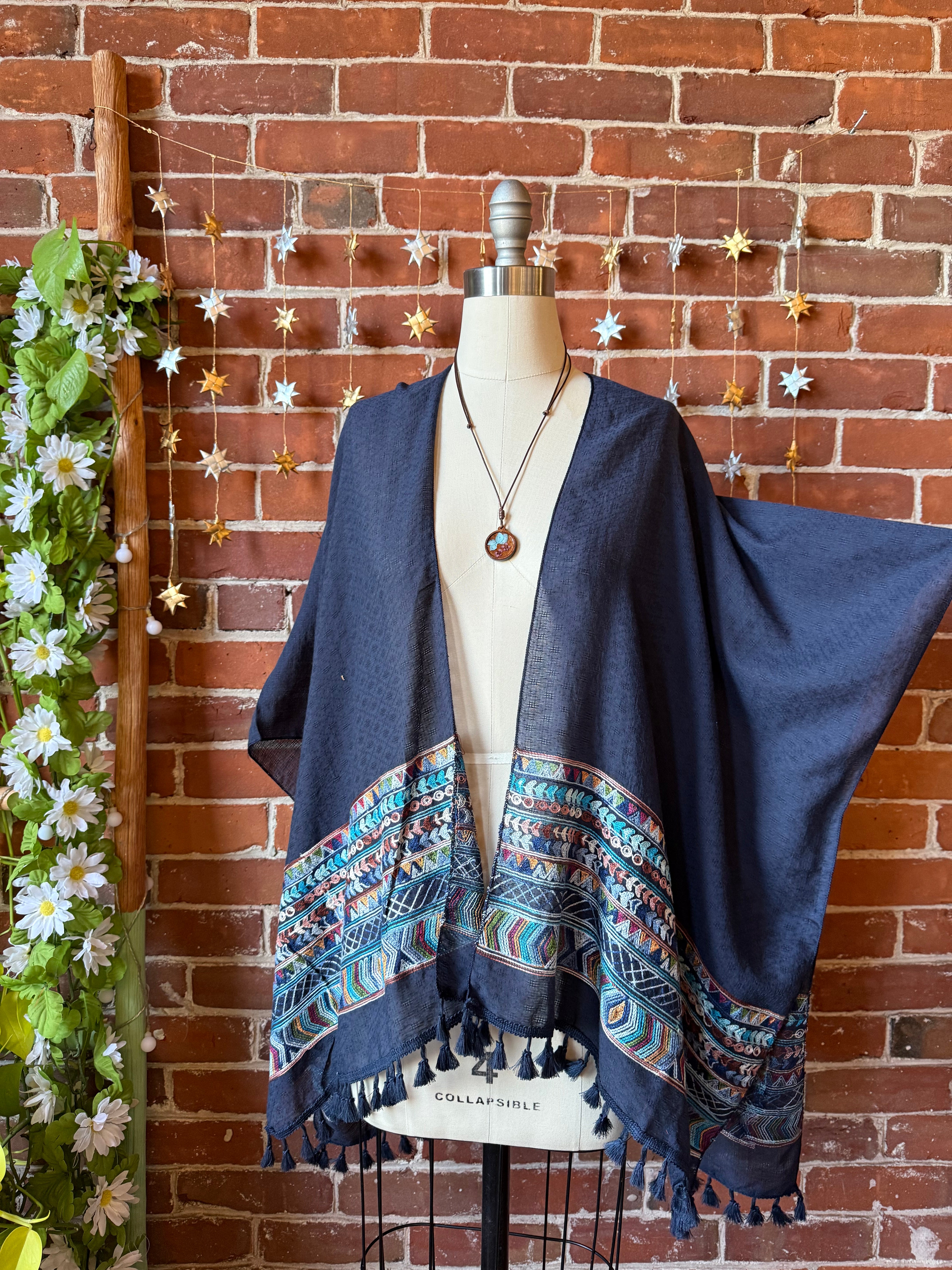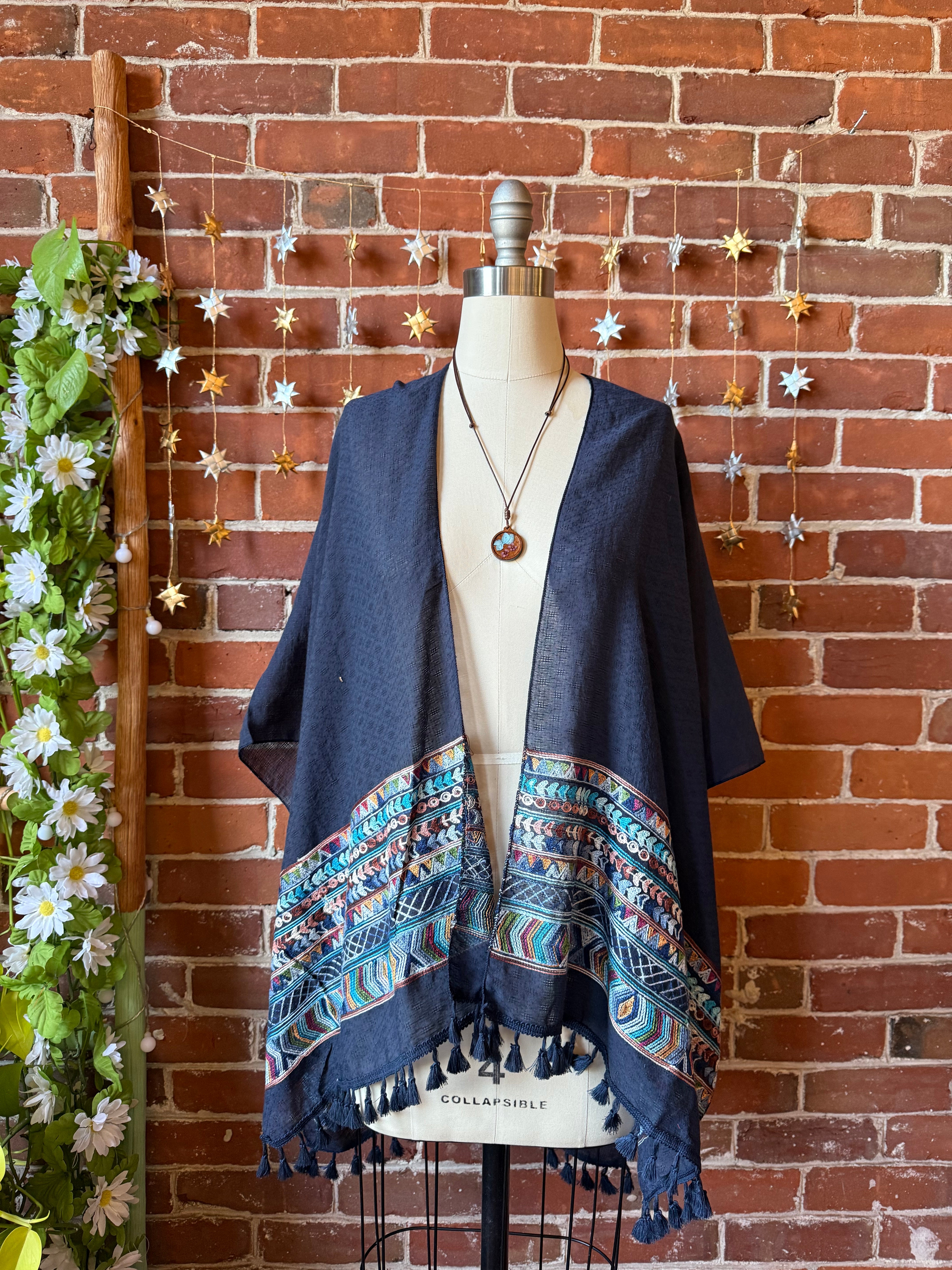 Upcycled lightweight kimono with embroidered and tassel detail