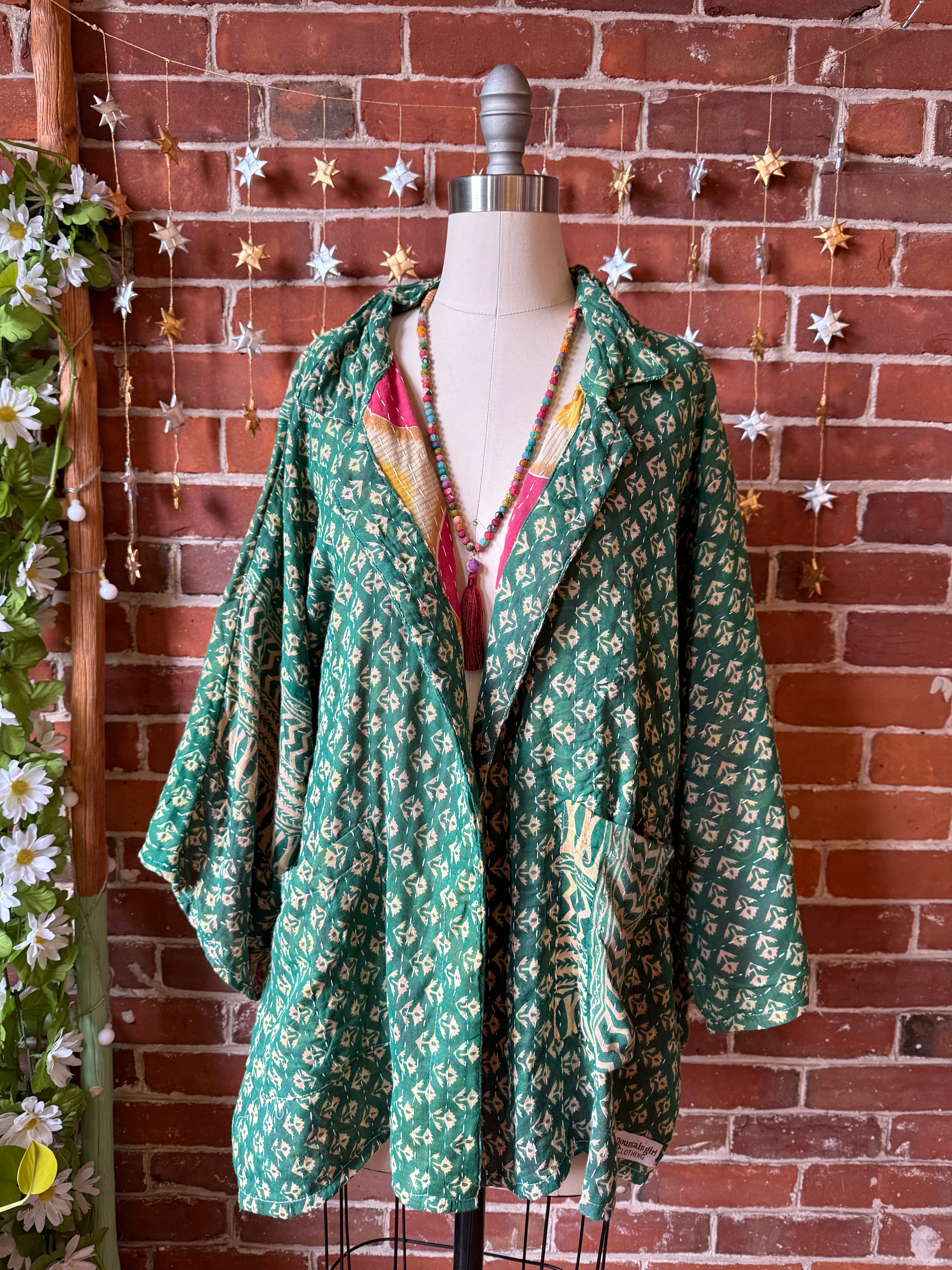Soft lightweight Kantha jacket with collar and pockets at each side.